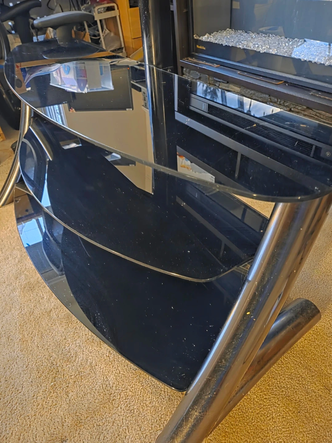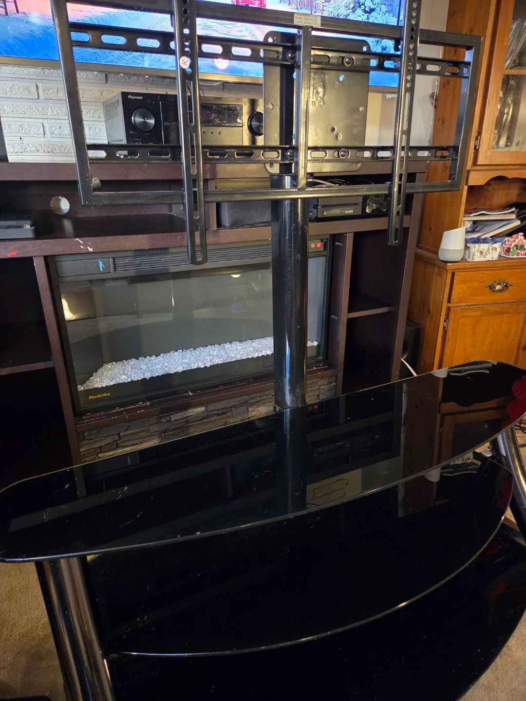 Selling a sleek black glass TV stand with a built-in mount! It's in great condition and would look fantastic in any living room. It features multiple shelves for media components and a sturdy mount for your TV. Perfect for saving space and adding a touch of modern style to your home entertainment setup