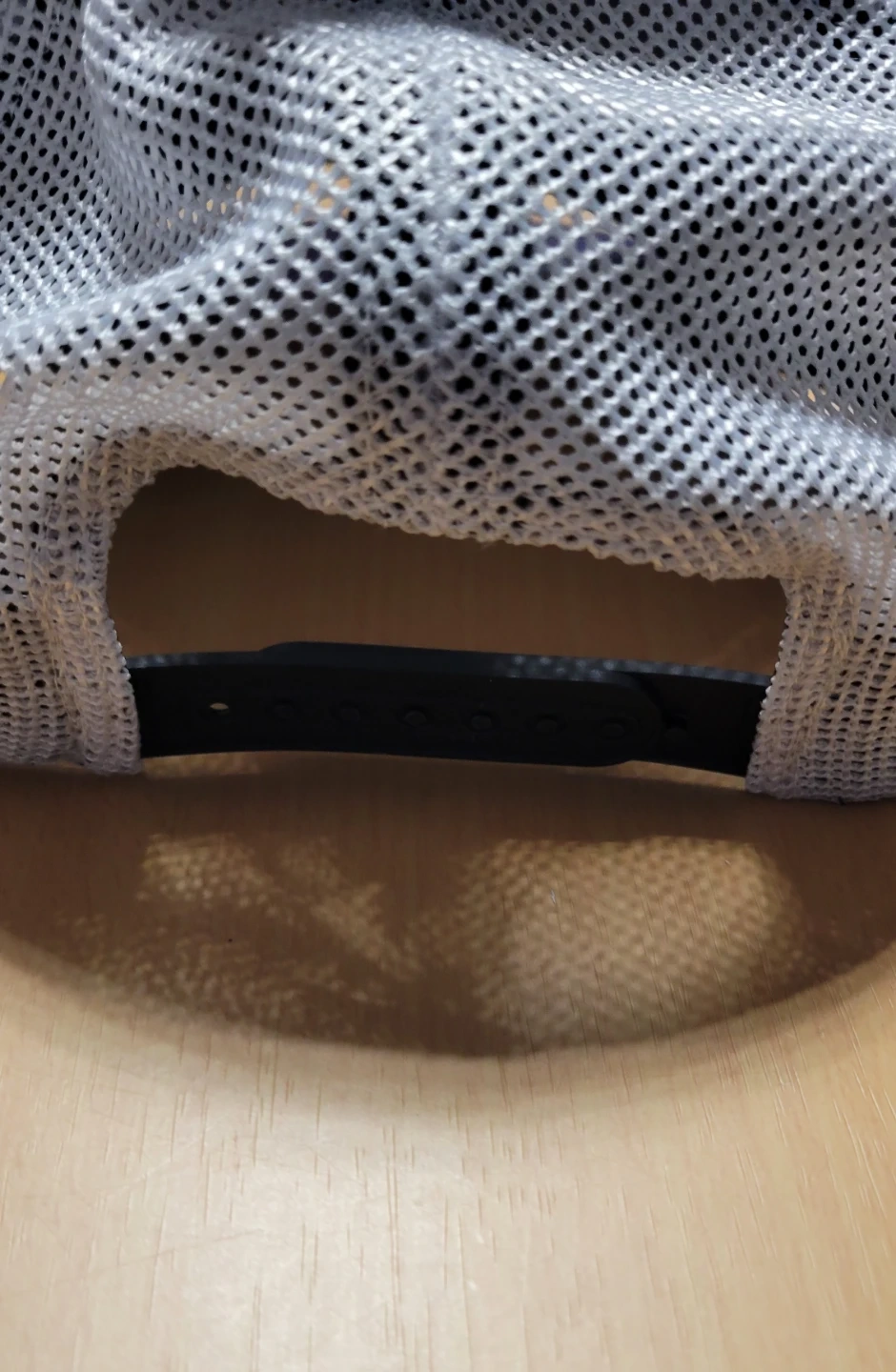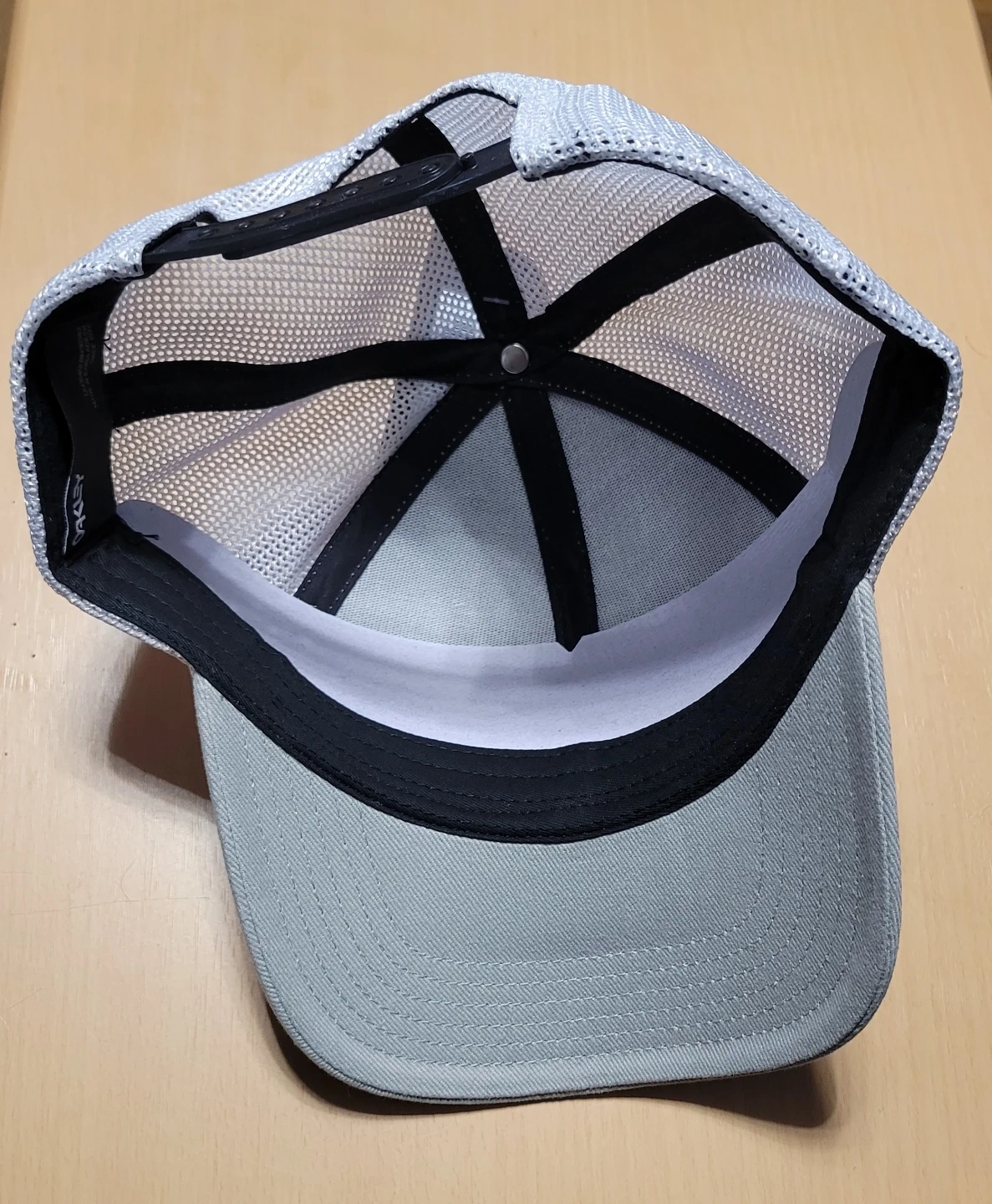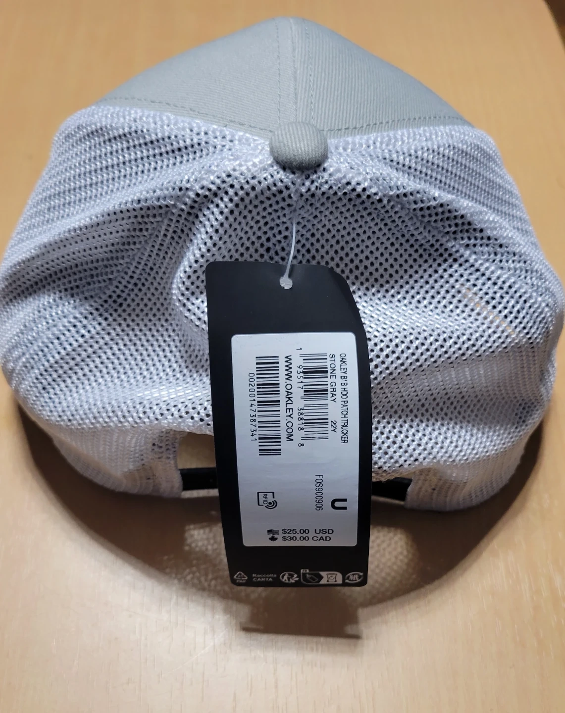 This is a new Oakley High Definition Optics trucker hat in stone gray. It's a stylish and comfortable hat perfect for everyday wear.