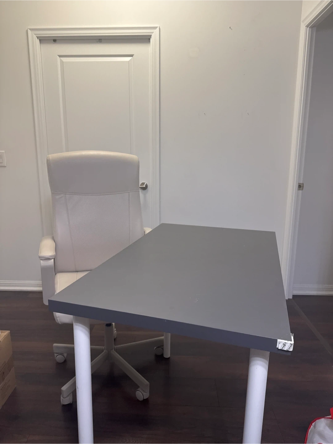 Selling a used office desk and chair set. The desk has a grey top and white legs, while the chair is a light cream colour. It's a great setup for a home office or study space!
