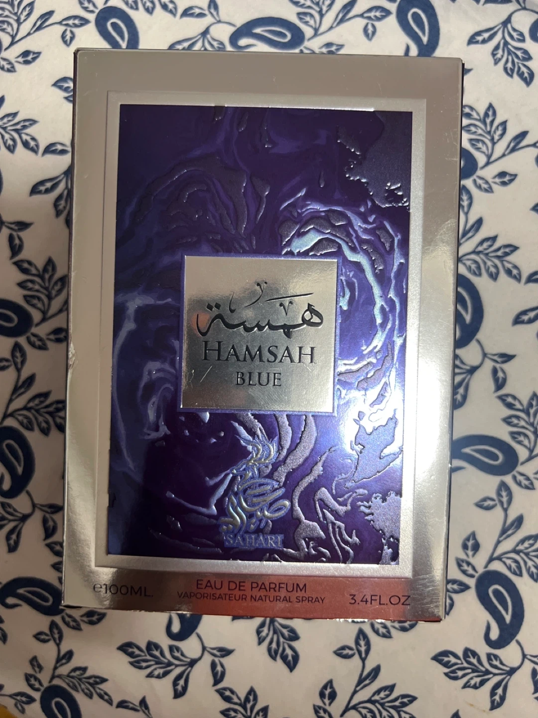 Selling a bottle of Hamsah Blue Eau de Parfum. It's a 100ml bottle with a vaporisateur natural spray. The box is included, and the bottle is 3.4 fl.oz.