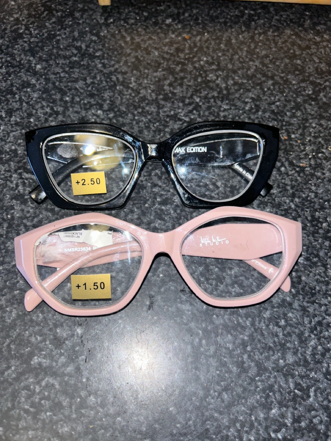 Selling two pairs of reading glasses! One is a black frame from Max Edition with +2.50 magnification. The other is a pink frame from Nicole Miller Studio with +1.50 magnification
