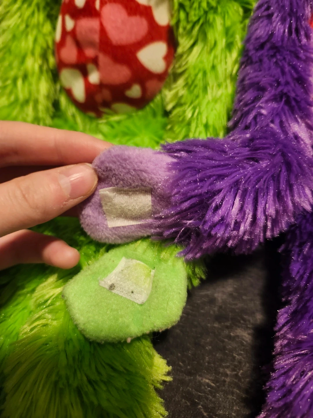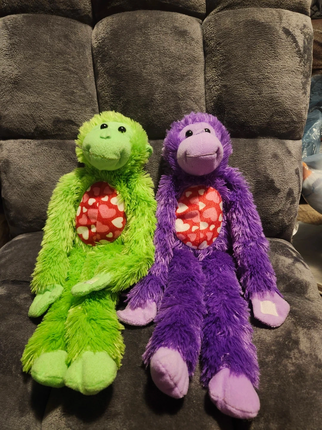 Selling two adorable plush monkeys! One is a vibrant green and the other is a lovely purple. They both have a heart design on their chests. They have velcro hands that attach and dettach!