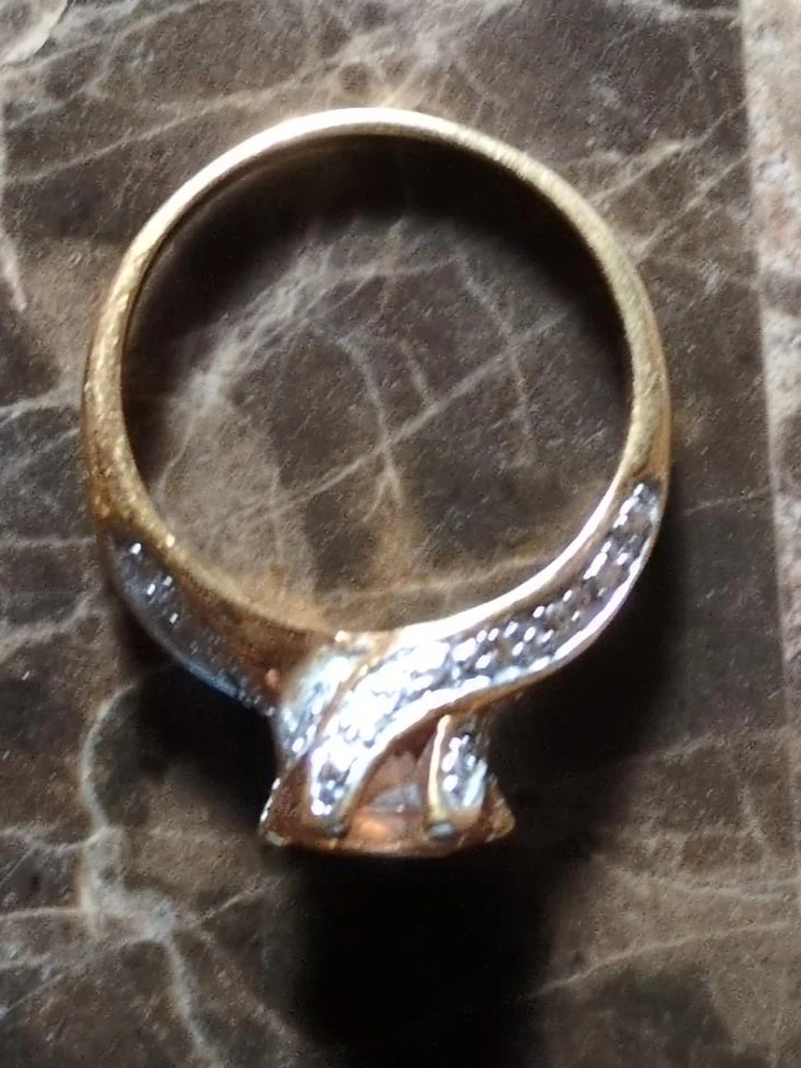Here's a gold ring featuring a gemstone. It has a unique design with some detailing around the stone setting. The ring appears to be well-maintained and ready to add a touch of elegance to your collection