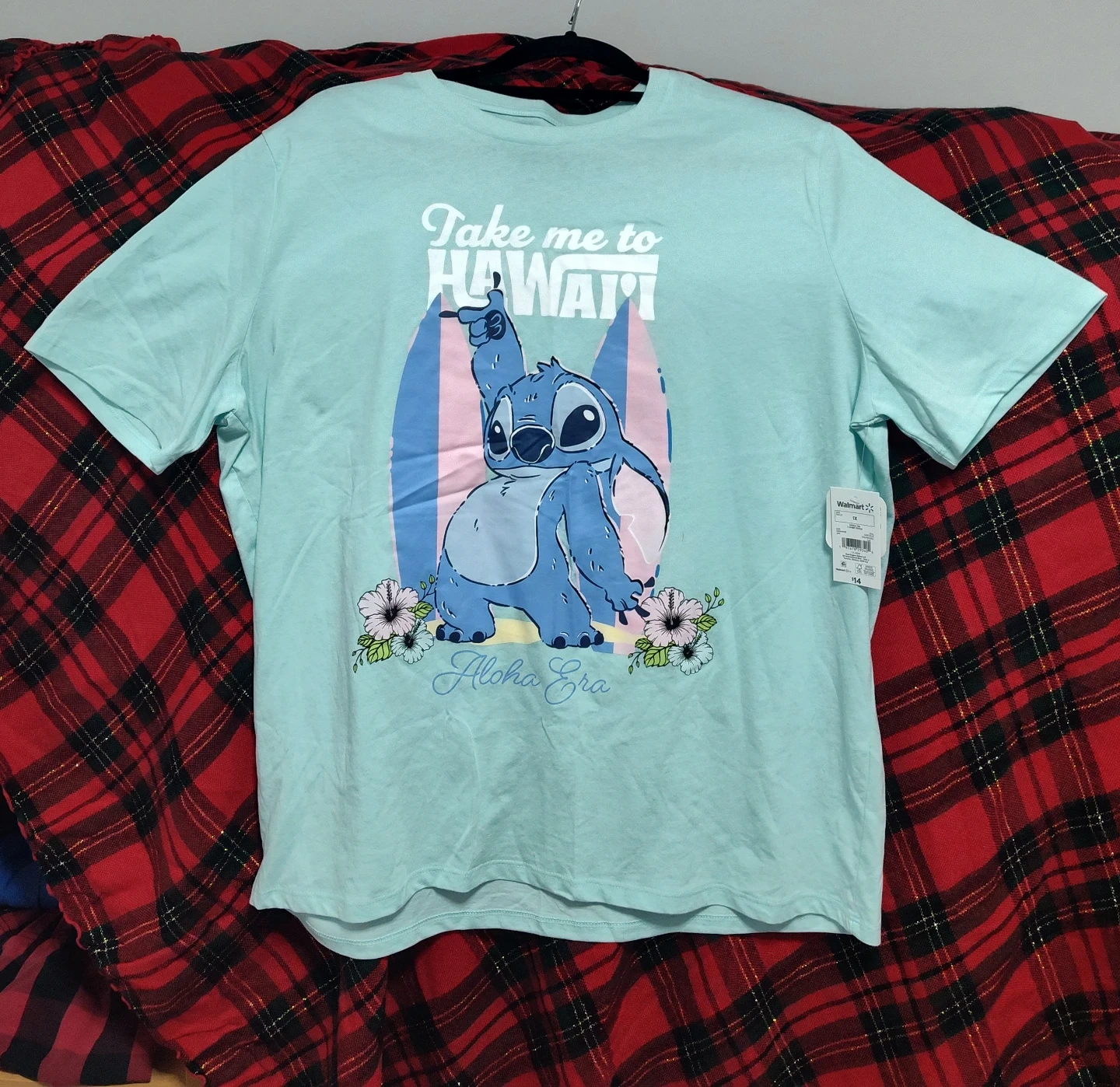 Selling a cute Disney Stitch T-shirt! It says 'Take me to Hawaii' and features Stitch with some flowers. The size is 1X and it's a lovely light blue colour. Perfect for any Stitch fan!