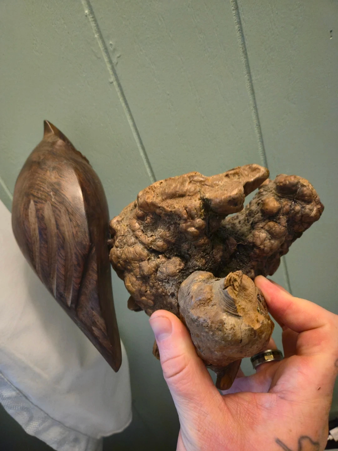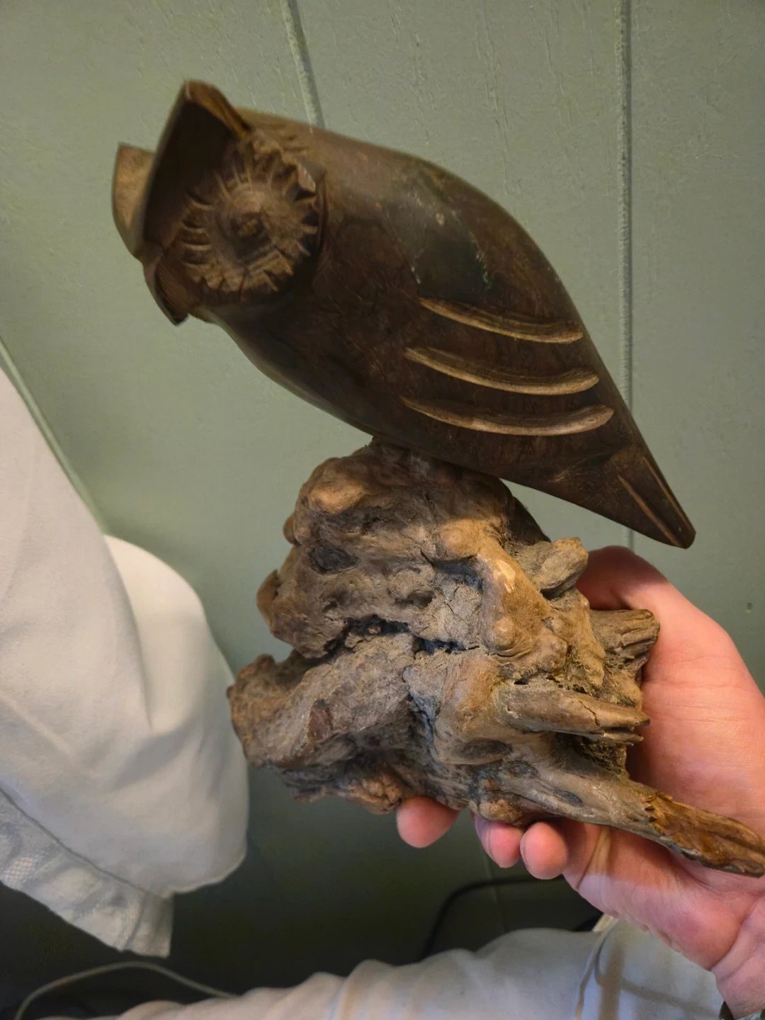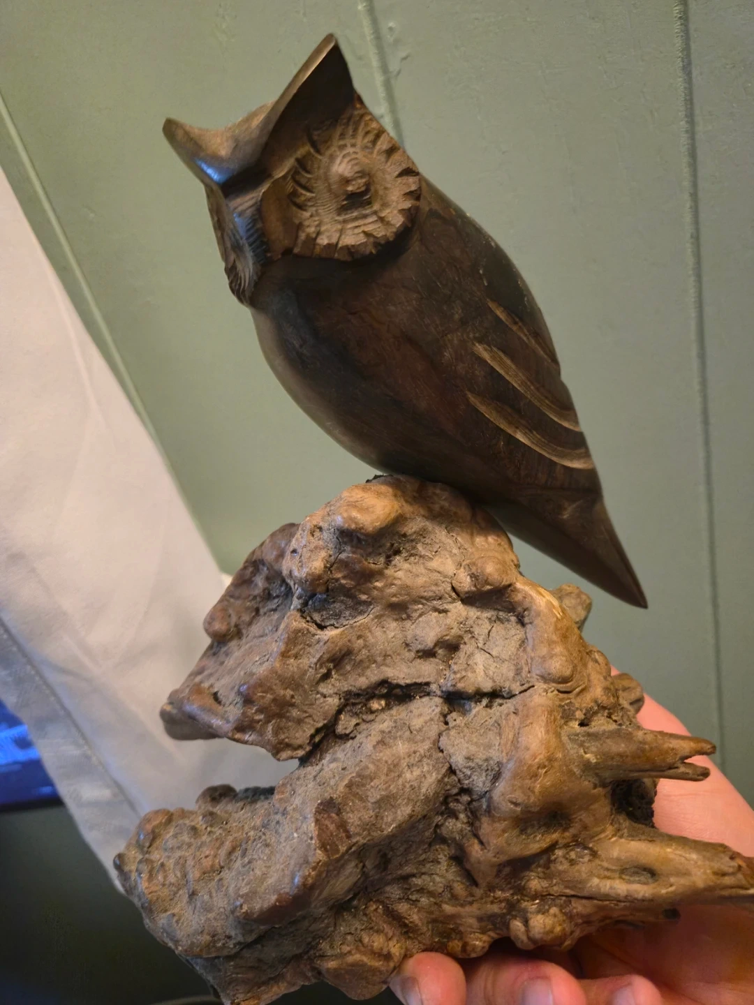 Wooden Owl Sculpture on Driftwood Base