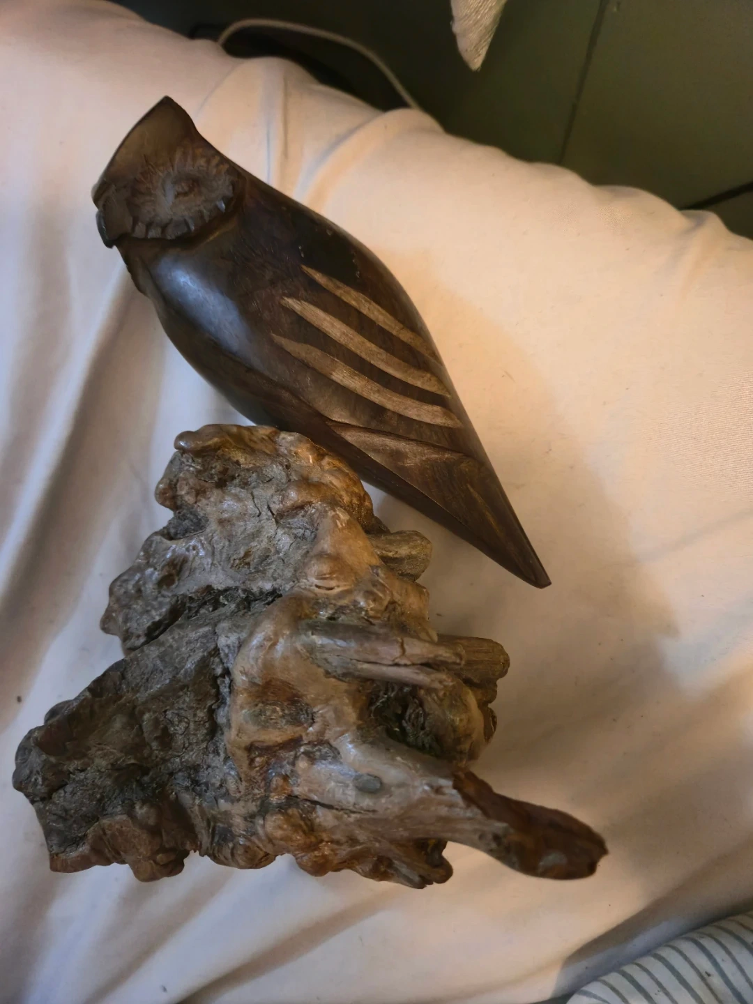 Here's a unique wooden owl sculpture perched on a piece of driftwood. It's a lovely piece of art, perfect for adding a touch of nature to your home decor. The owl has a nice dark finish, and the driftwood base gives it a rustic feel!
