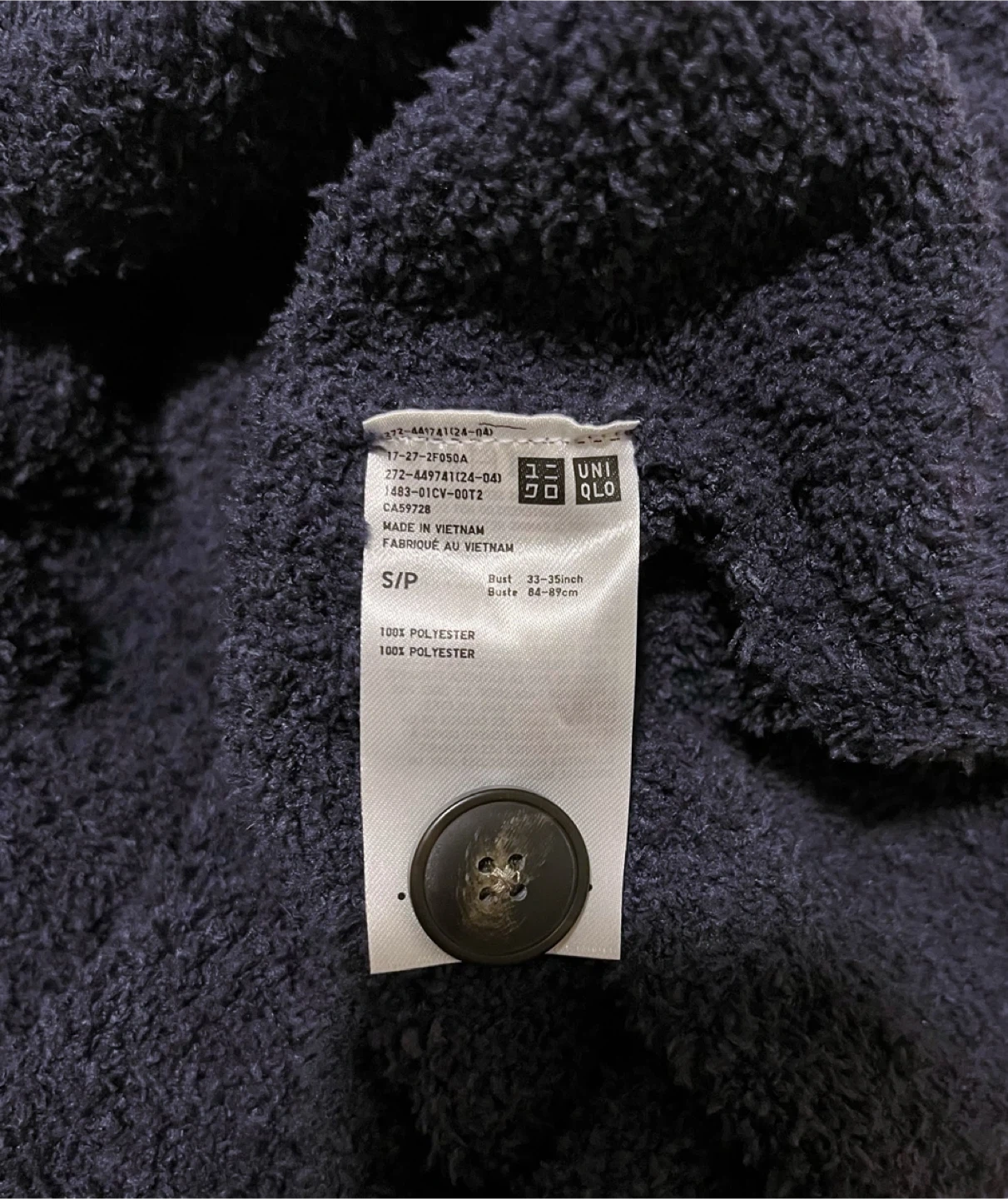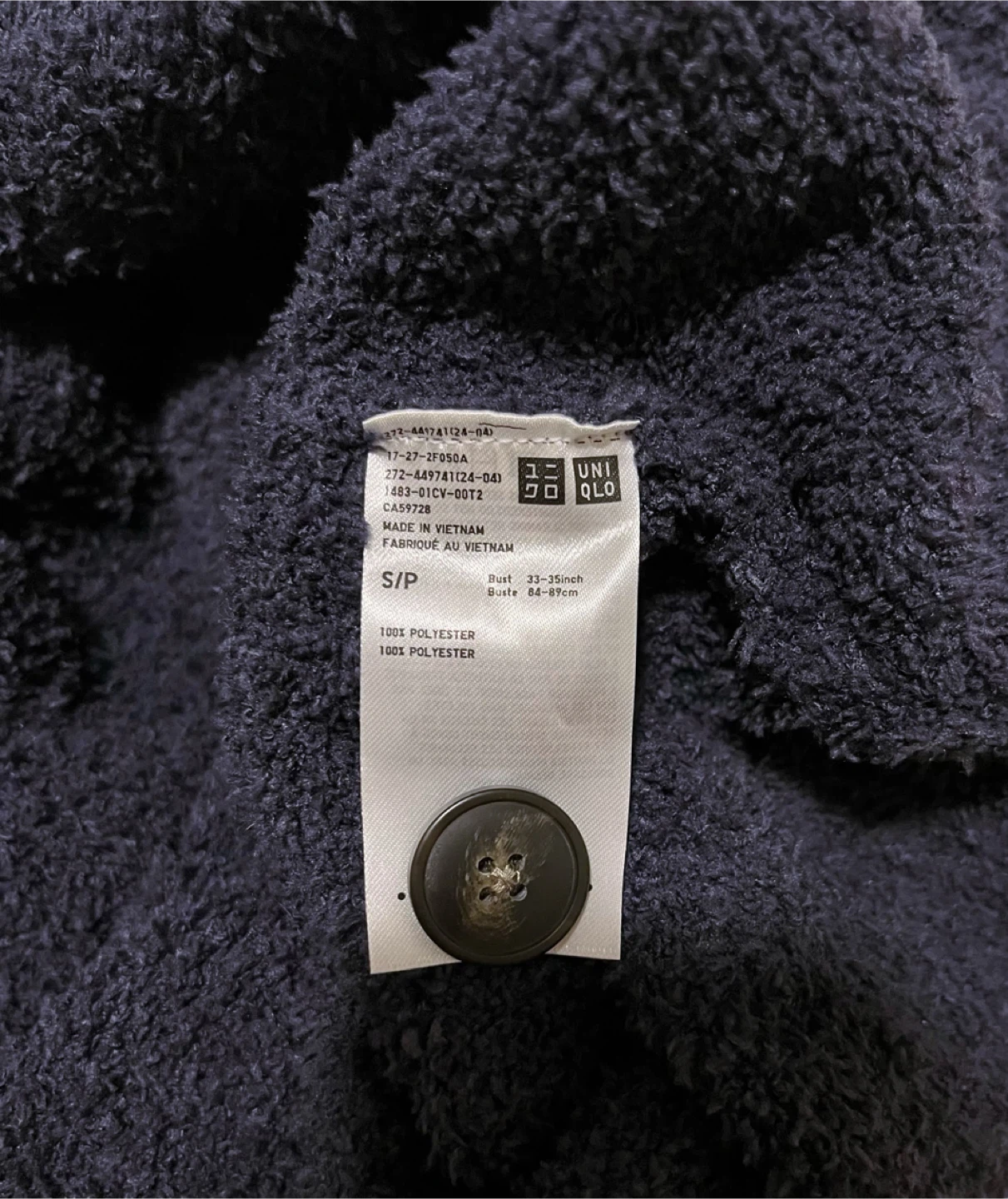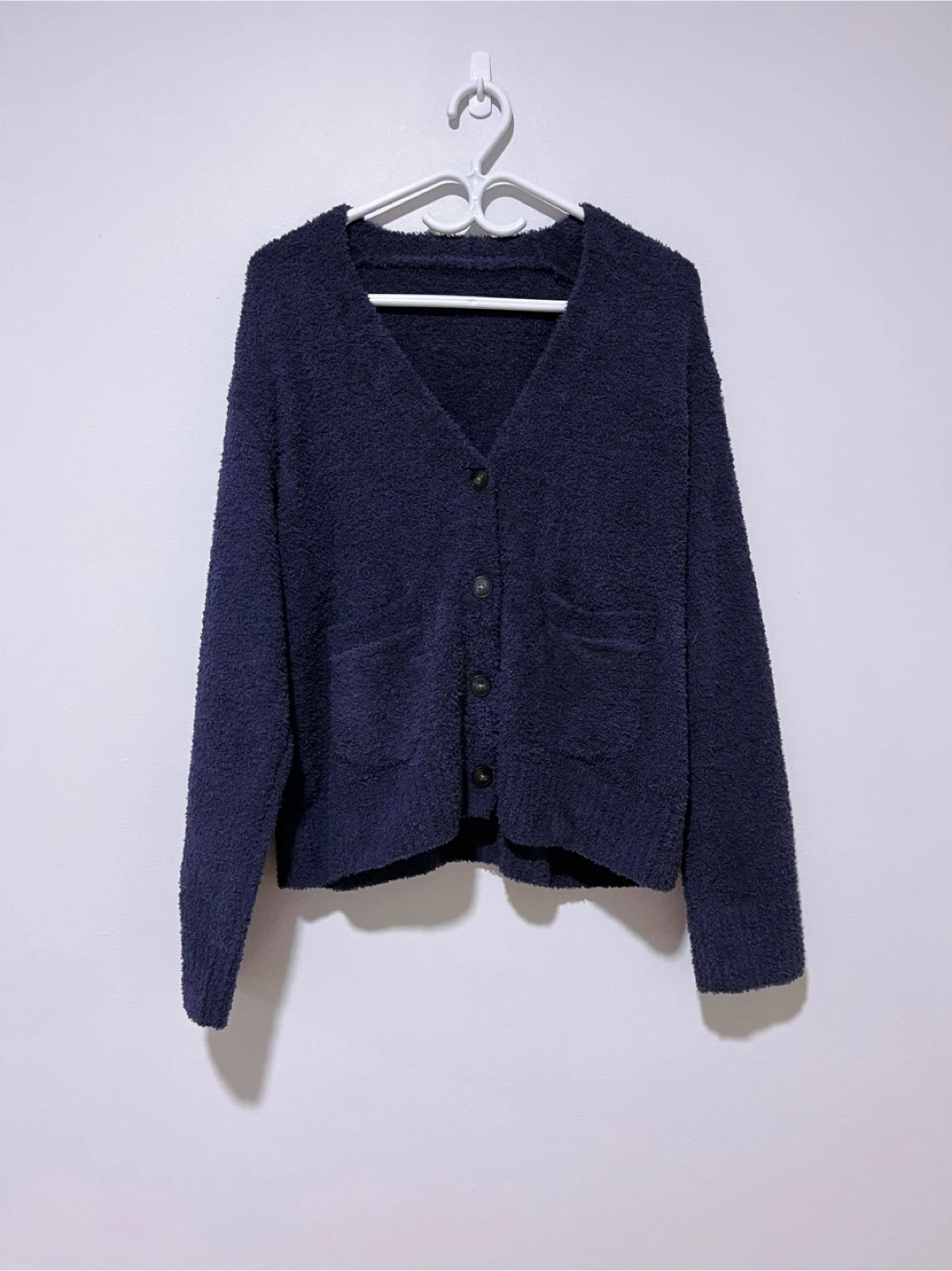 -The cardigan is a soft, navy blue