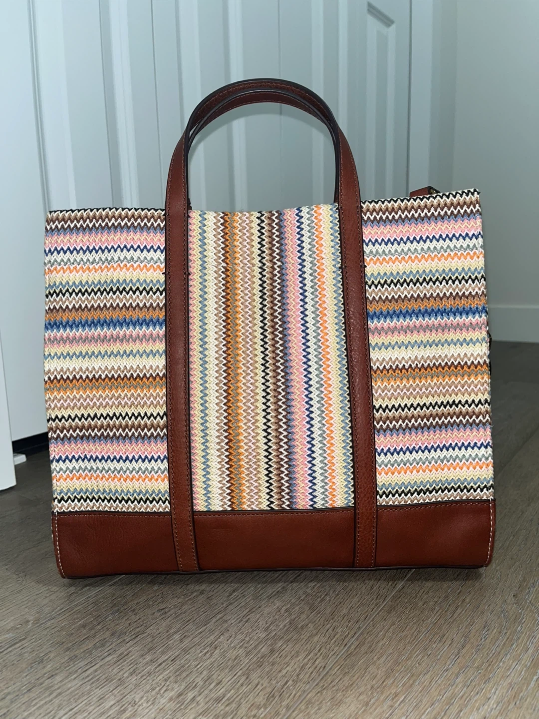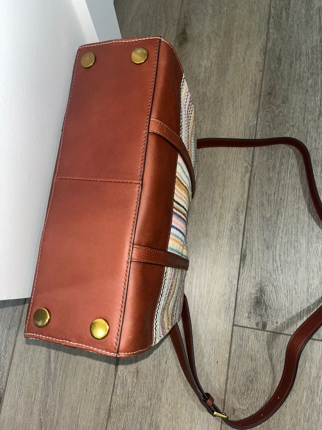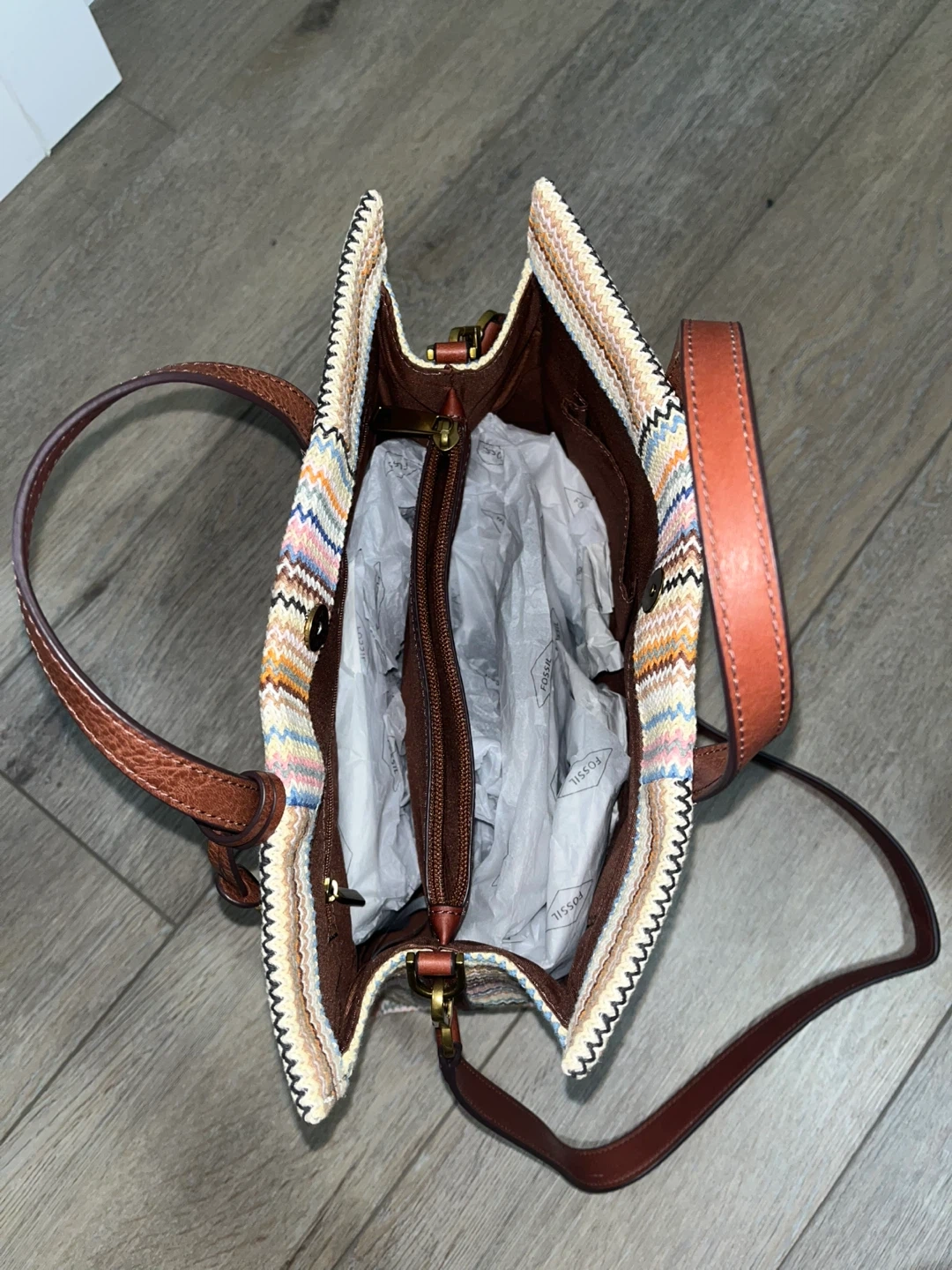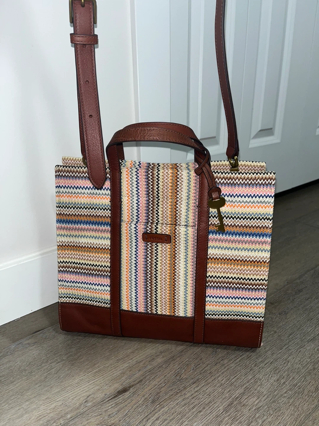 Here's a Fossil tote bag in excellent condition! It features a multi-colour design with brown leather accents. It's a stylish and functional bag for everyday use