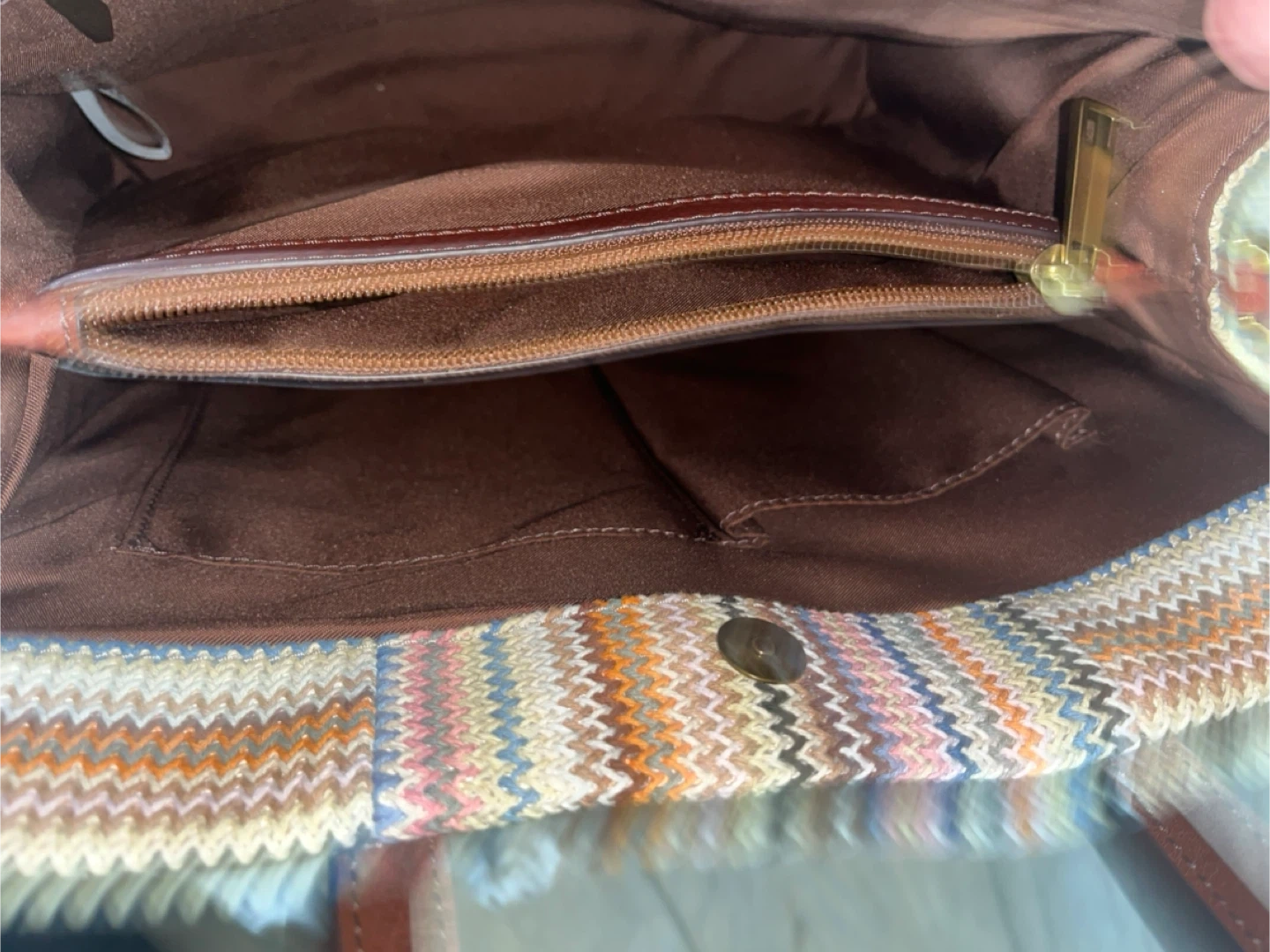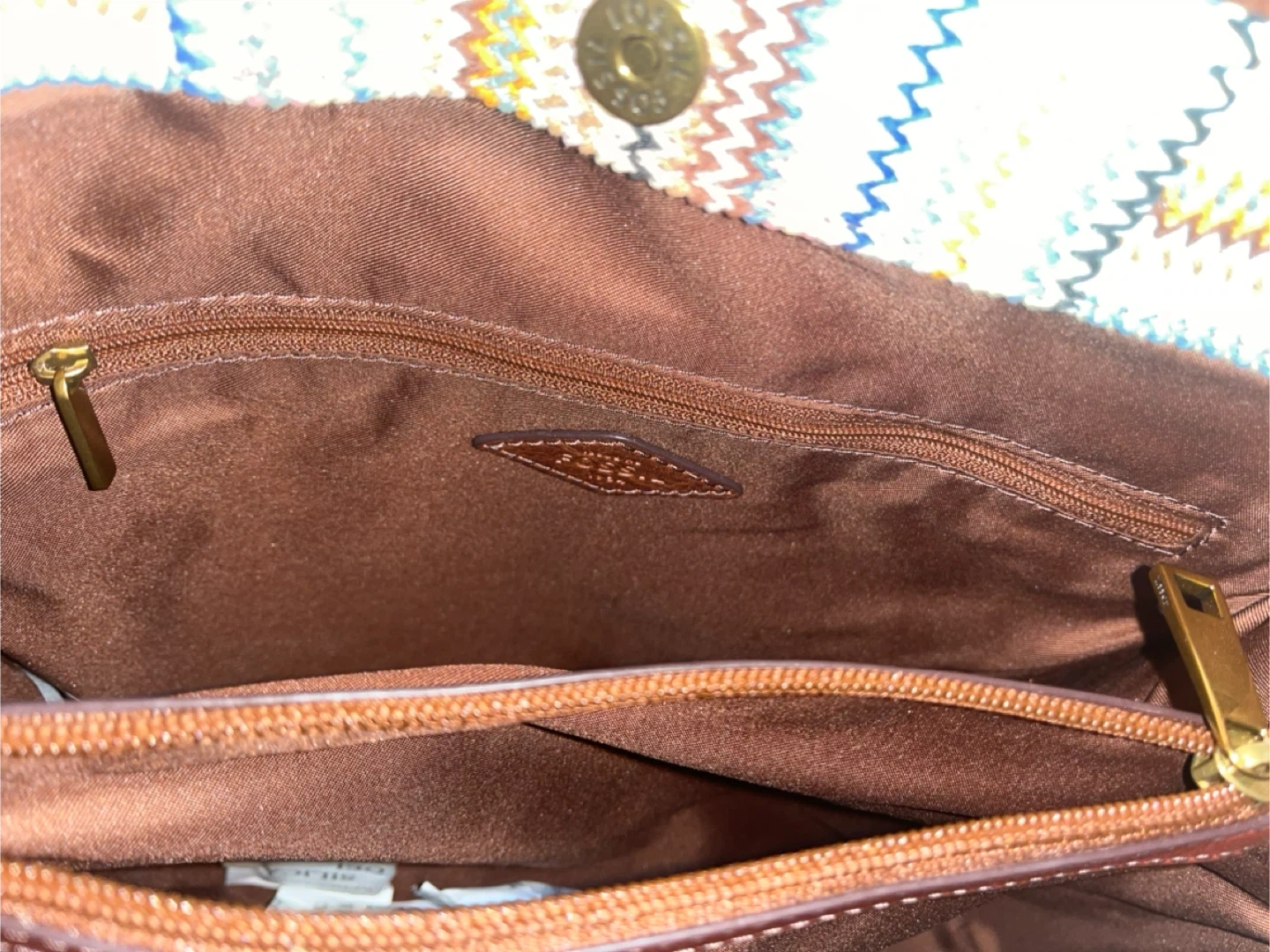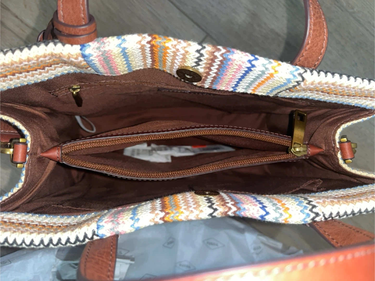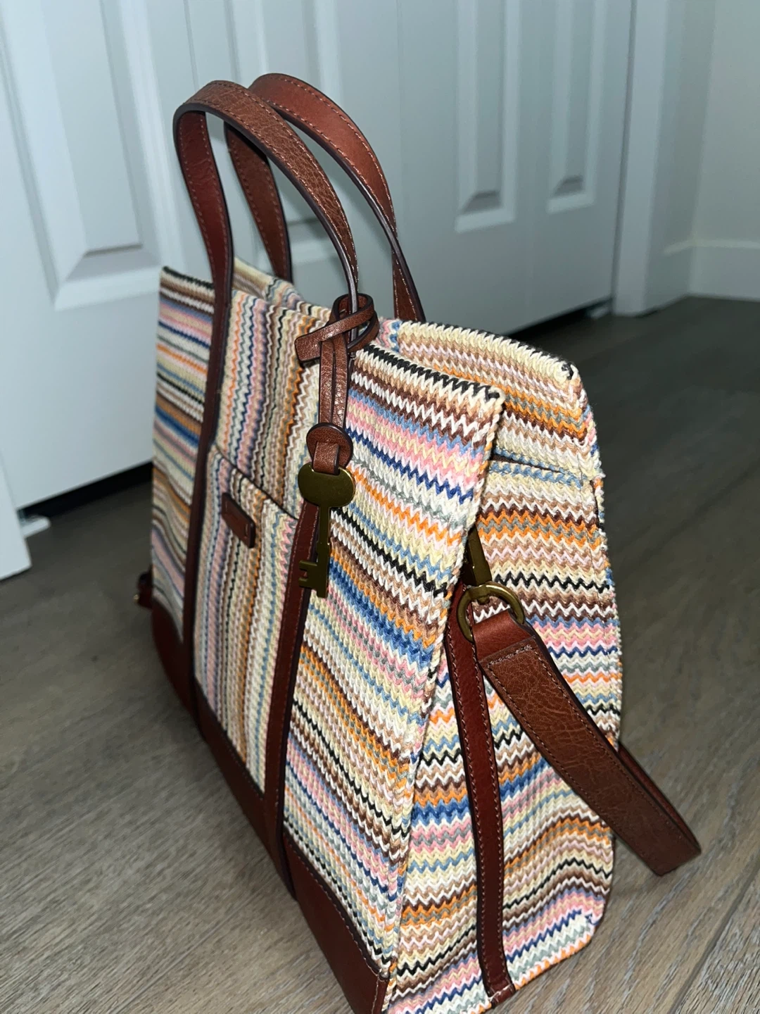 Here's a Fossil tote bag in excellent condition! It features a multi-colour design with brown leather accents. It's a stylish and functional bag for everyday use
