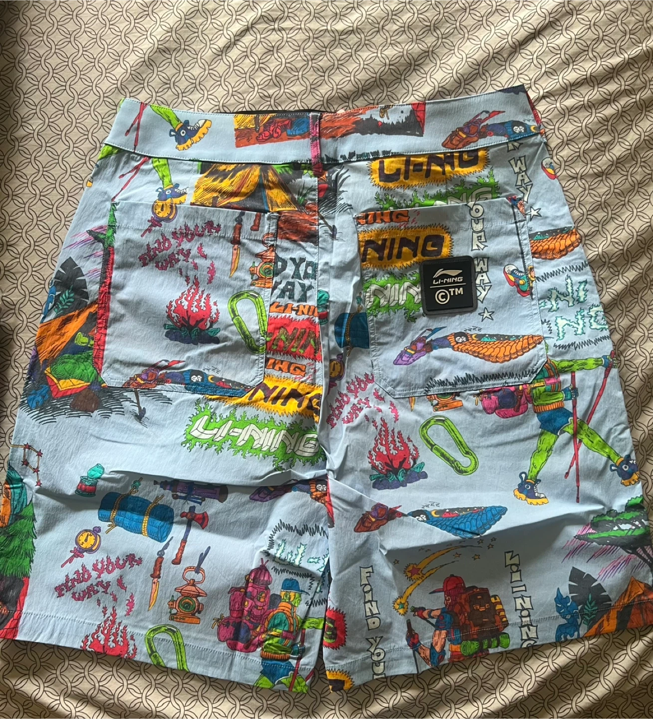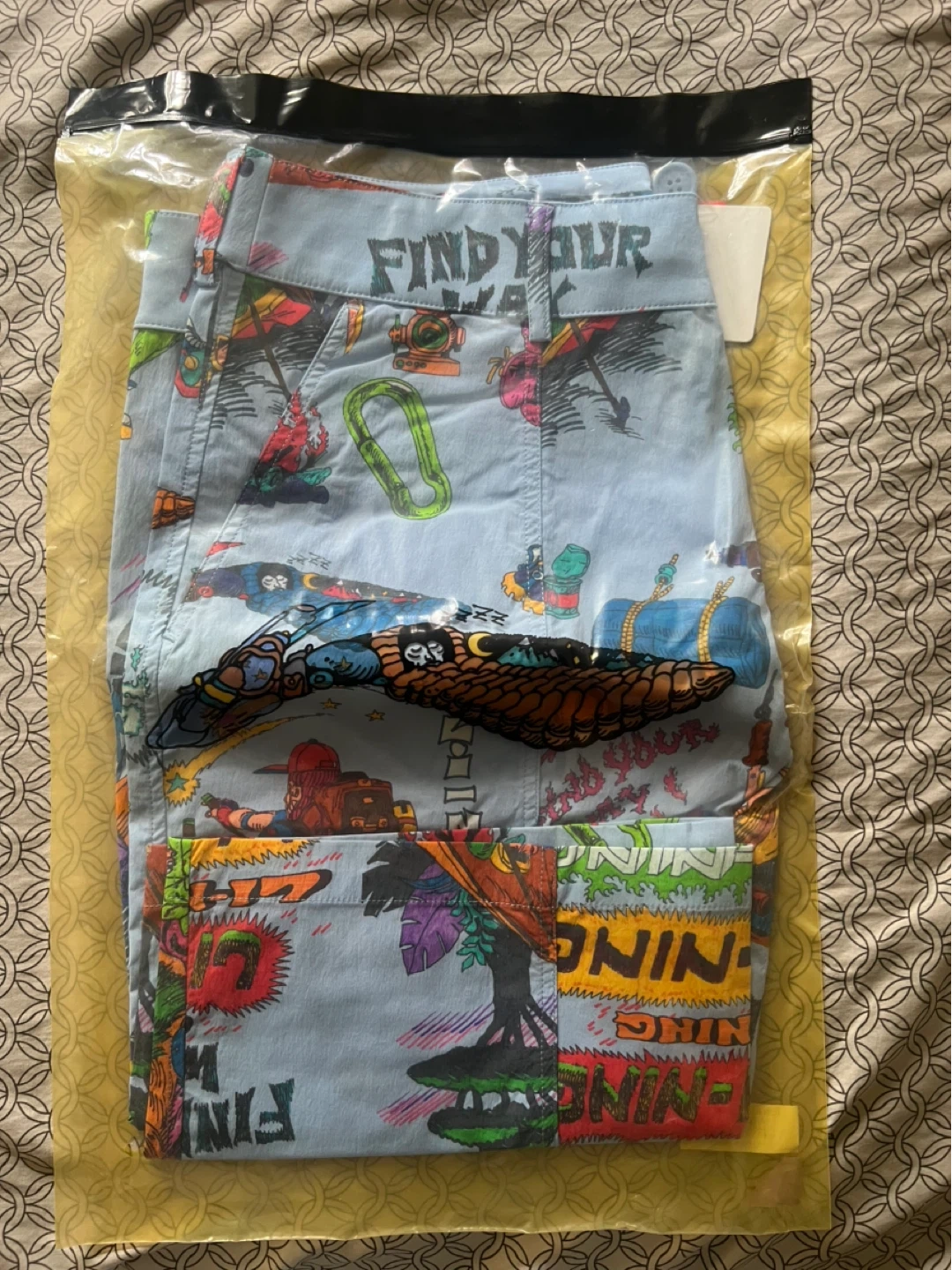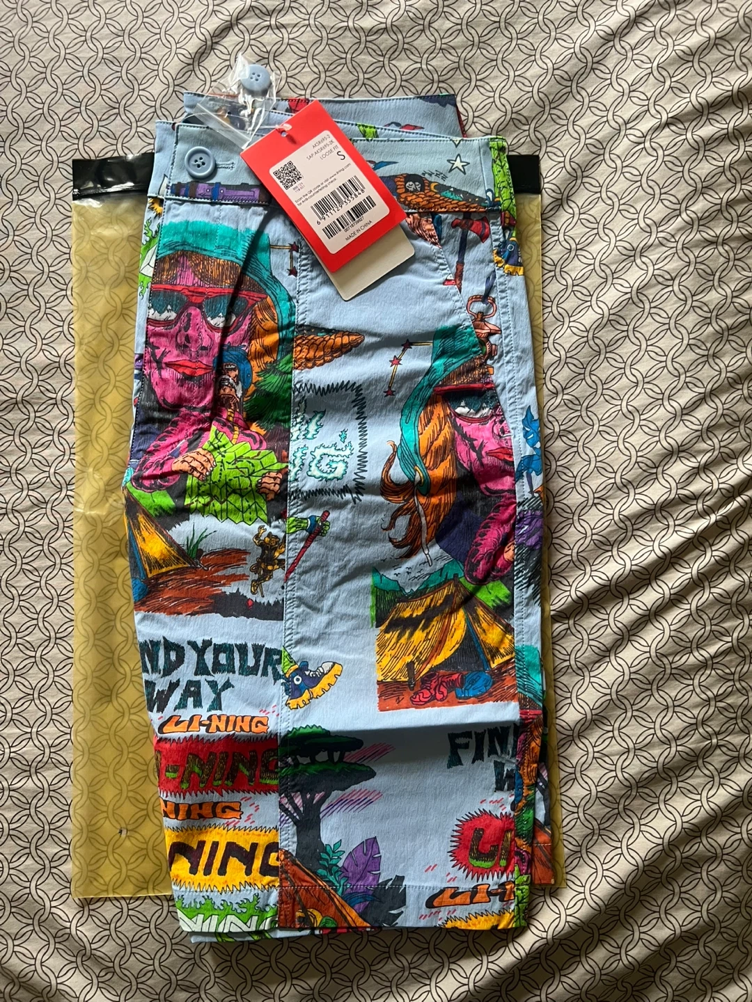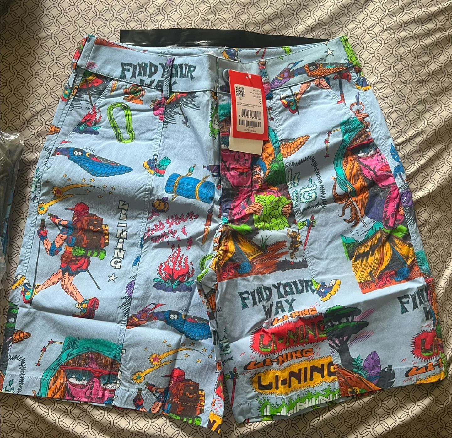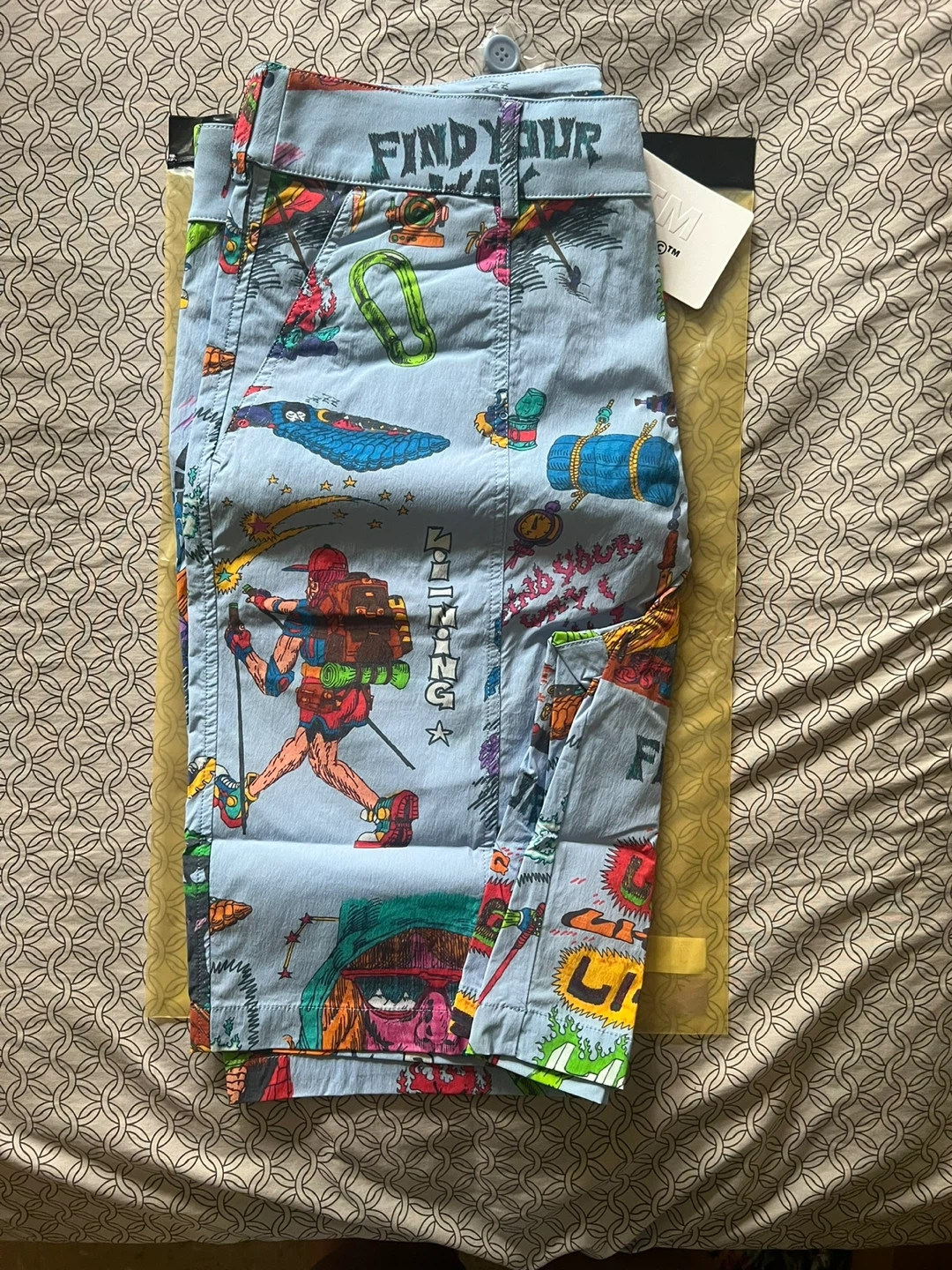 NEW (formally Chinatown Market) “Find Your Way” light blue multi-patterned shorts size SMALL. Replacement button included. Only taken out of packaging for pictures. The collab brand is controversial apparently, and I’ve had trouble listing bc of it 😅