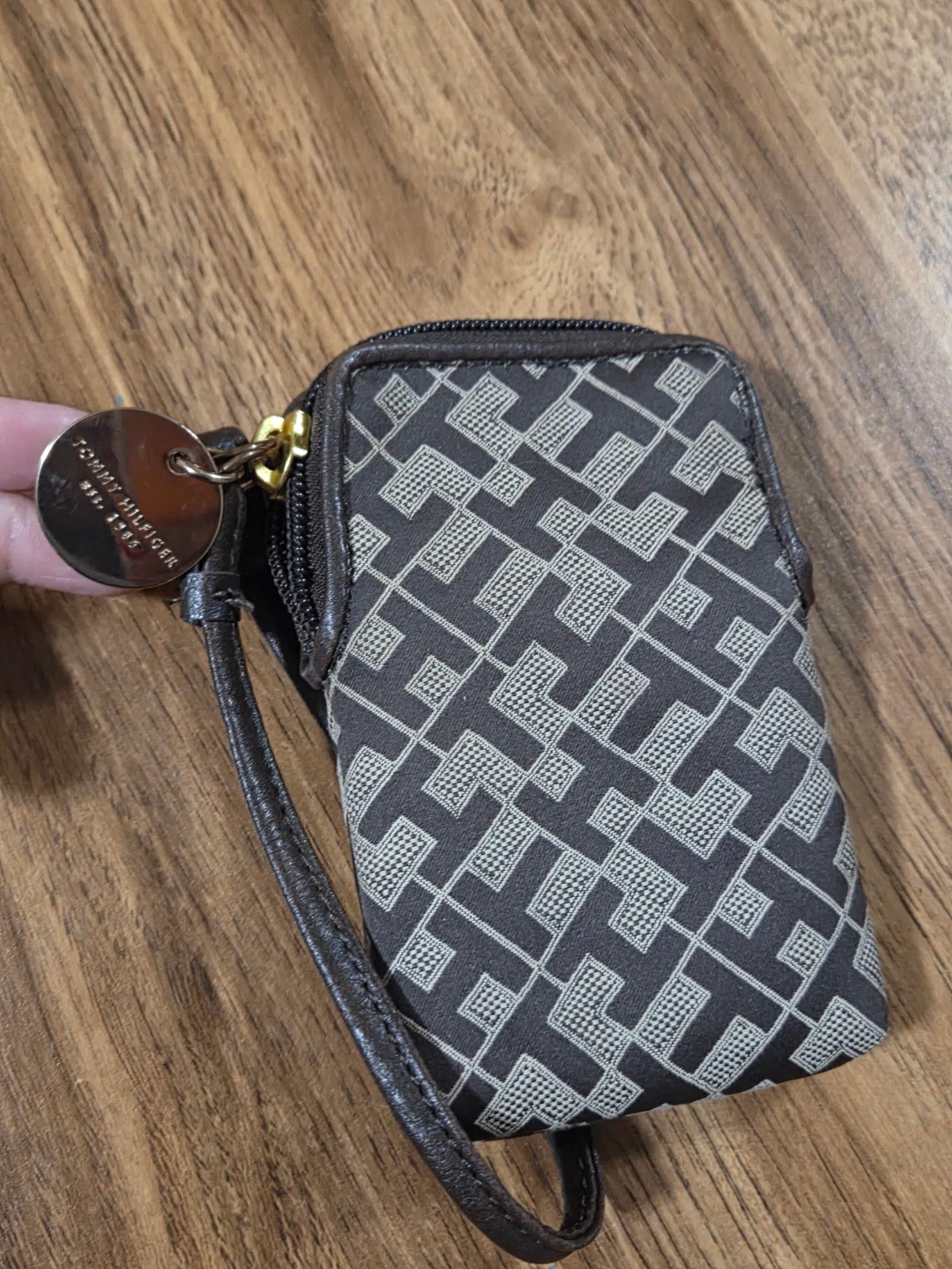 Tommy Hilfiger wristlet wallet in good condition! It's brown with a geometric pattern. Perfect for carrying your essentials!