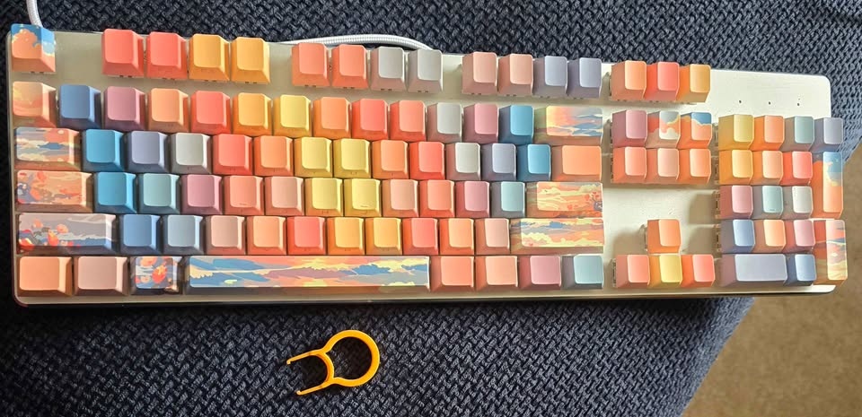 Sunset keycaps. Very pretty, just wanted to change things up. Cherry profile. Similar to this but 100% size https://a.co/d/bQUI4Ec
