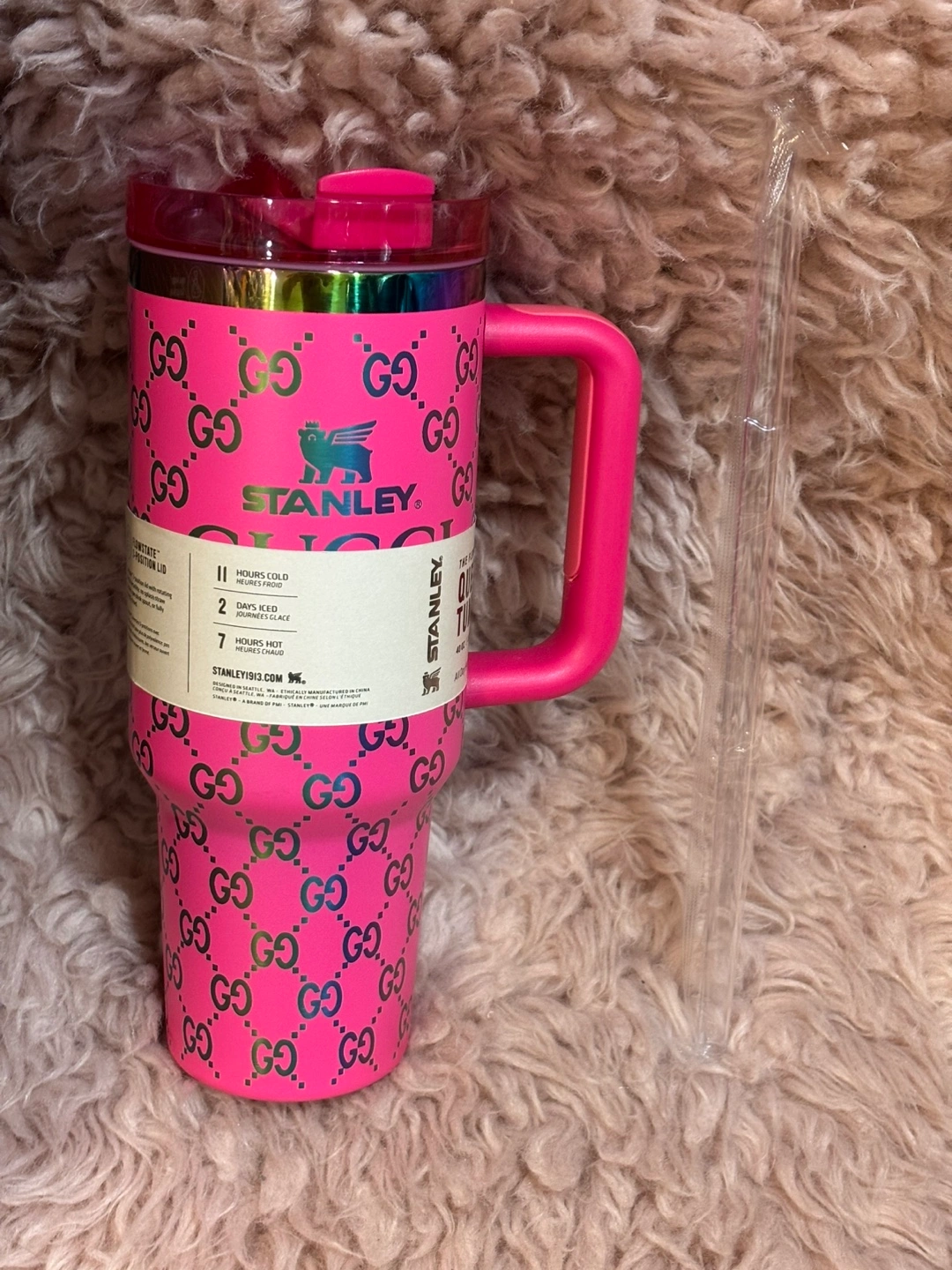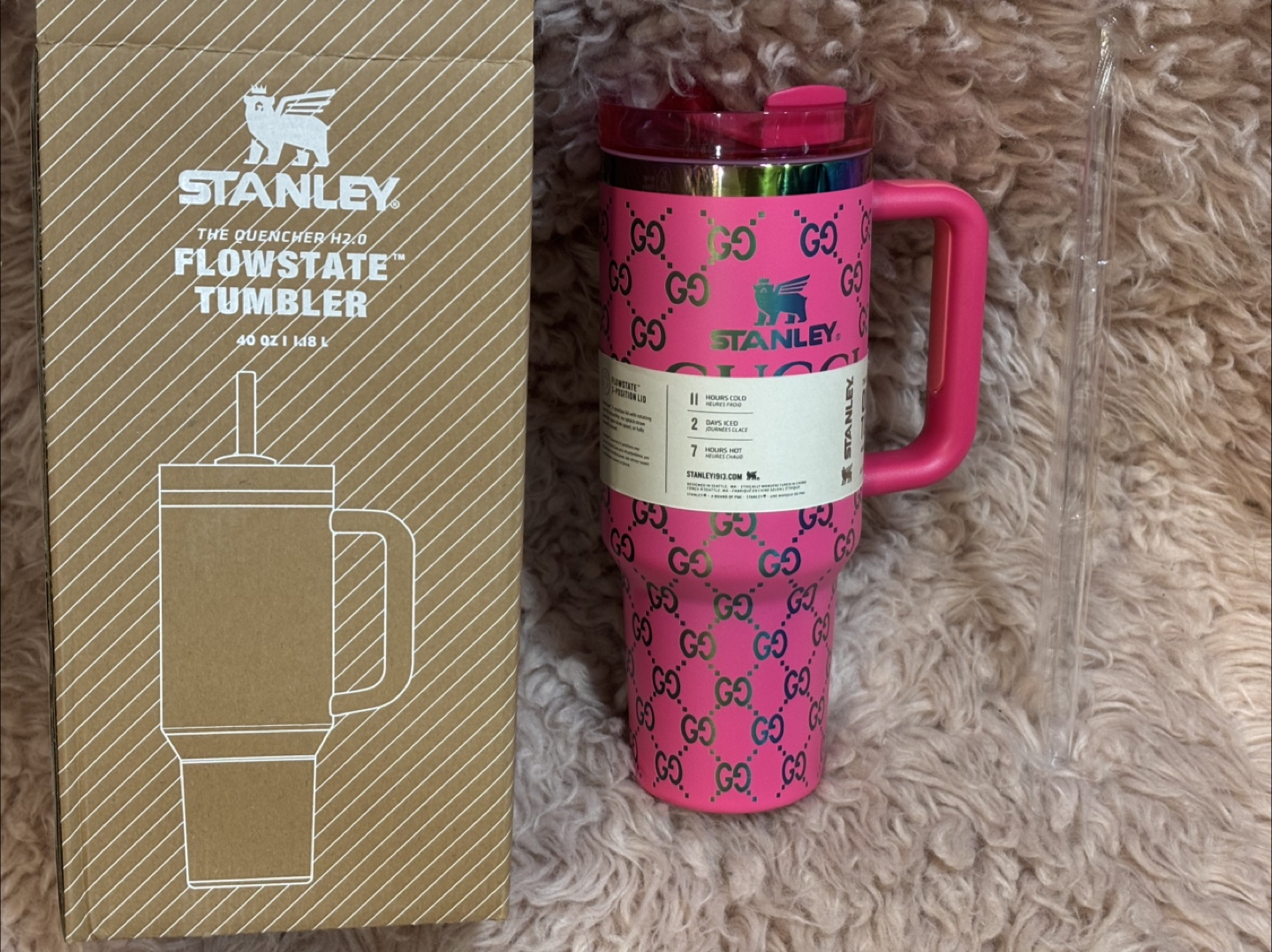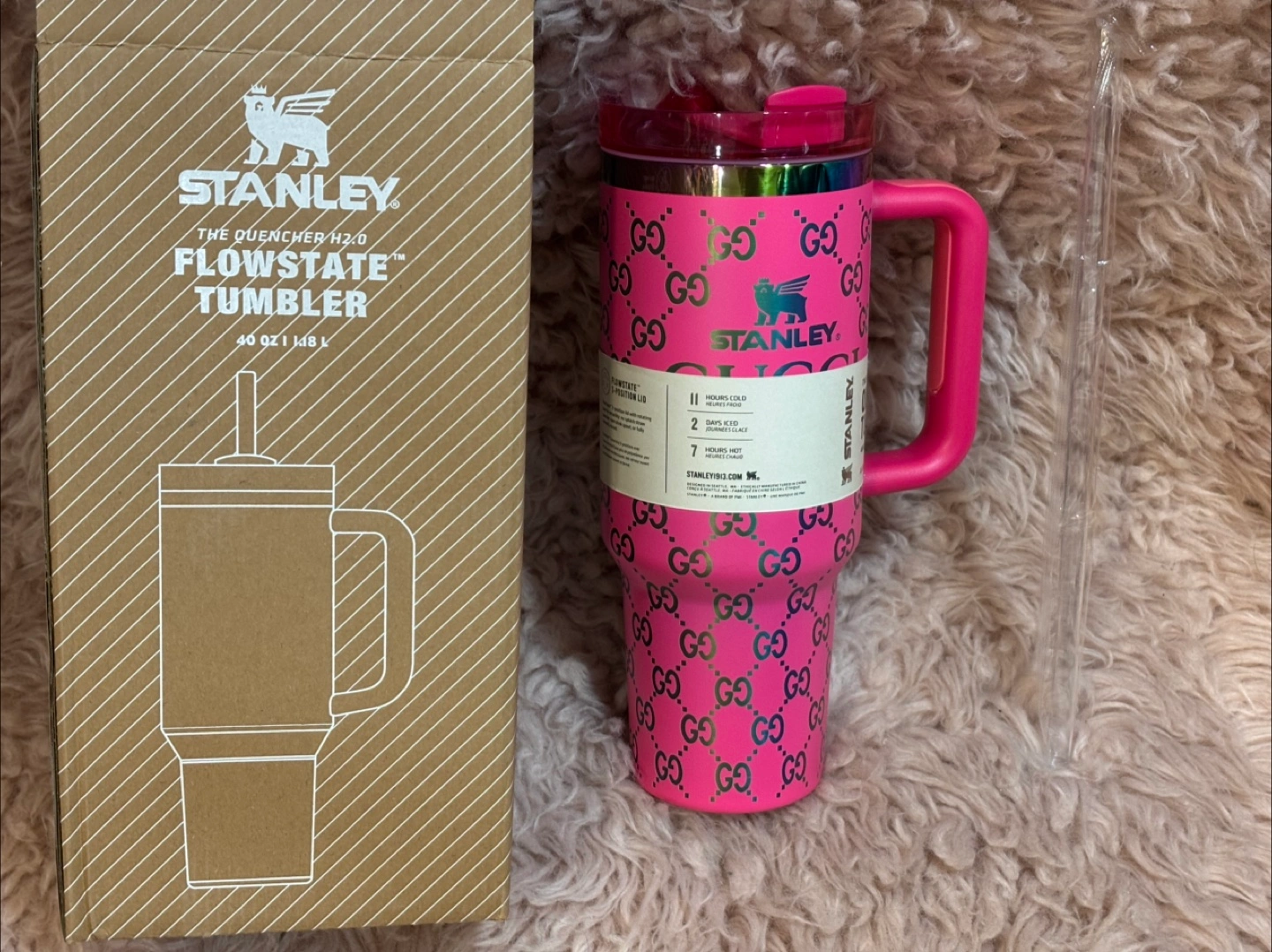 Selling a Stanley The Quencher H2.0 Flowstate Tumbler! It's a vibrant pink color and features a unique design. This tumbler holds 40 oz and keeps drinks cold for 2 days or hot for 7 hours. It also comes with a straw and the original box