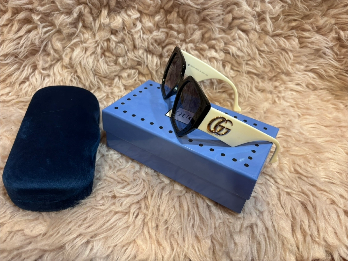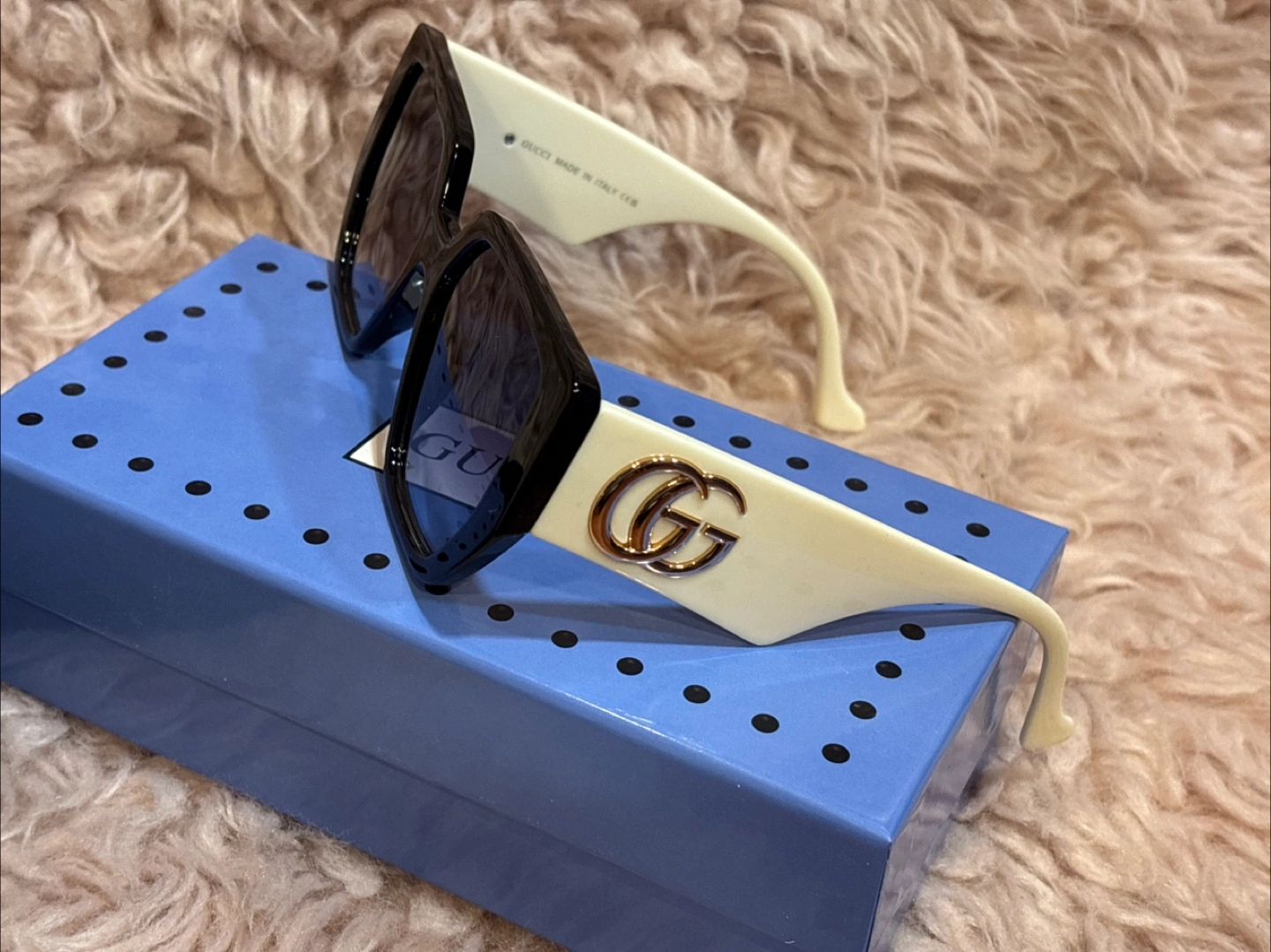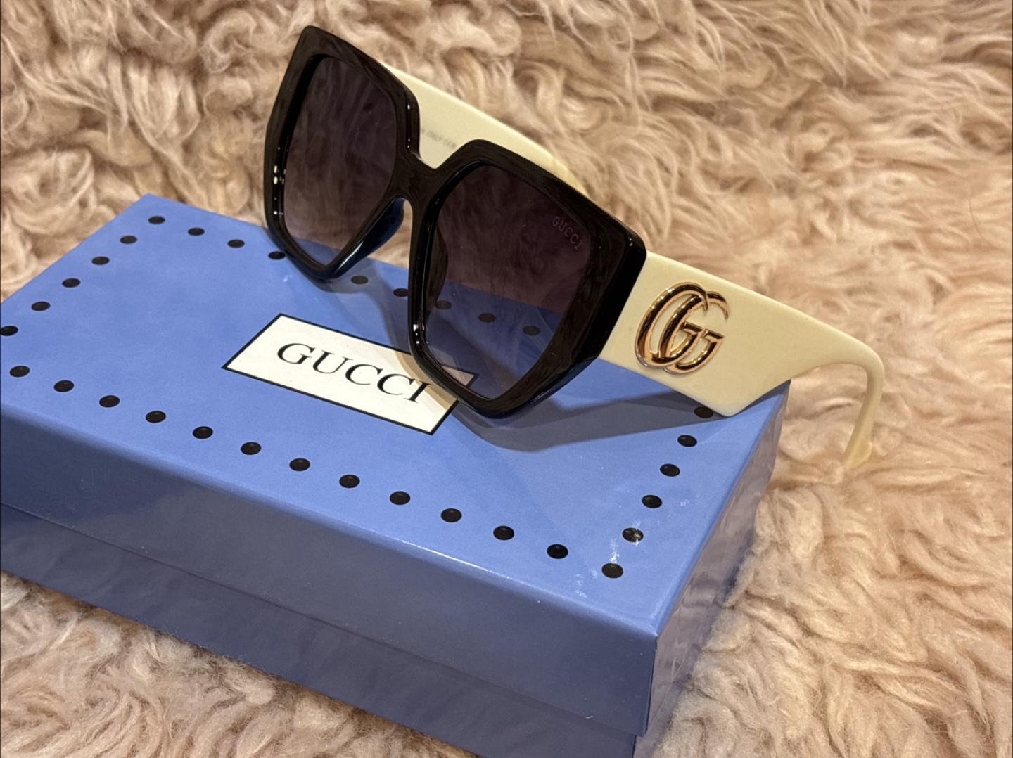 Selling a pair of Gucci sunglasses. They come with the original case. The sunglasses have a black frame and off-white arms with the Gucci logo on the side