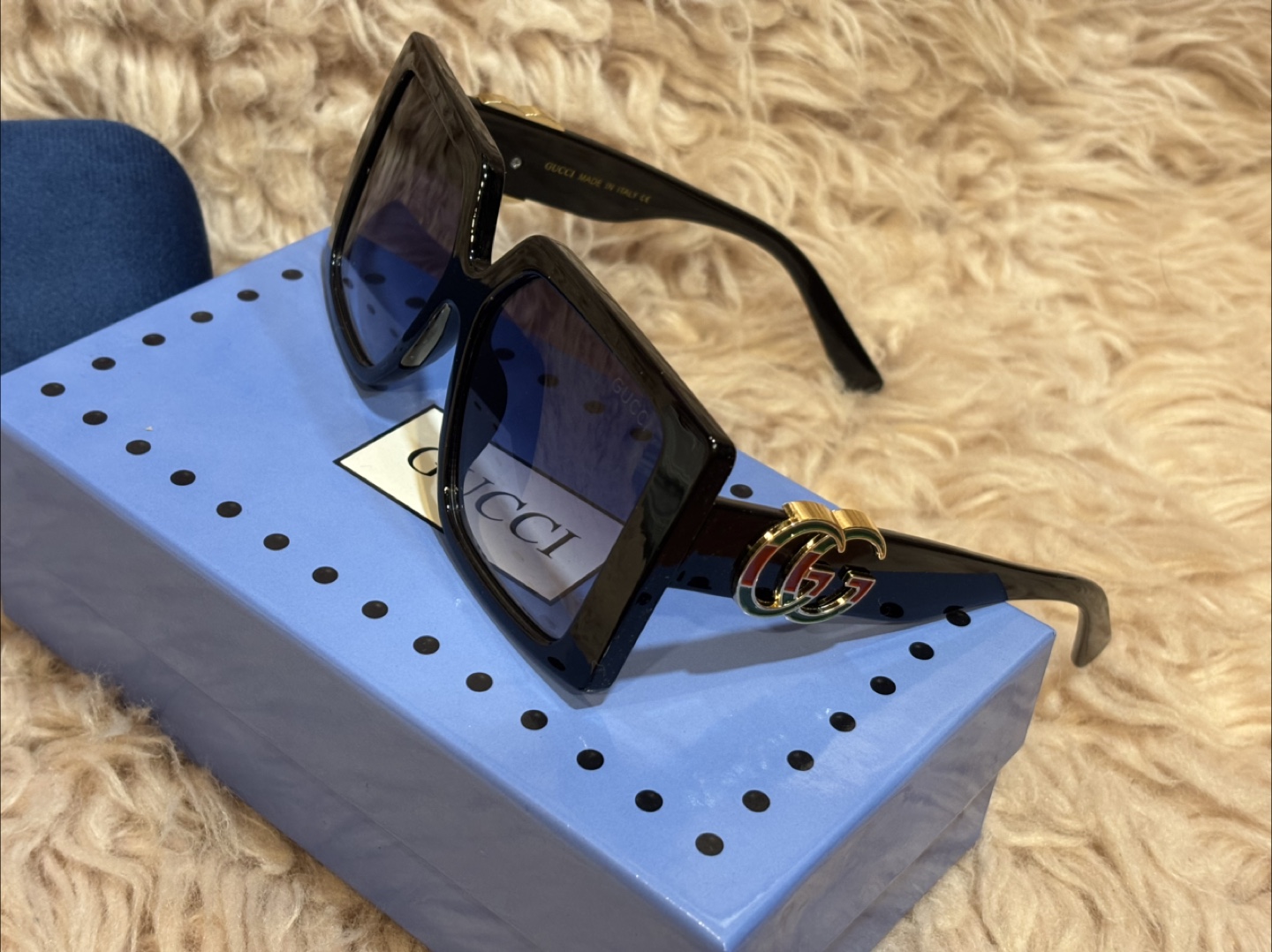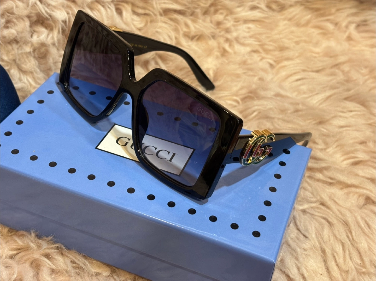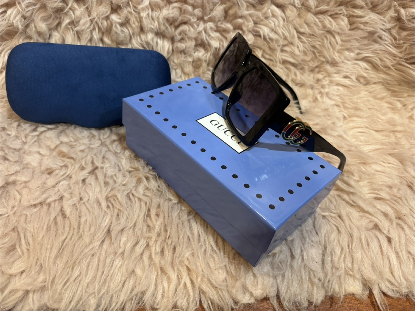 Selling a stylish pair of Gucci sunglasses in black. They come with the original box and a protective case. These sunglasses feature the iconic Gucci logo on the side. They're in great condition and ready for a new owner!