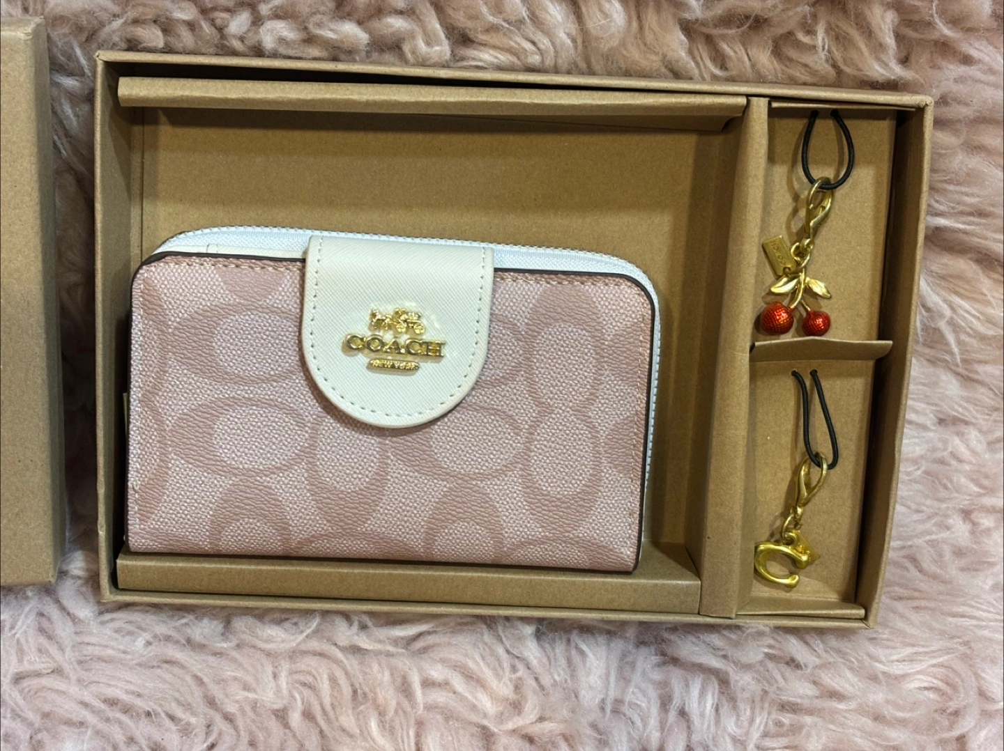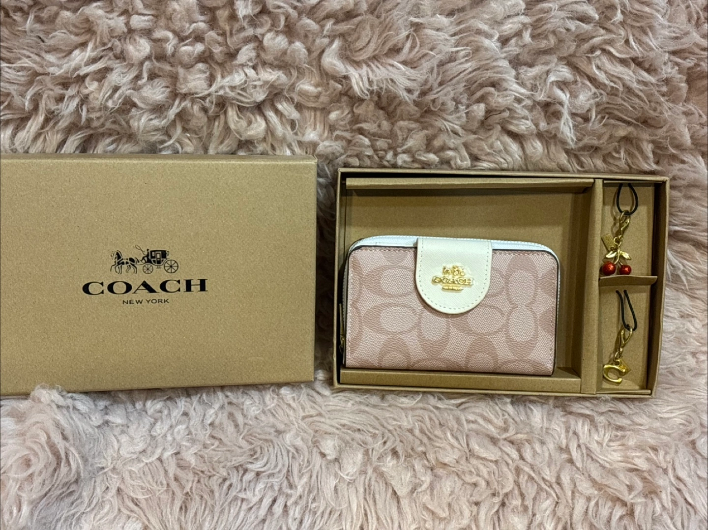 This is a brand new Coach Small Zip Around Card Case Gift Set! It comes with the original box and includes a cherry charm and a 'C' charm. Perfect for keeping your cards organized in style