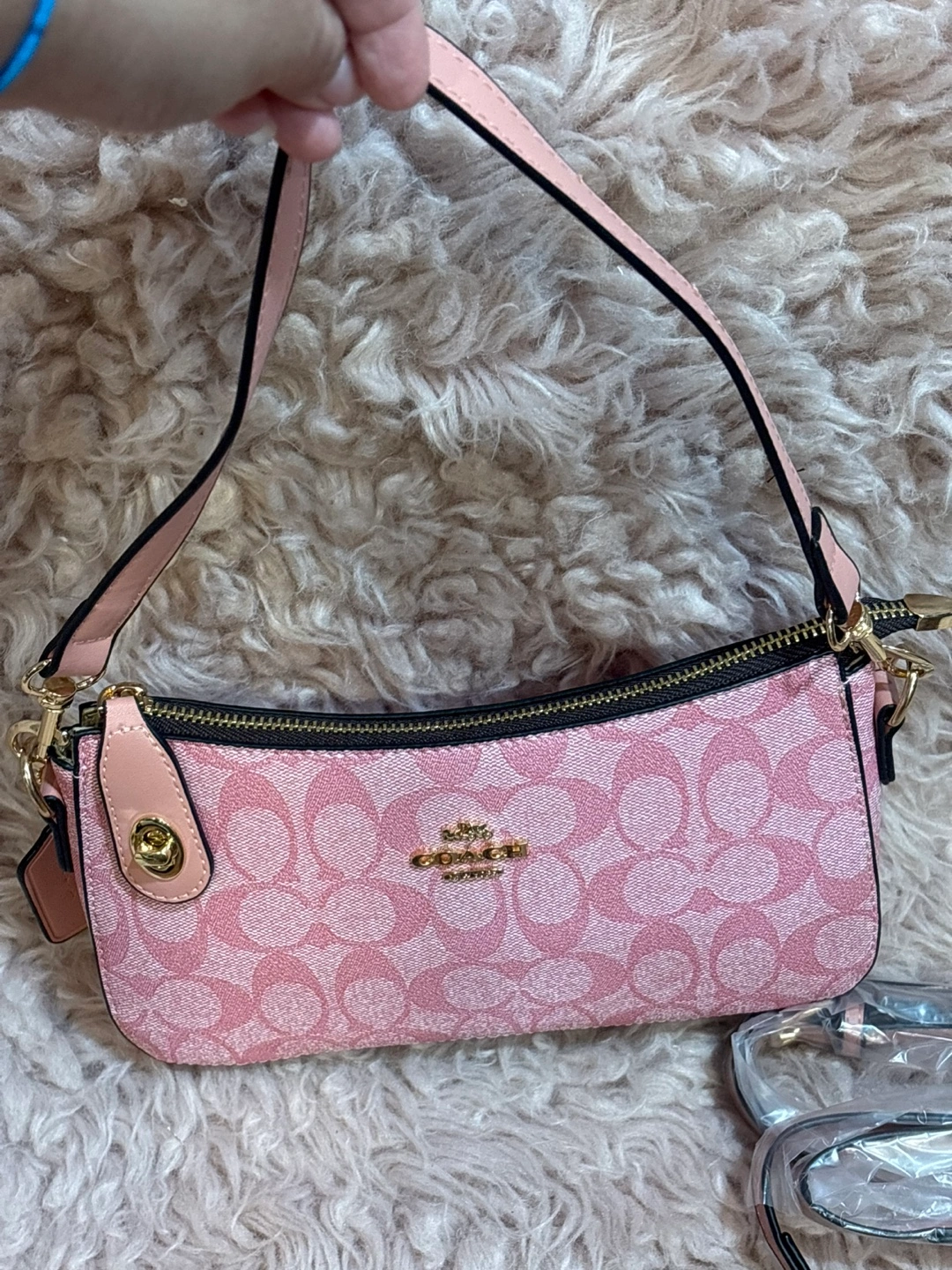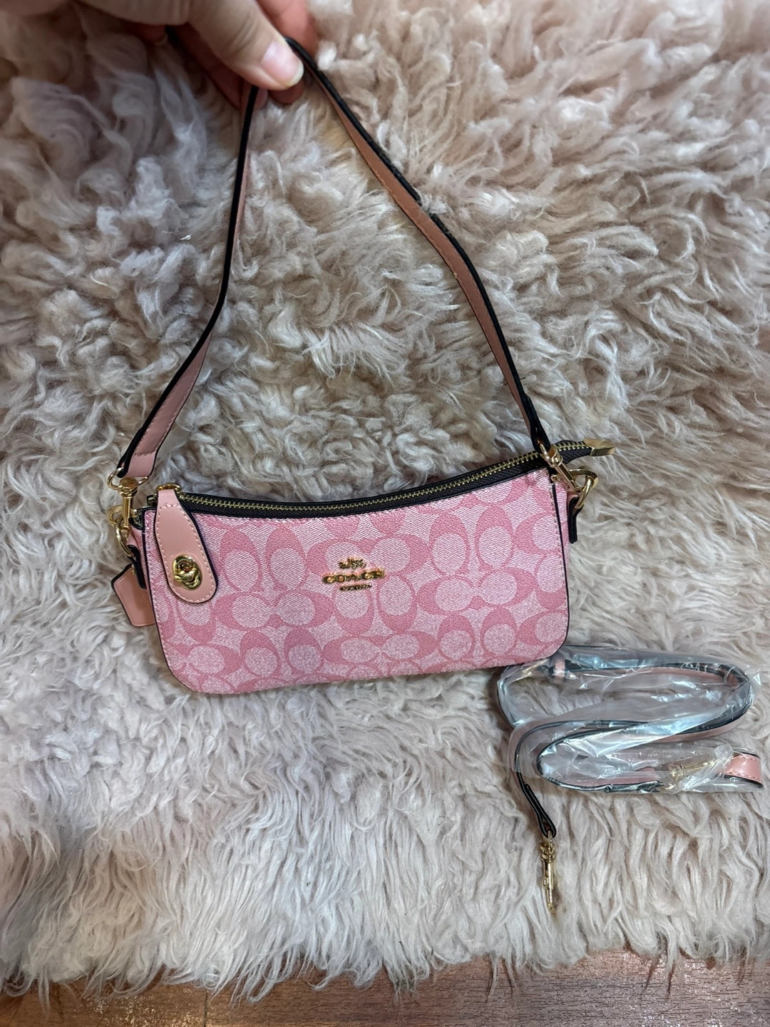 This is a cute pink Coach Y2k shoulder bag. It has the signature Coach jacquard print. It's perfect for adding a pop of color to any outfit!