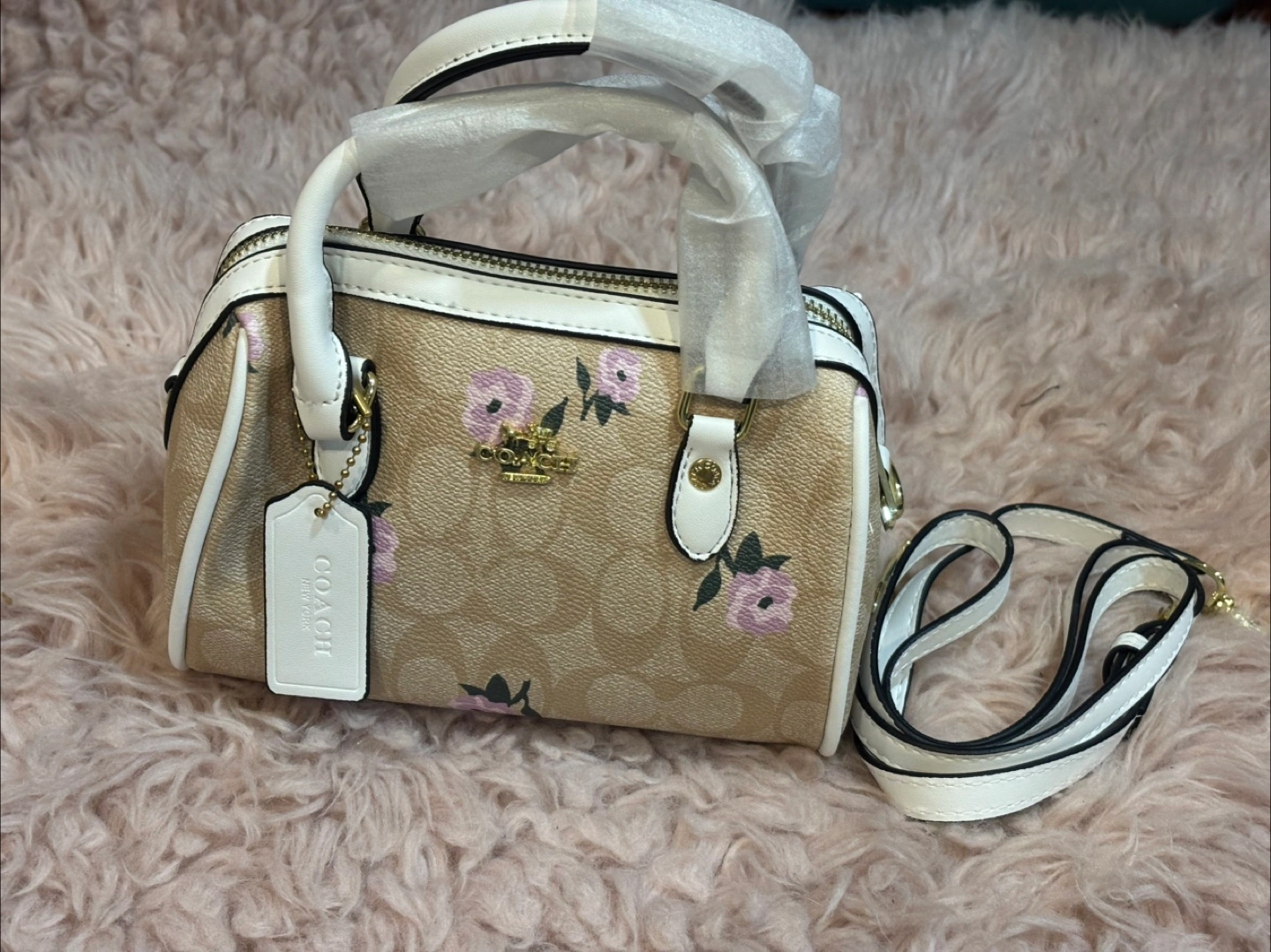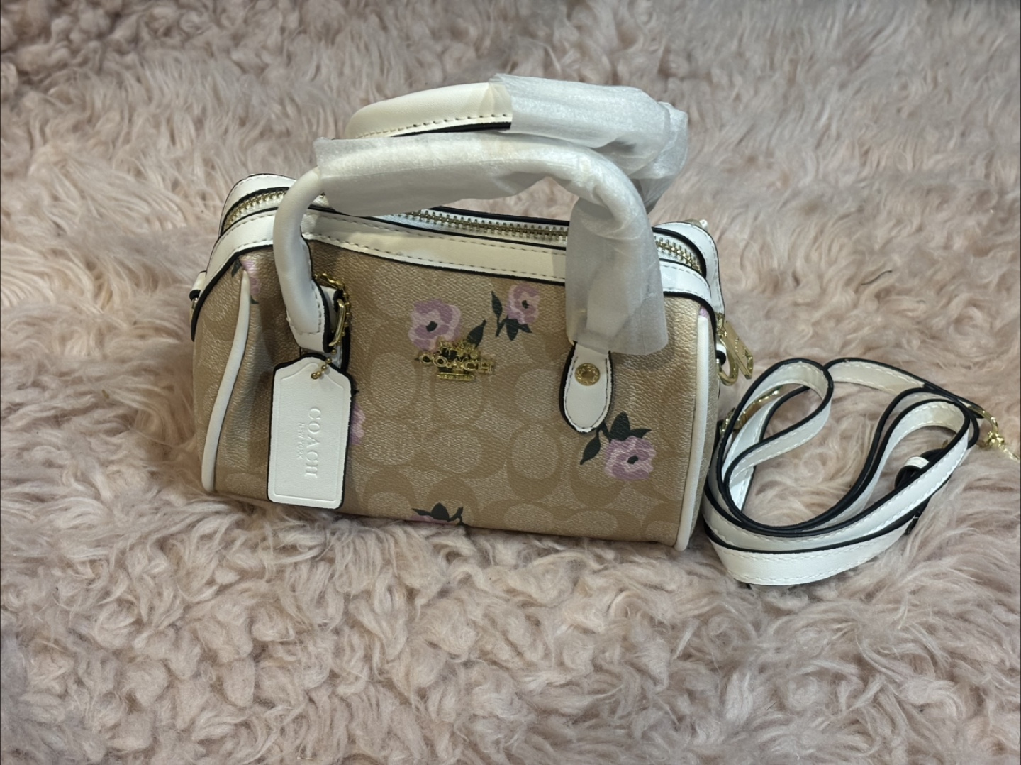 This is a new Coach Mini Jamie Camera Bag with a floral design! It's a stylish and compact bag perfect for carrying your essentials. The bag features a charming floral pattern on the signature Coach material with white trim. It comes with a detachable strap.