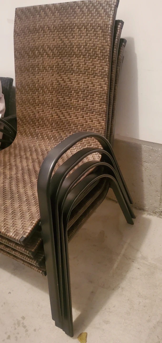 Selling a set of four wicker outdoor dining chairs! They're in great shape and perfect for enjoying the nice weather on your patio or deck. The chairs are stackable, making them easy to store when not in use. The wicker is a neutral brown colour that will complement any outdoor decor