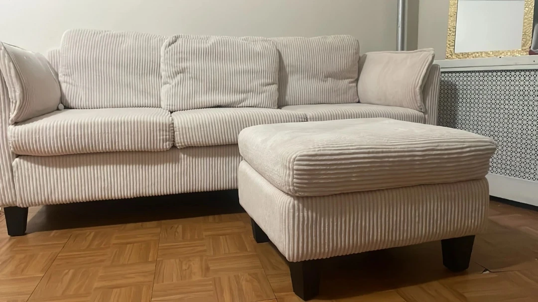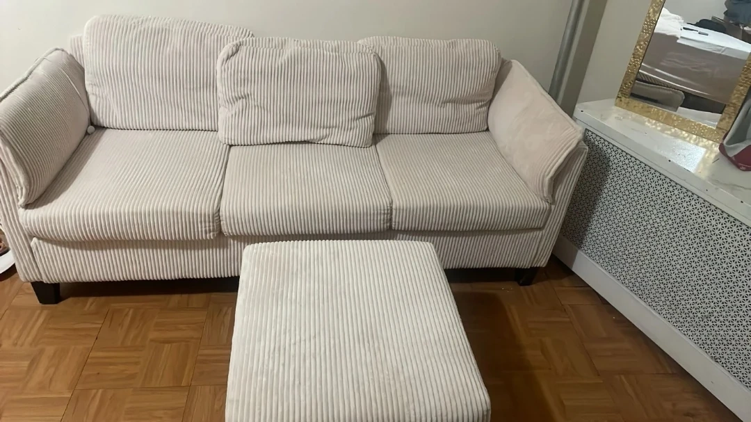 Selling a comfortable corduroy sofa with a matching ottoman. It's in great condition and would be a cozy addition to any living room. The sofa and ottoman feature a soft, textured corduroy fabric in a neutral color that complements various decor styles