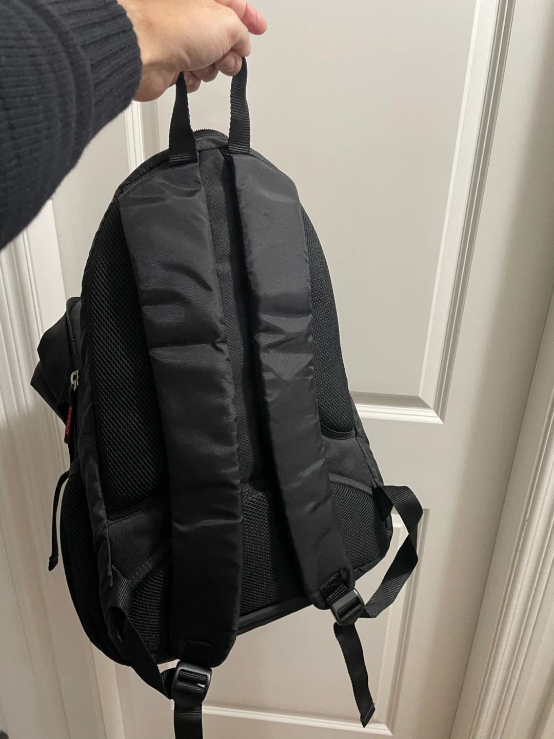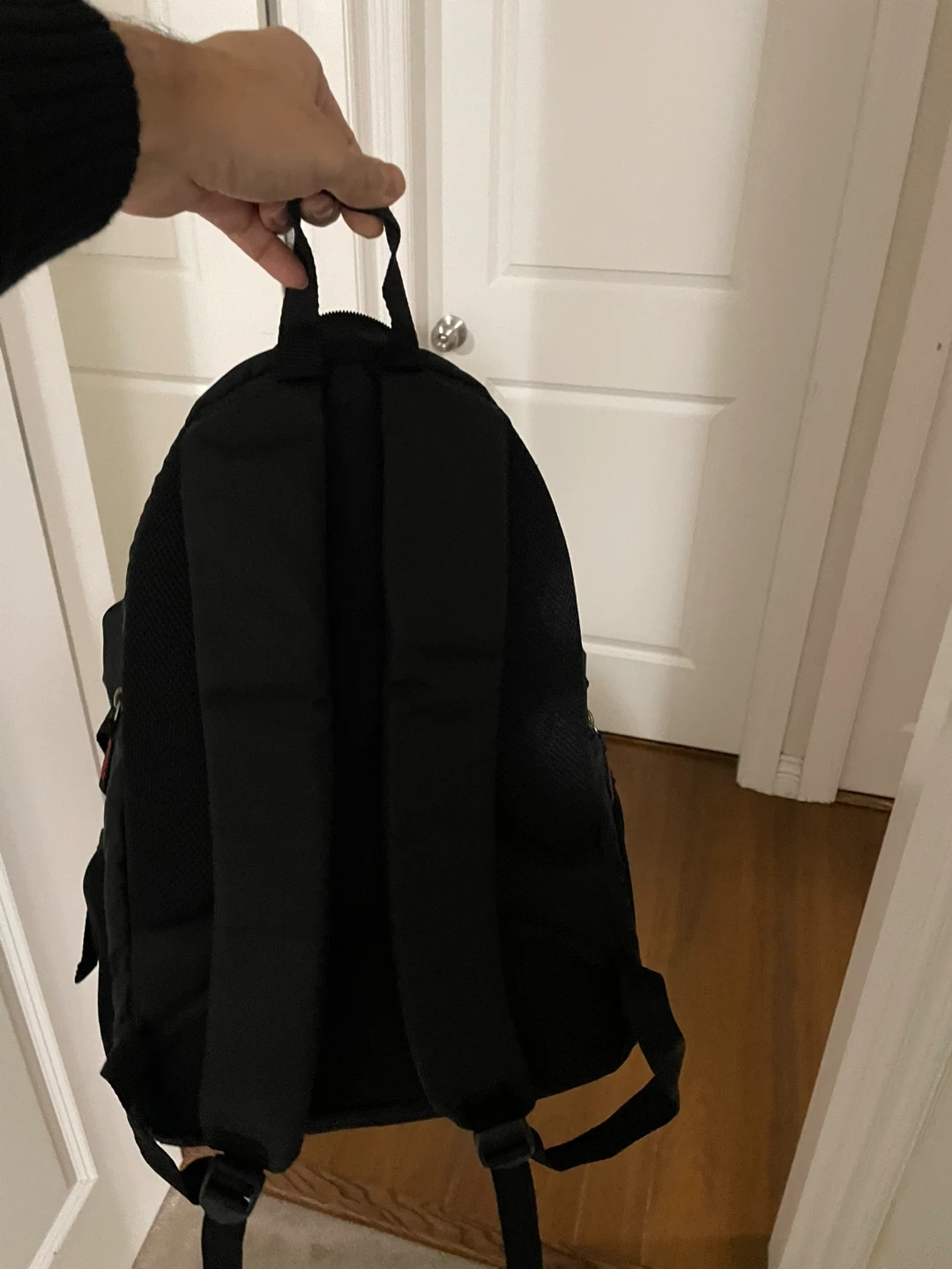 Selling a black backpack in good condition! It has some red detailing on the front. It's perfect for school, work, or travel