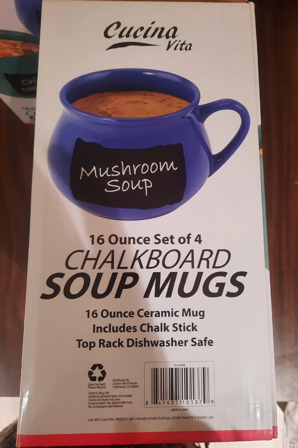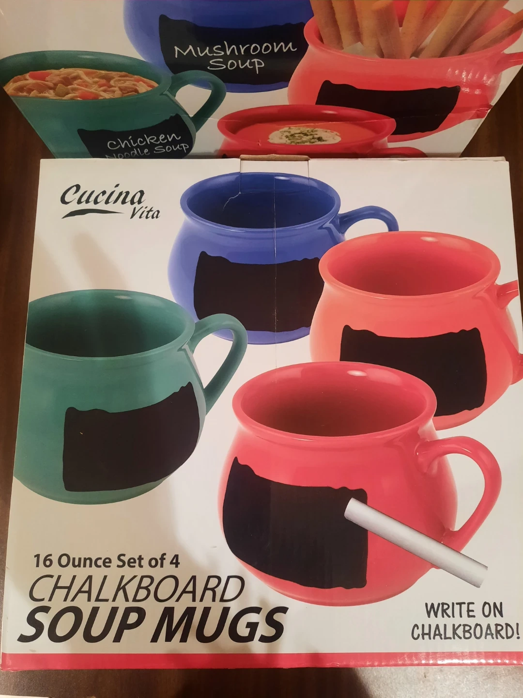 Brand New Boxed set of 4 Cucina Vita chalkboard soup mugs! These are 16-ounce mugs, in 4 vibrant colors. They're top rack dishwasher safe and perfect for enjoying your favourite soups. The chalkboard design lets you write on them, adding a fun and personal touch to your meal.