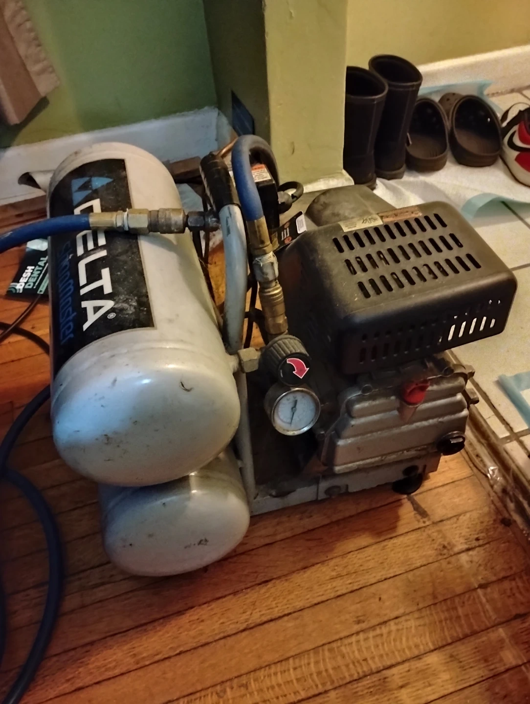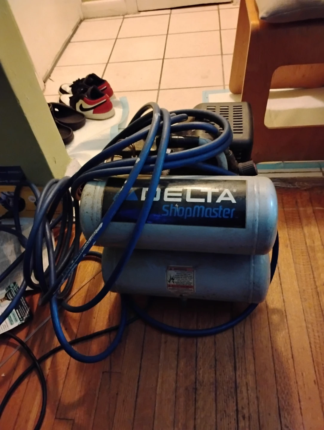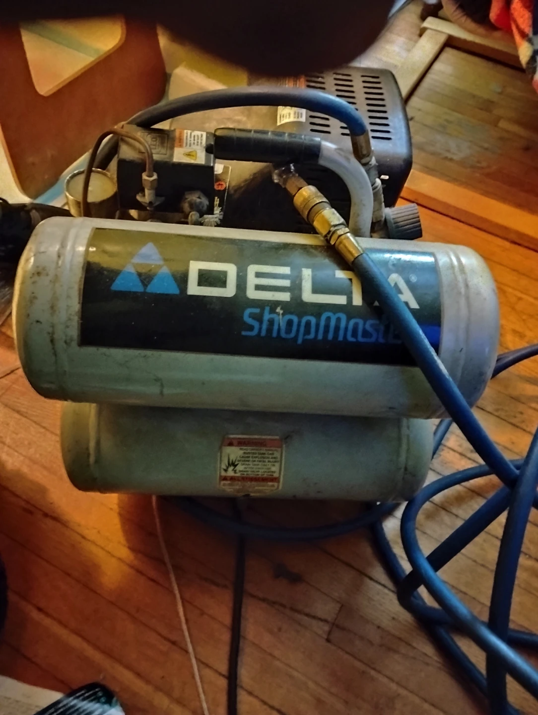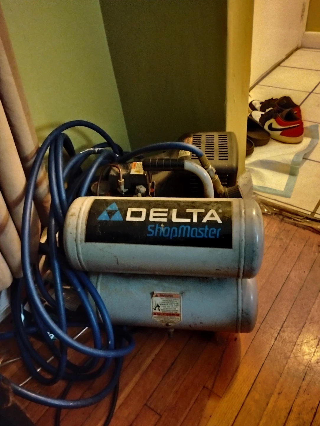 For sale, one used twin stack tank Delta Shopmaster 4 gallon air compressor with 50' ft. hose attachment. The unit is 8 years old and has performed many at-home-projects and job site tasks admirably. The machine is electrically operated as to posed to gas powered making machine maintenance easier. It is constructed with a hand-carry design, offering portability between home use and job sites, while also being useful in a variety of applications such as, inflation, brad nailing, finish nailing, and stapling, etc.....Asking price is $60 (cash only).