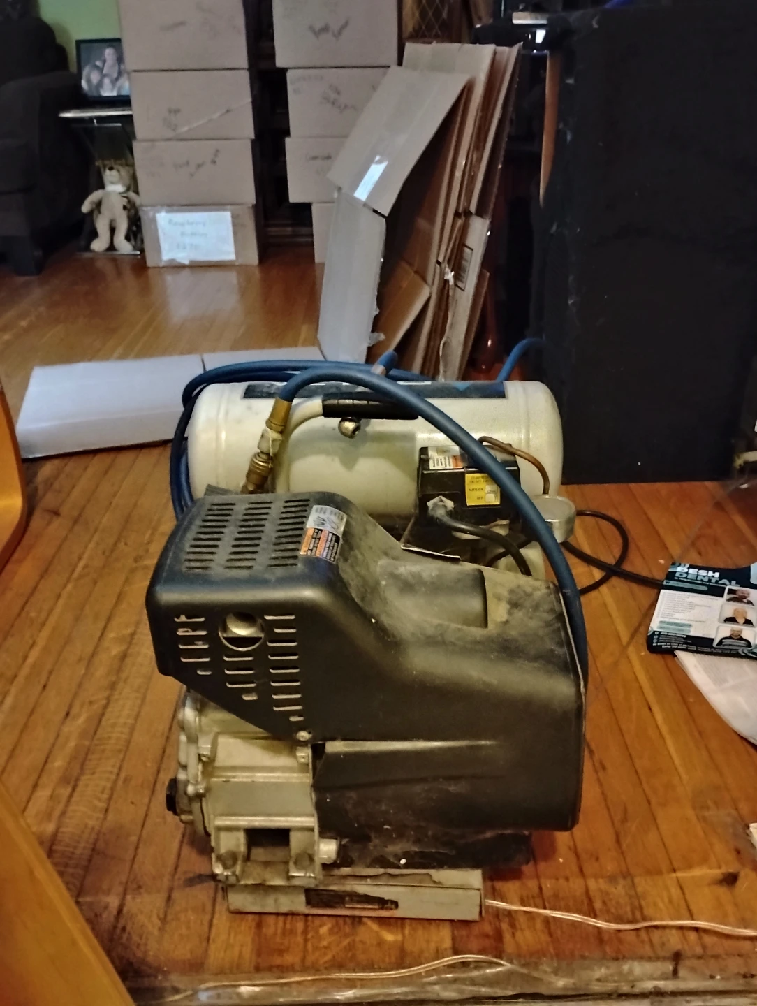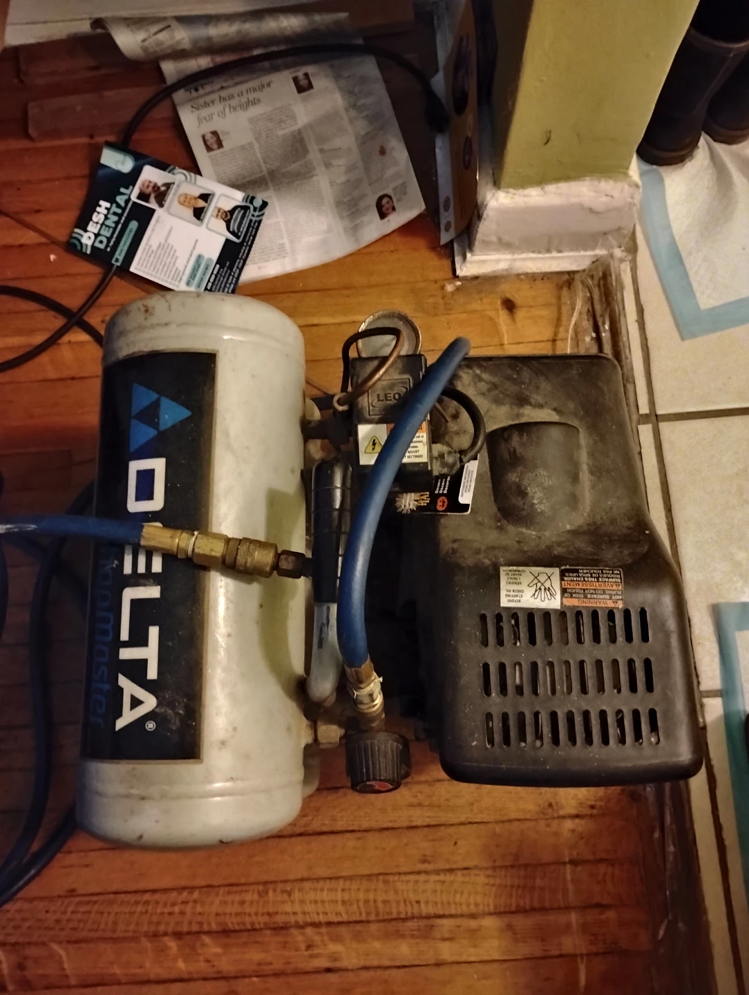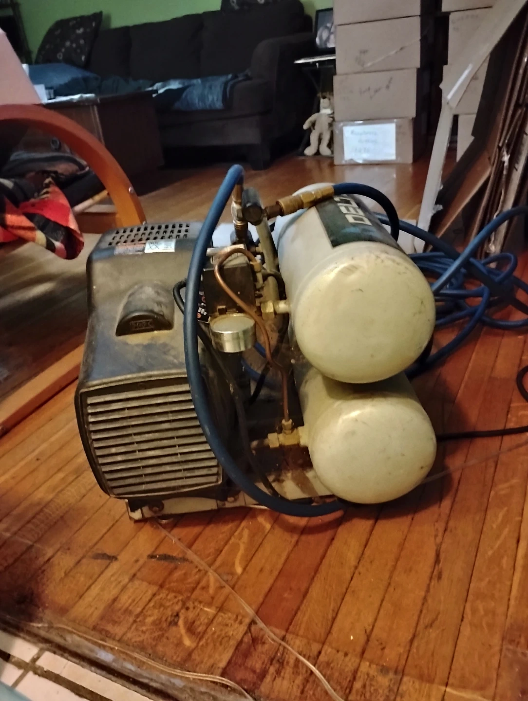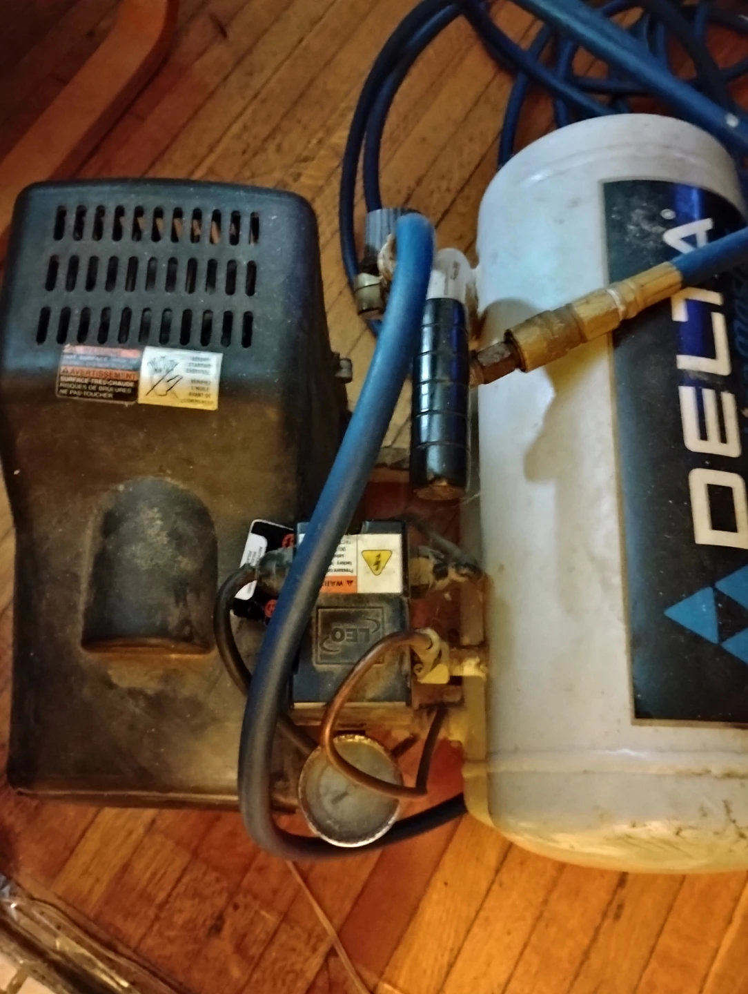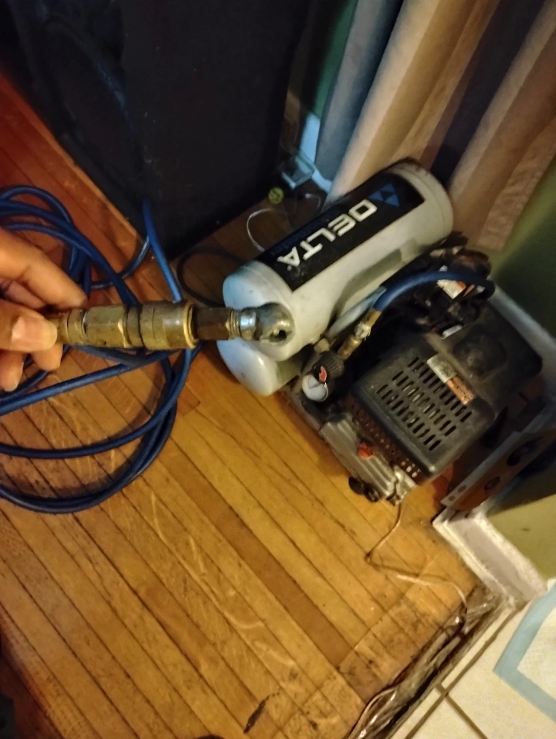 For sale, one used twin stack tank Delta Shopmaster 4 gallon air compressor with 50' ft. hose attachment. The unit is 8 years old and has performed many at-home-projects and job site tasks admirably. The machine is electrically operated as to posed to gas powered making machine maintenance easier. It is constructed with a hand-carry design, offering portability between home use and job sites, while also being useful in a variety of applications such as, inflation, brad nailing, finish nailing, and stapling, etc.....Asking price is $60 (cash only).
