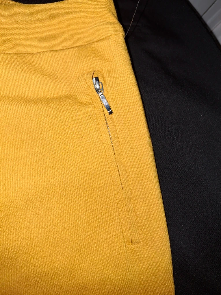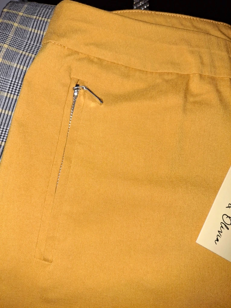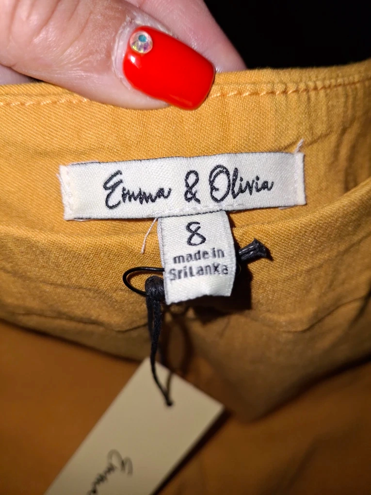 These are a pair of Emma & Olivia pants in a vibrant yellow color. They are size 8 and appear to be in good condition. They feature a unique zipper detail on the pockets.