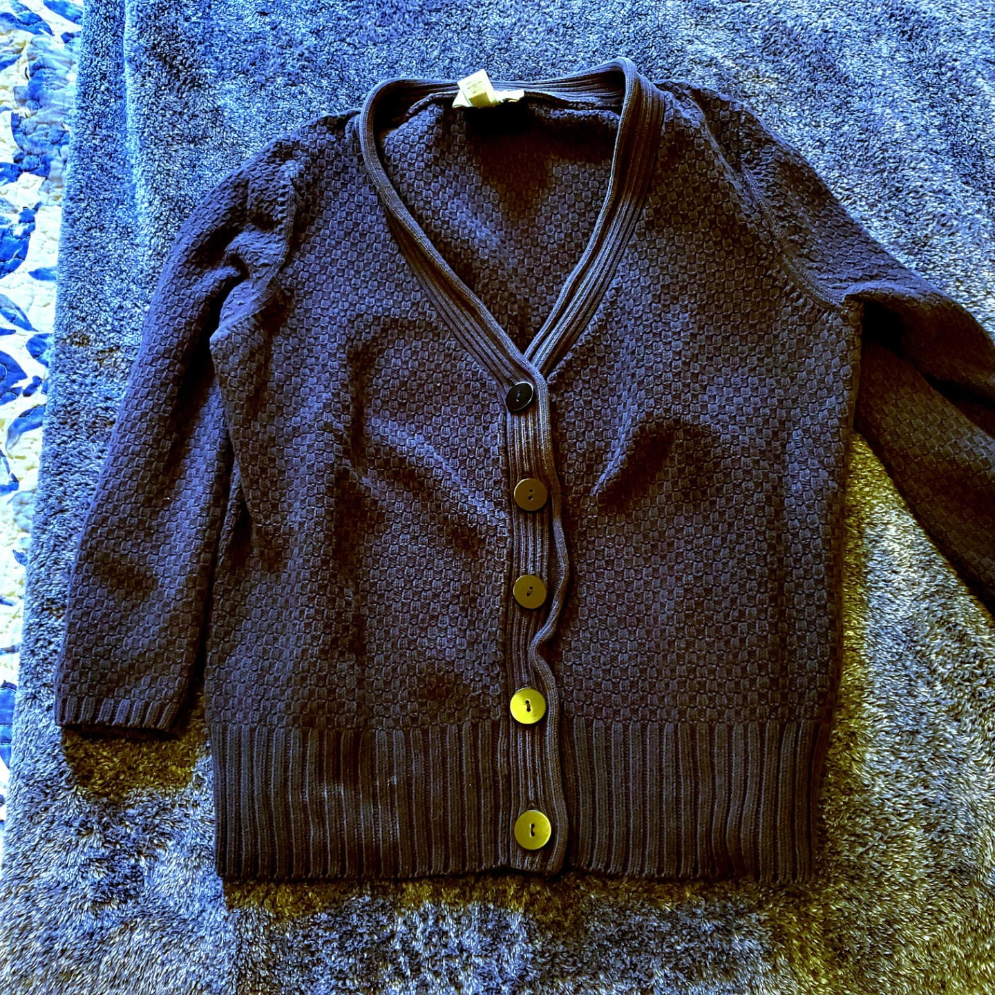 Ann Taylor Loft cardigan in a deep navy blue color. It's a size M, 100% Cotton, v-neck classic button-down style. Mid-weight, with 3/4 length sleeves. Perfect for everyday!