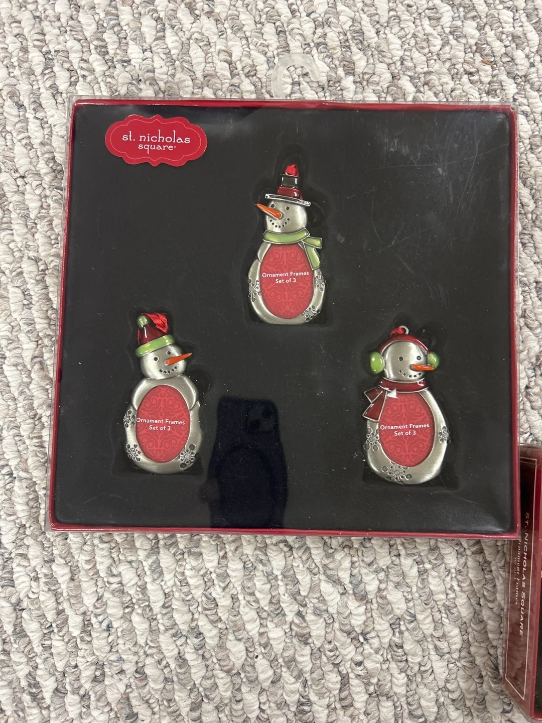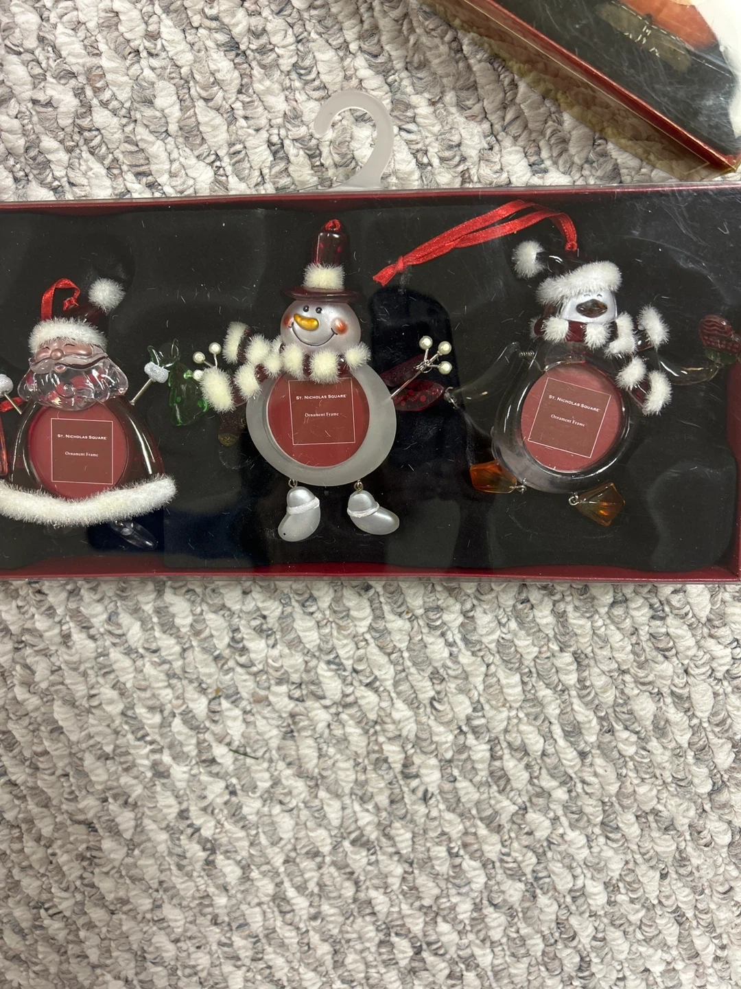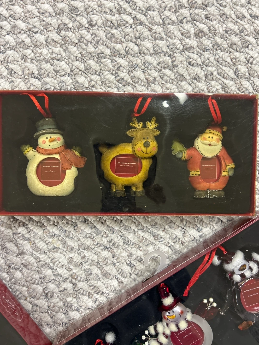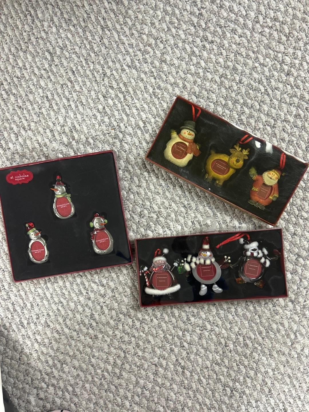 Selling St. Nicholas Square ornament frames. They are perfect for adding a personal touch to your Christmas tree or giving as a thoughtful gift. The frames are designed to hold small photos, allowing you to display cherished memories during the holiday season. They come in sets of three and feature classic holiday characters like snowmen, Santa, and reindeer.