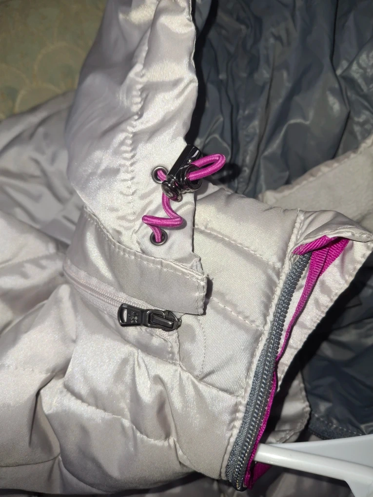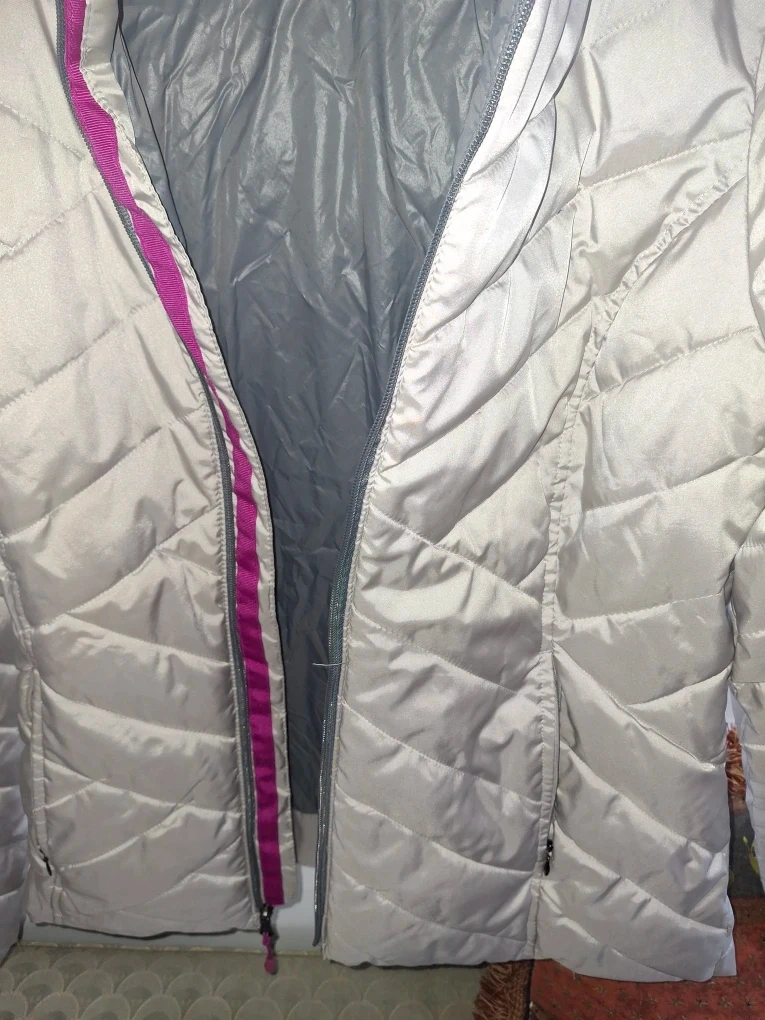 Selling a Tek Gear Warmtek puffer jacket in size medium. It's a light silver color with a pink interior trim. Great for layering or wearing on its own during milder weather!