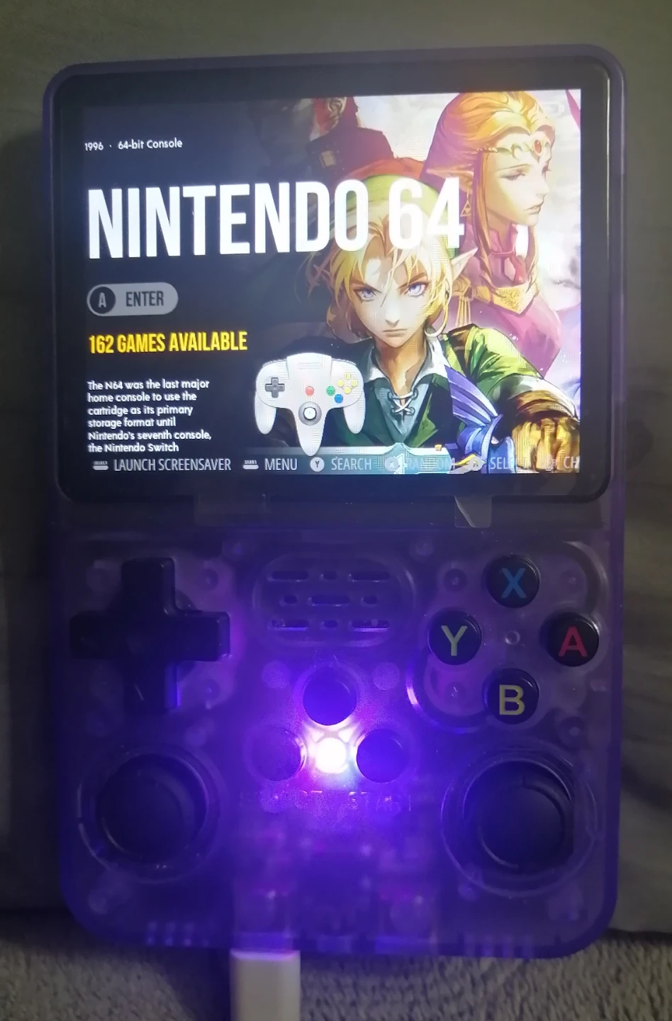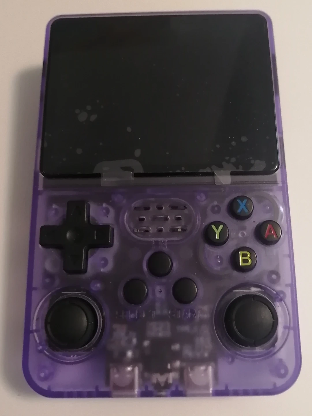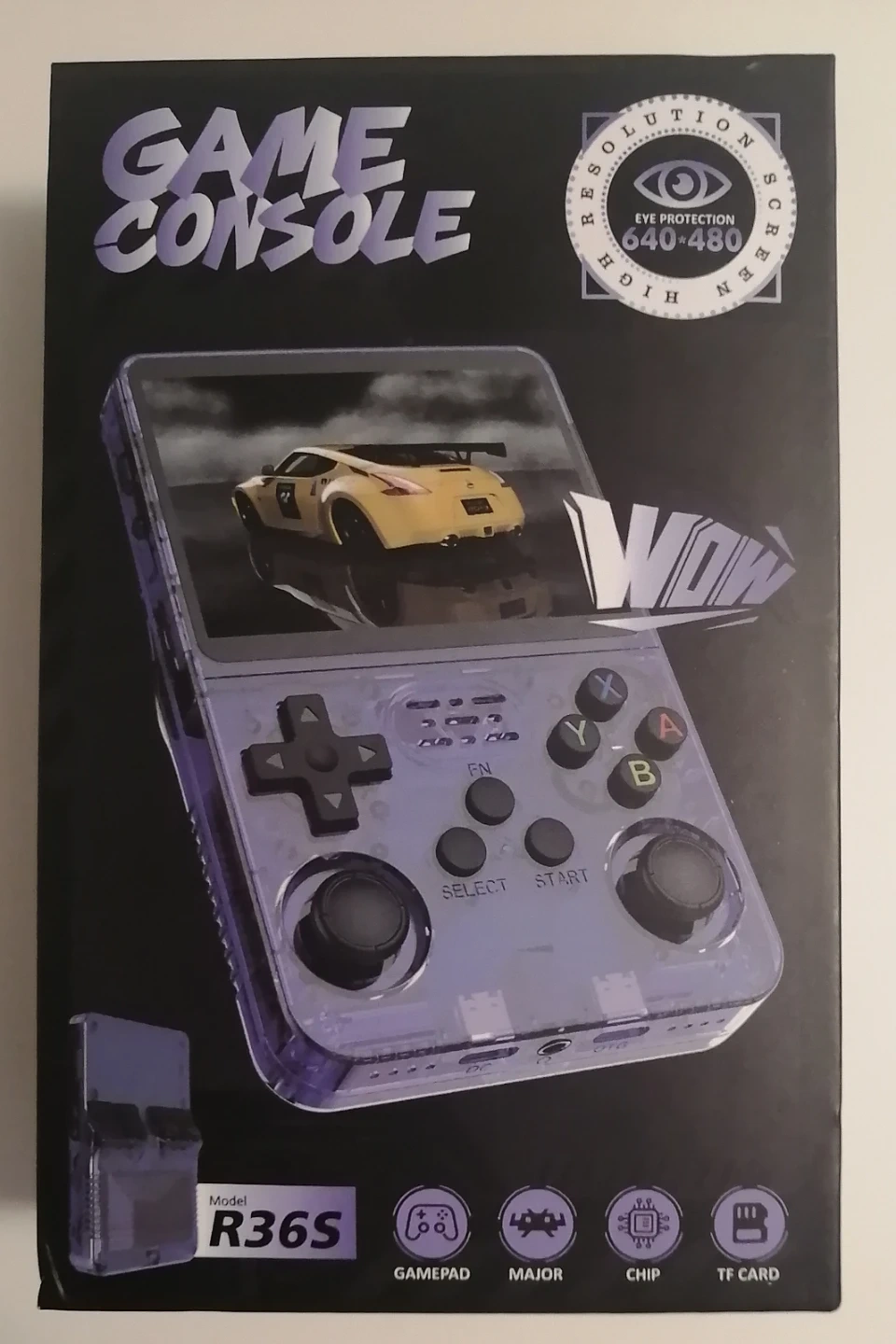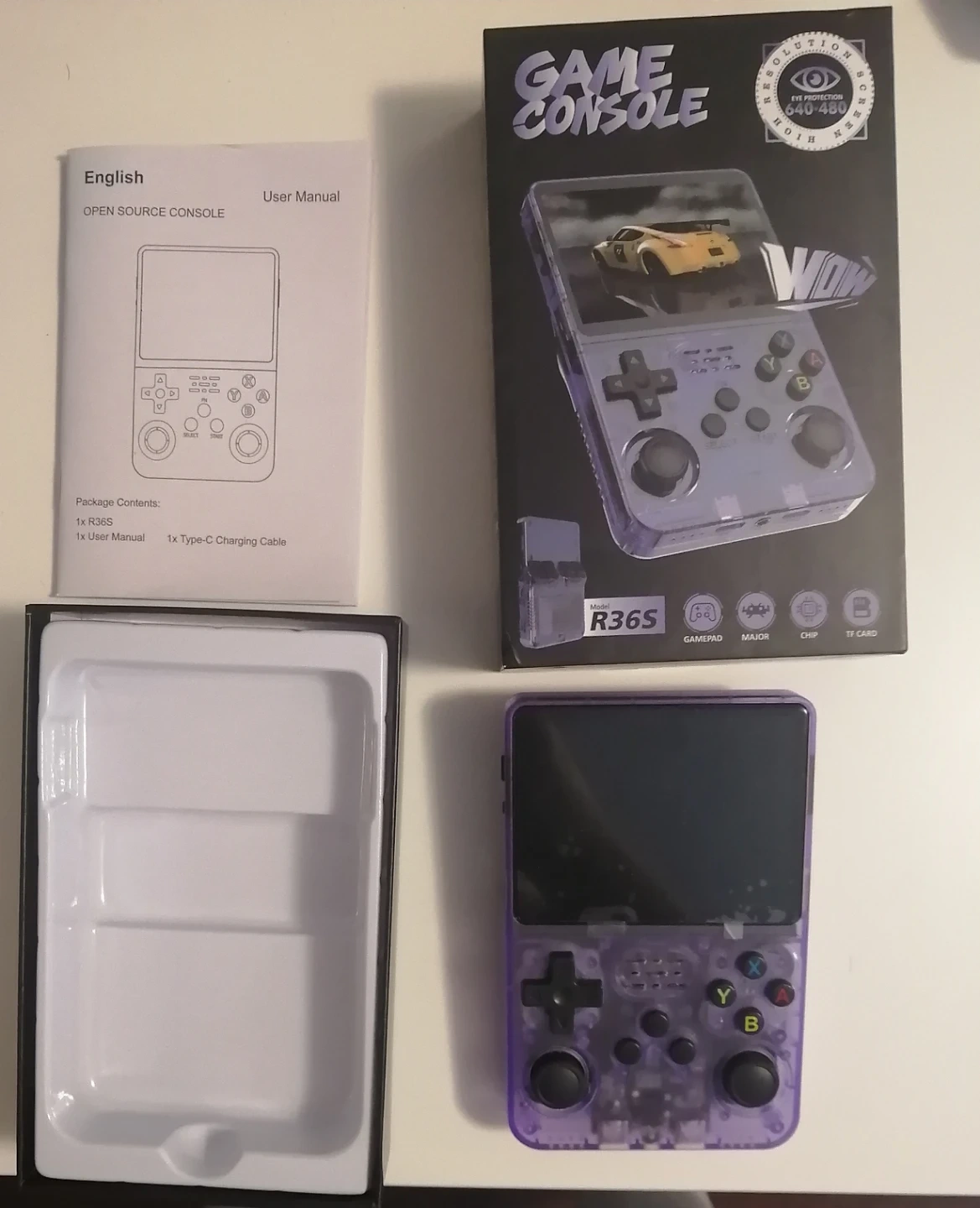 Selling a purple R36S game console. It comes with its original box. Great for retro gaming on the go! Has so many system emulators and a ton of games. 21,898 of them available it says. It's also expandable!