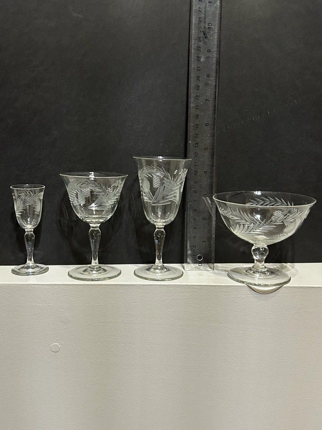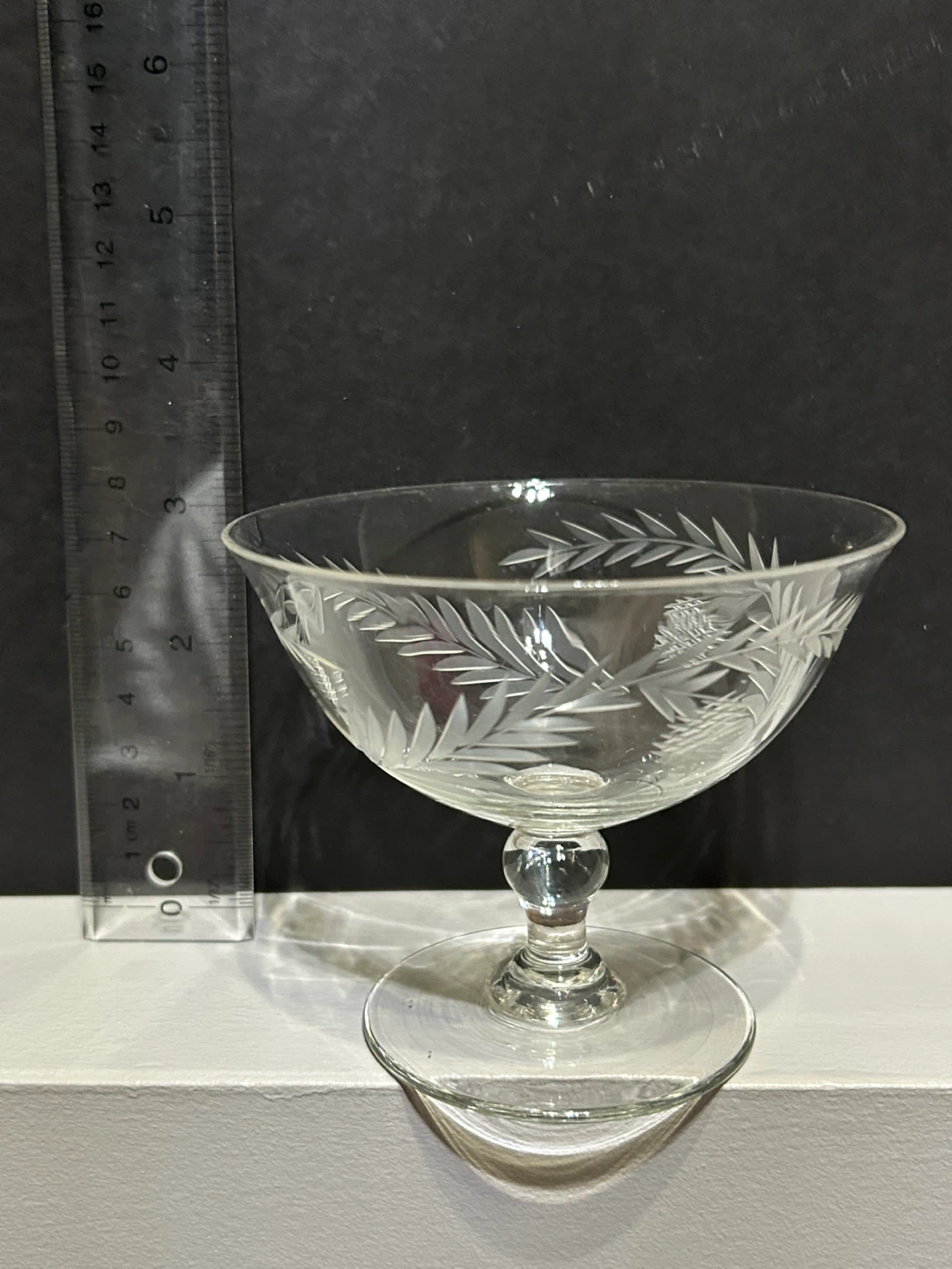 Selling a set of 11 vintage etched glass fruit nappies . These glasses have a delicate leaf pattern and would be a beautiful addition to any table setting. The glass stands approximately 3 inches tall.