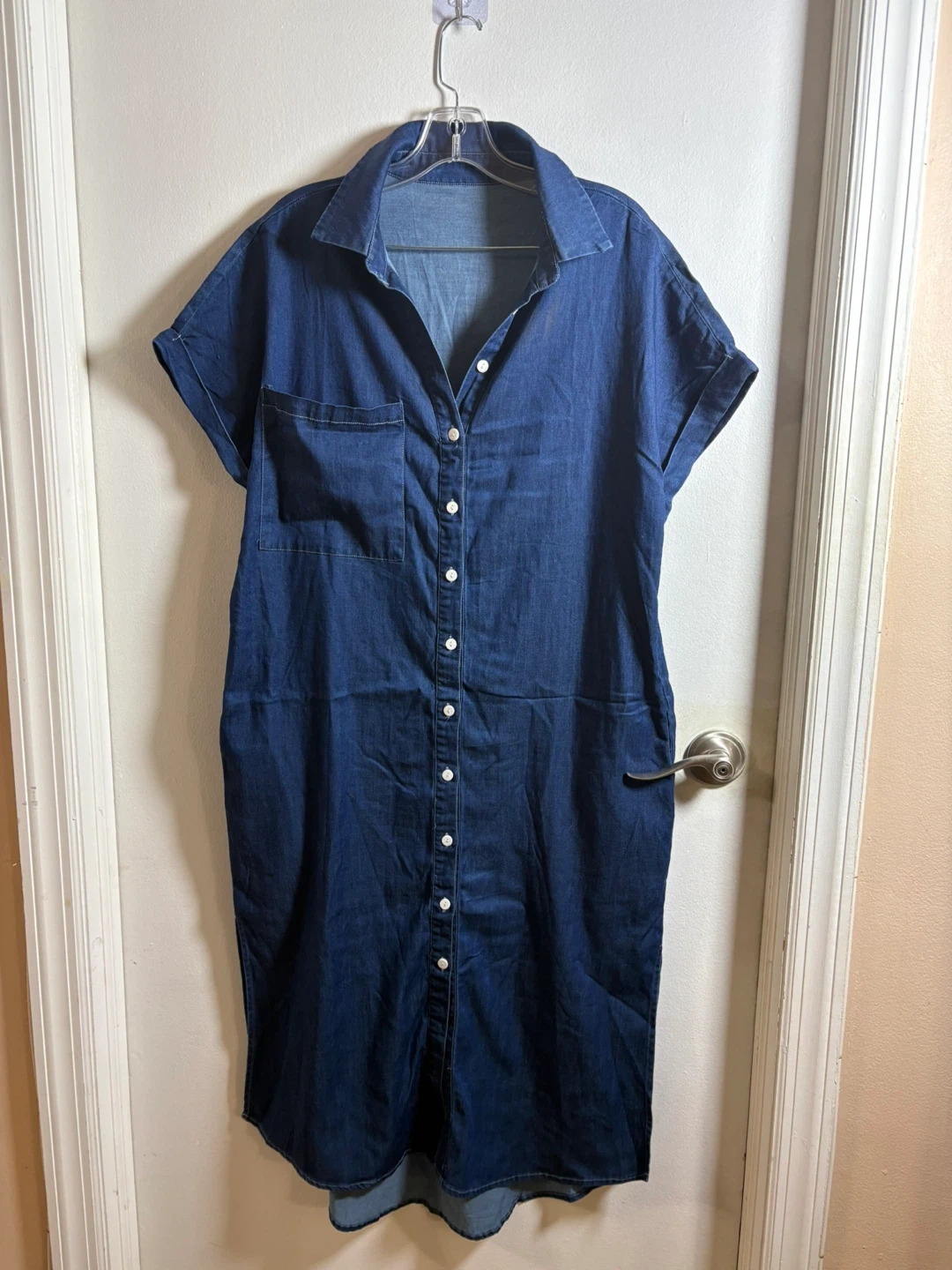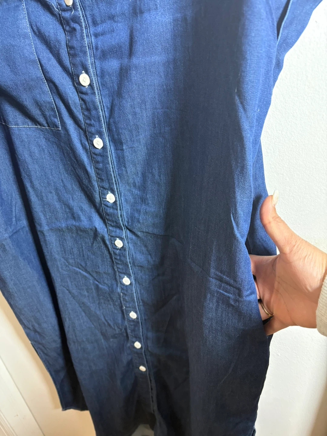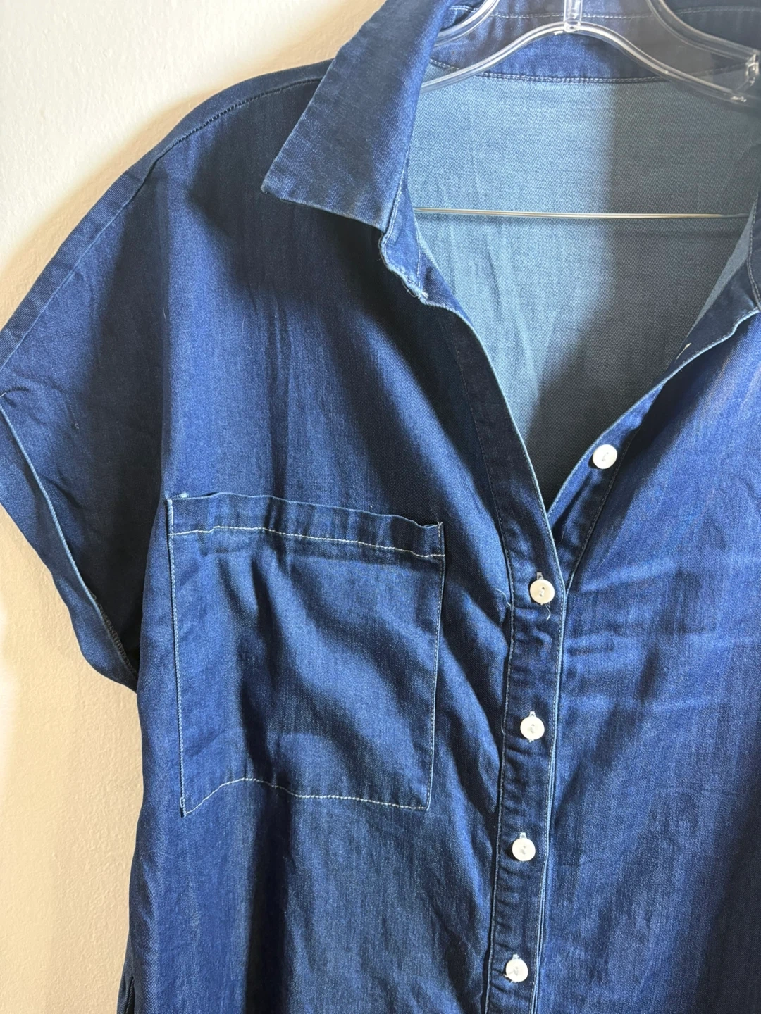 I'm selling a cute denim dress in size L. It features short sleeves, a button-down front, and a handy chest pocket. The dress has a relaxed fit and a stylish denim look. Perfect for casual outings or dressing up with accessories
