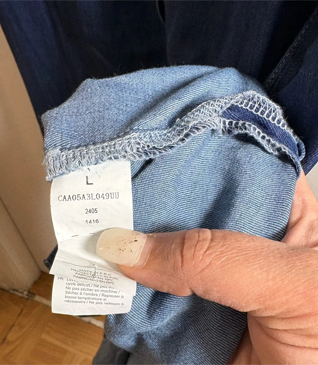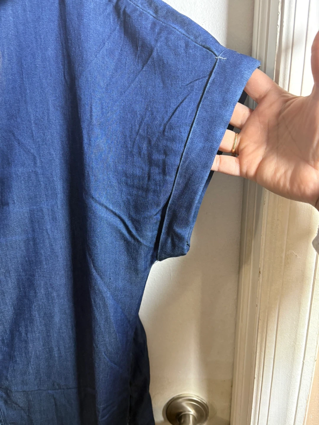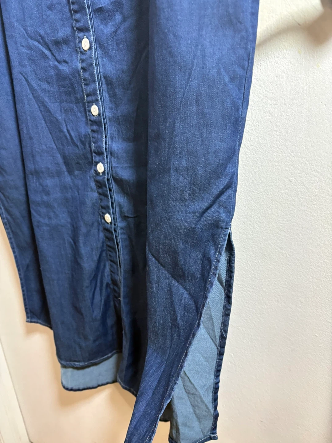I'm selling a cute denim dress in size L. It features short sleeves, a button-down front, and a handy chest pocket. The dress has a relaxed fit and a stylish denim look. Perfect for casual outings or dressing up with accessories