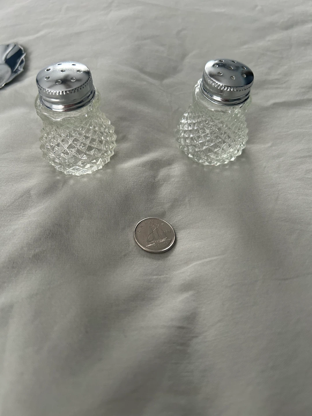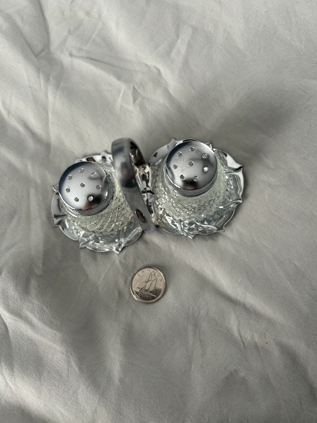 Selling a cute set of vintage salt and pepper shakers with a silver stand. They have a lovely diamond pattern on the glass and would look great on any table!