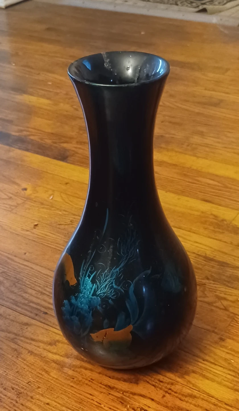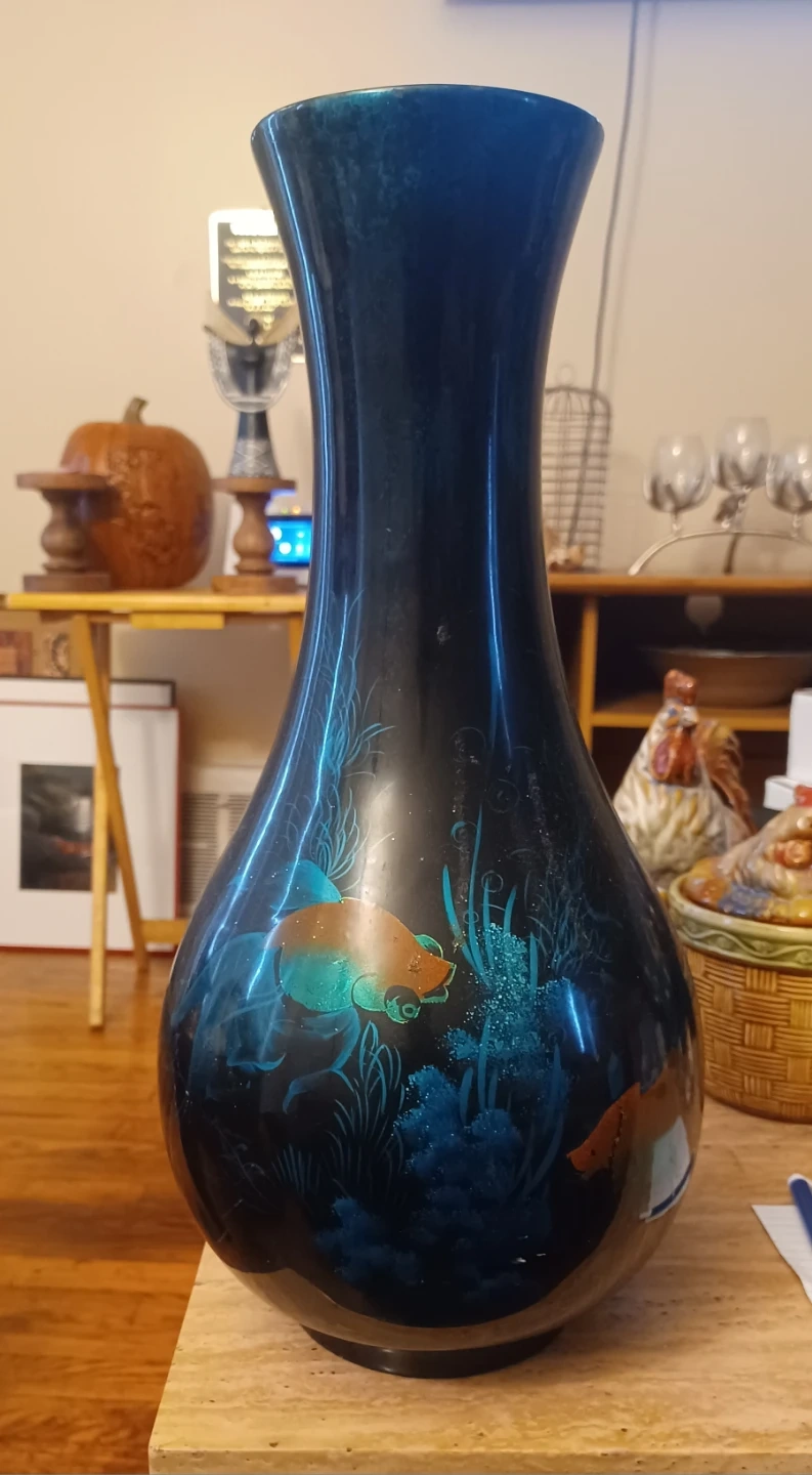 Selling a beautiful vintage black vase featuring a unique fish design. It's in great condition and would make a lovely addition to any home decor. The vase has a classic shape and the fish design adds a touch of elegance and charm. It's perfect for displaying flowers or as a standalone decorative piece