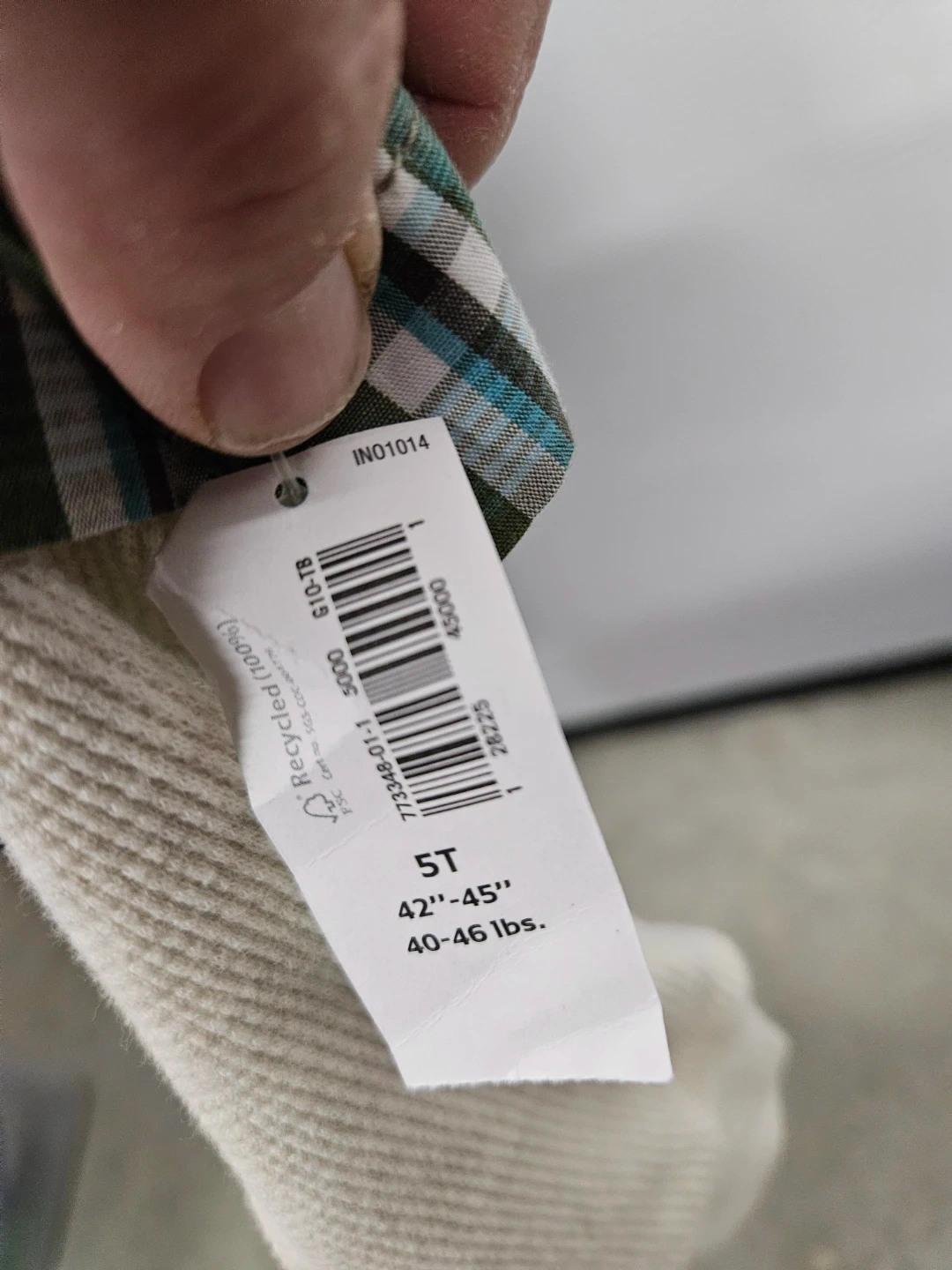 Here's a cute Old Navy plaid shirt in size 5T. It's new and giftable. The tag indicates it fits kids 42-45 inches tall and 40-46 lbs