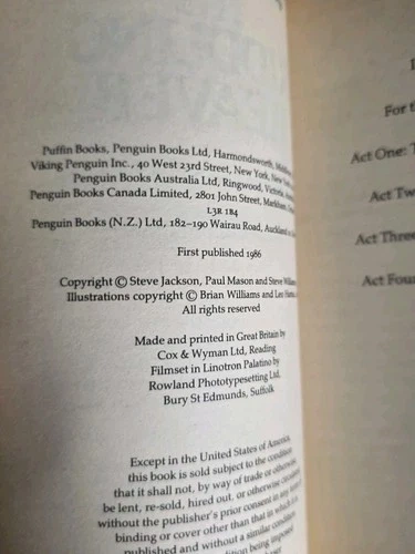The Riddling Reaver, edited by Steve Jackson, is a rare early entry in the Fighting Fantasy line. This 1986 Puffin edition is a unique campaign-style gamebook featuring four linked RPG adventures designed for a GamesMaster and group of players. Includes full rules, scenarios, illustrations, and unused adventure record sheets (shown in photos).