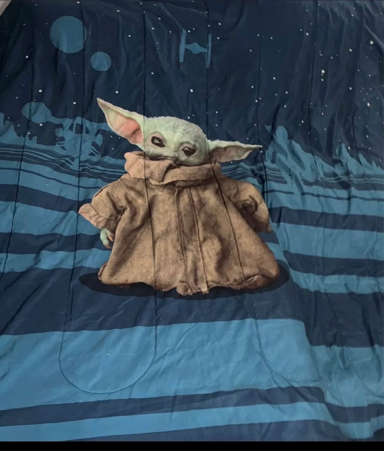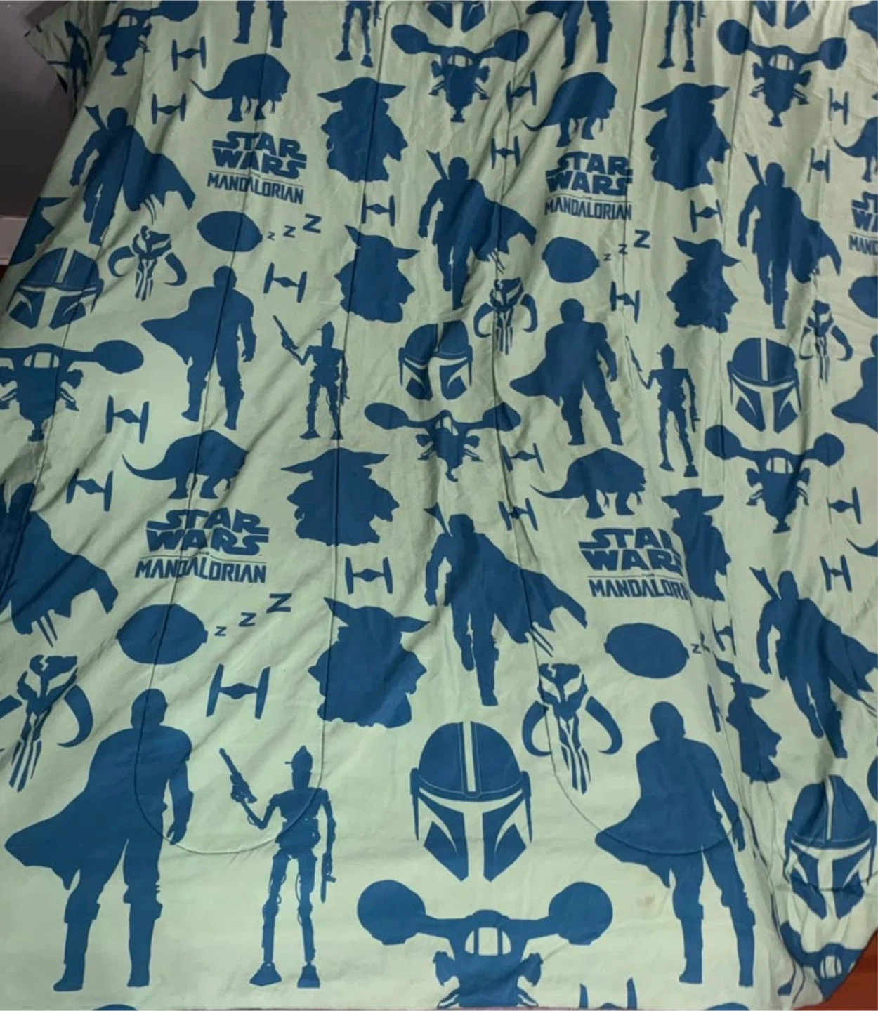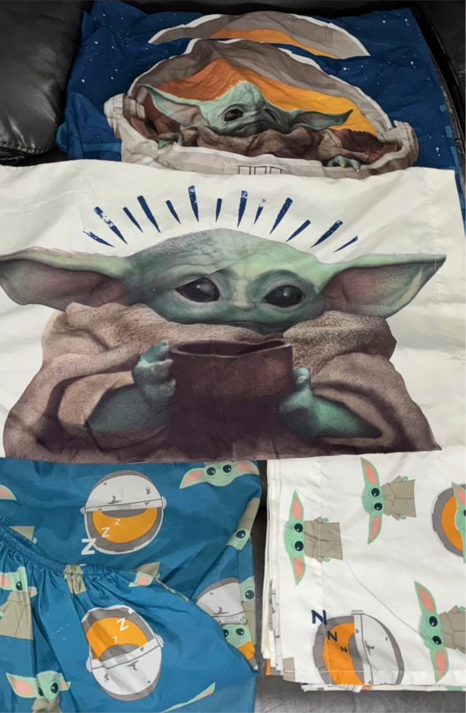 Selling a Star Wars Mandalorian bedding set featuring 'The Child' (Grogu). The set includes a twin reversible comforter, sham, flat and fitted sheets with pillow case. Perfect for a Star Wars fan's bedroom!
