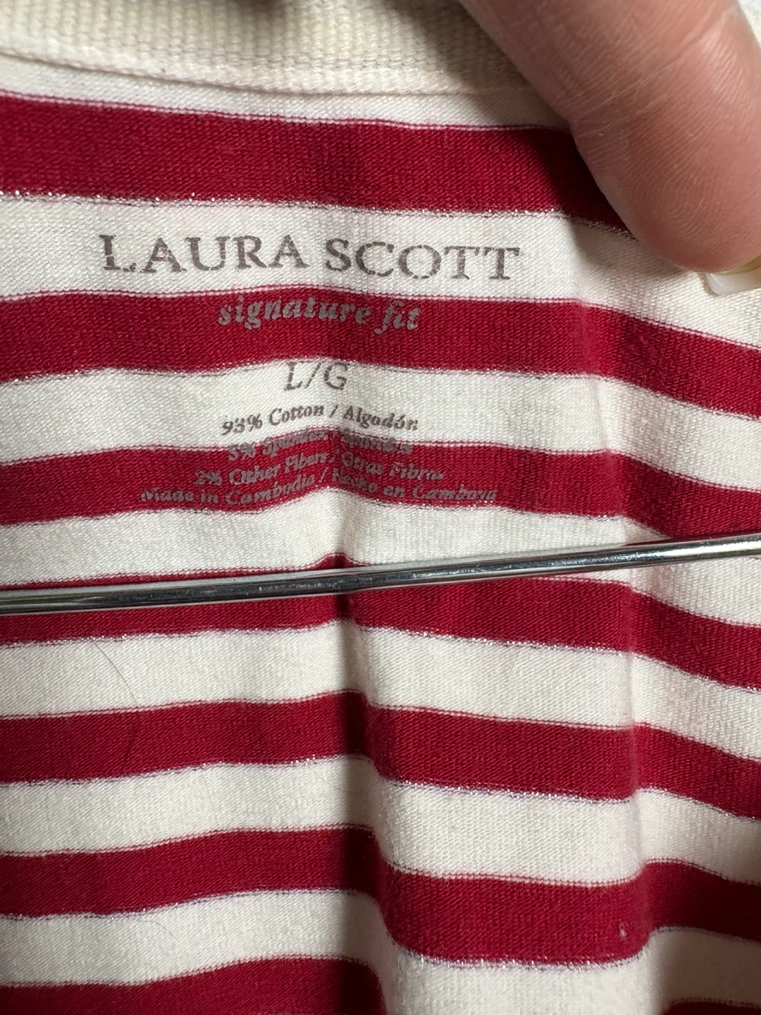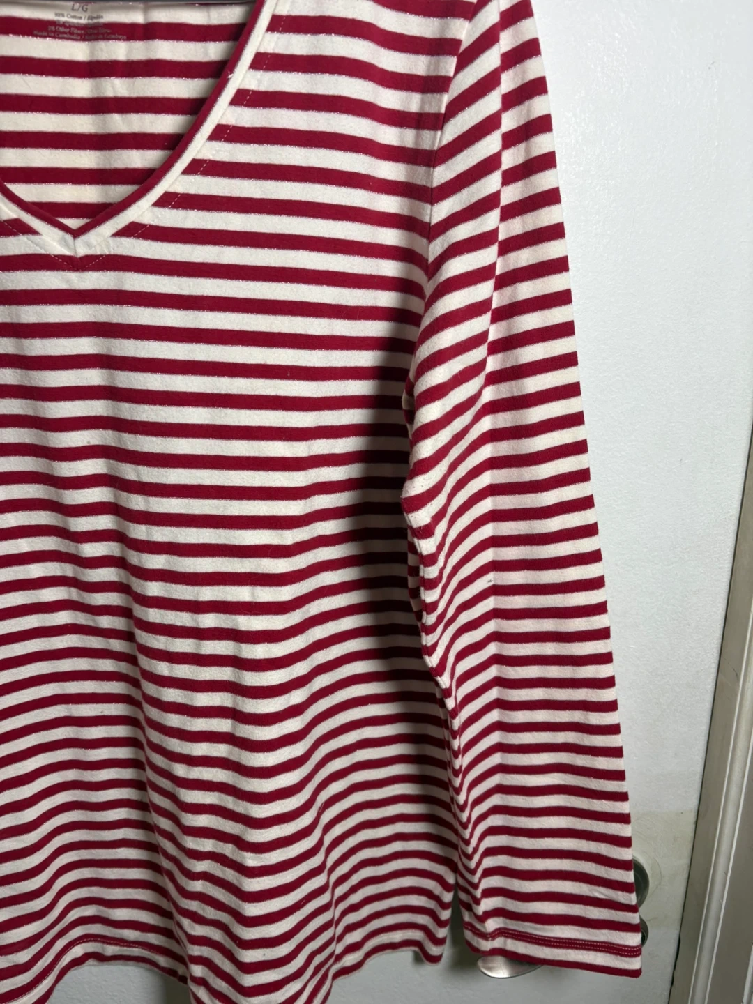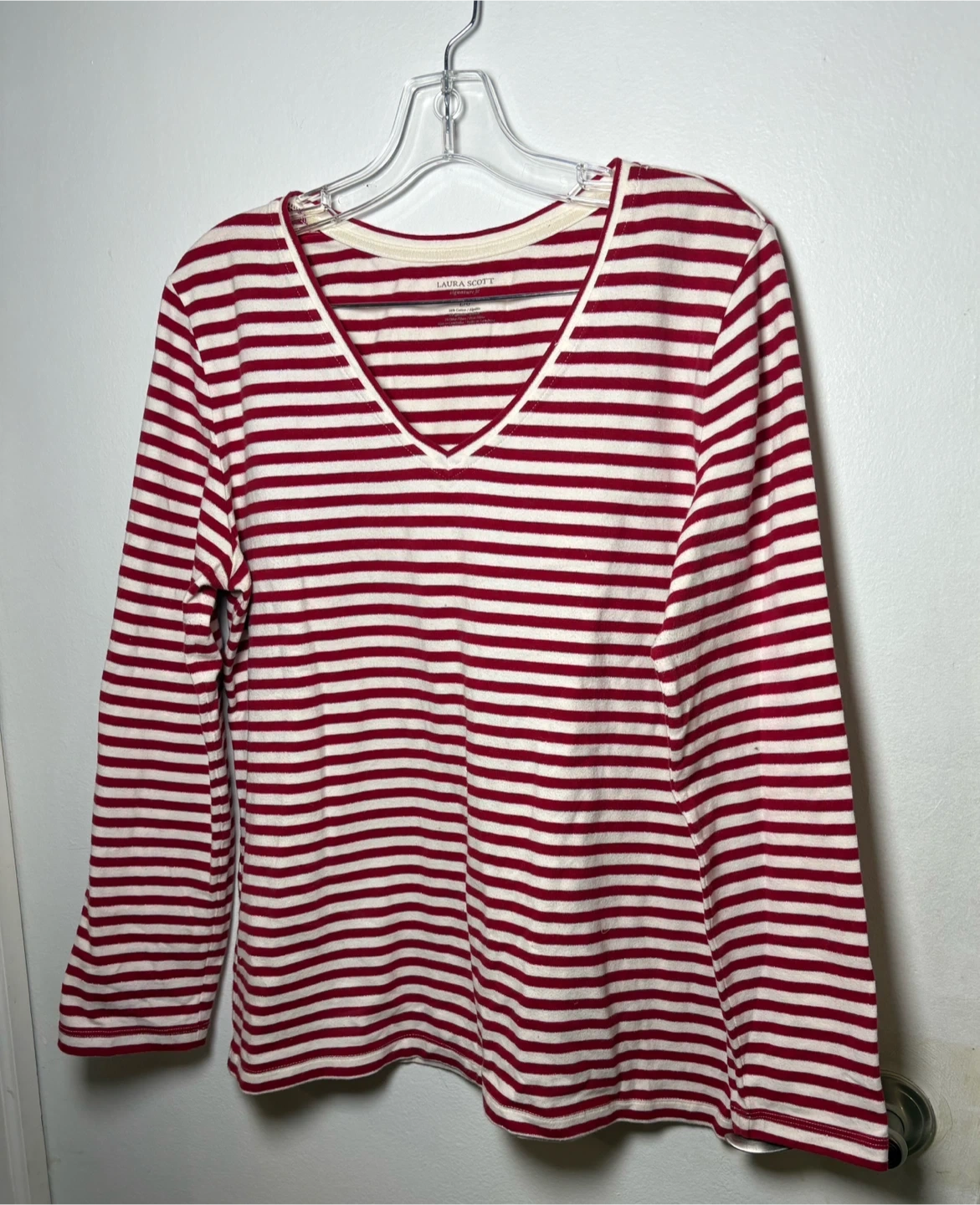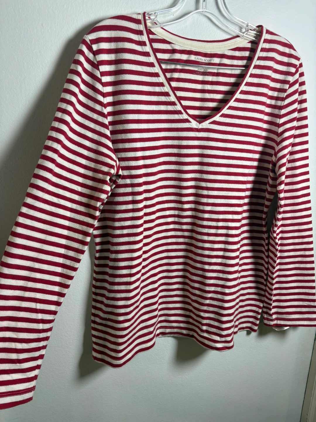 Here's a Laura Scott long-sleeve shirt in a size large. It features a red and white striped pattern and a v-neck. The material is 98% cotton and 2% other fibers.