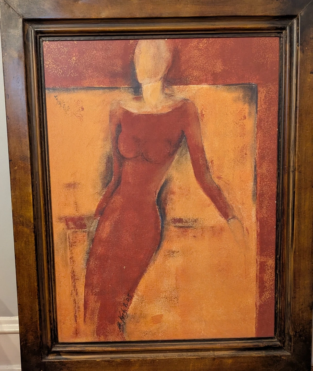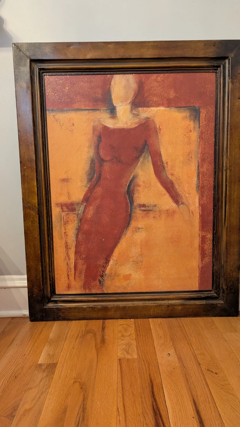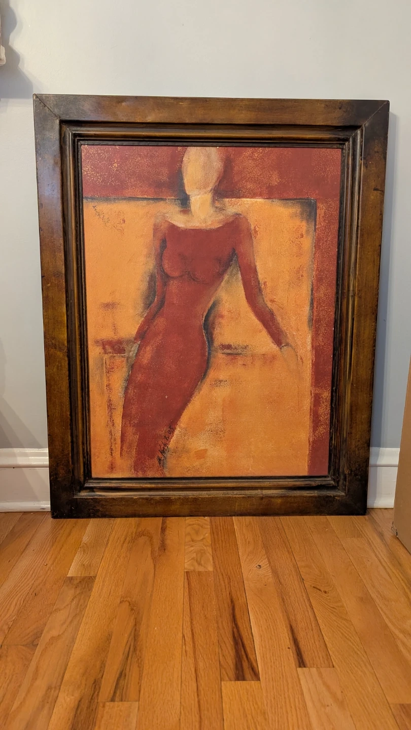 I'm selling a large, framed abstract art painting. It features a woman in shades of red and orange, reclining after a long day. Very restful. It would look great in any warm or white room!
