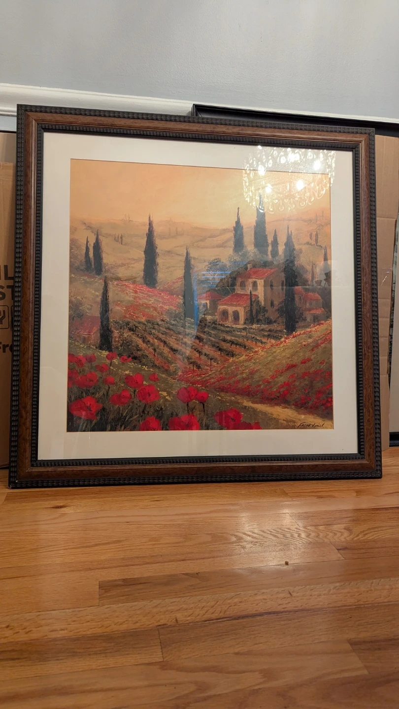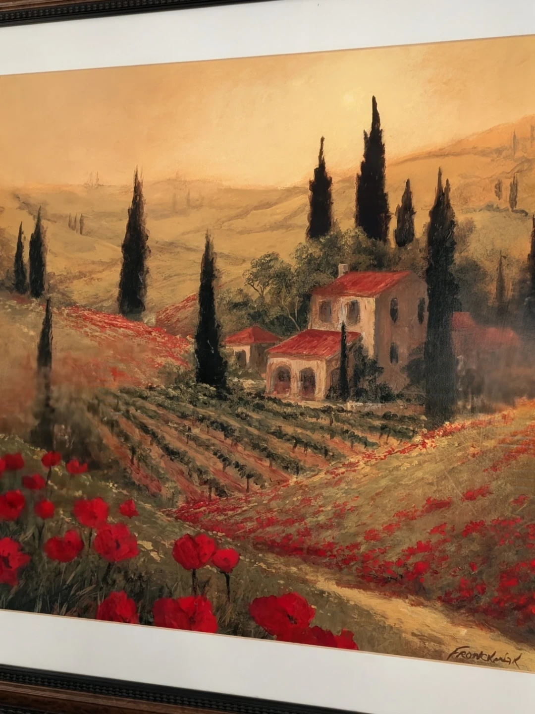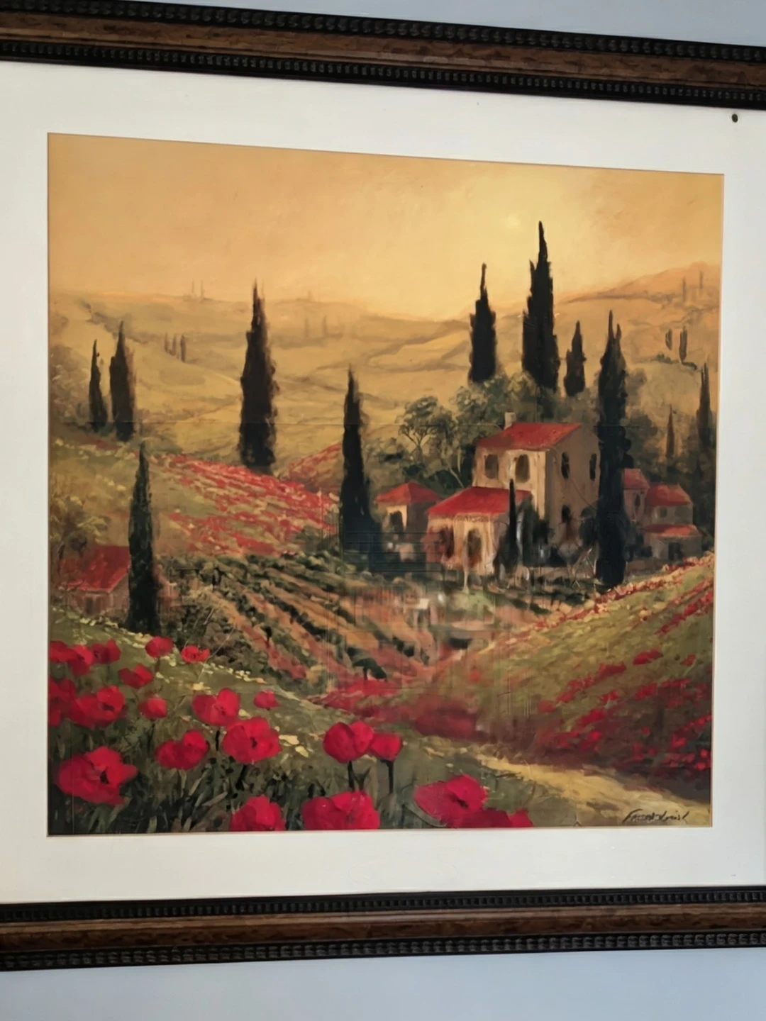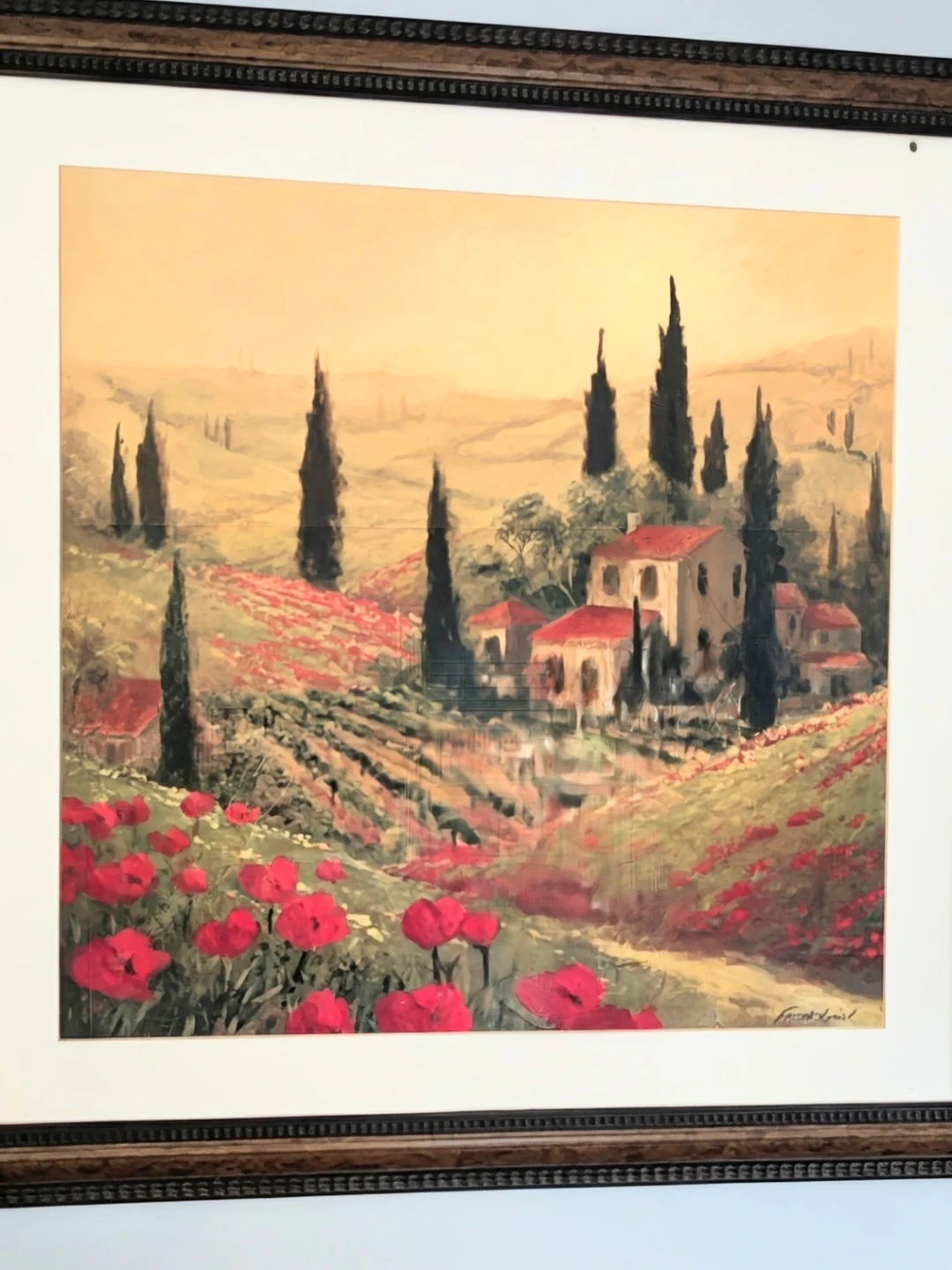 Large and Beautifully framed landscape, featuring an Italian countryside scene. It's in great condition and ready to add a touch of warmth and elegance to your home. Perfect for warm colors.