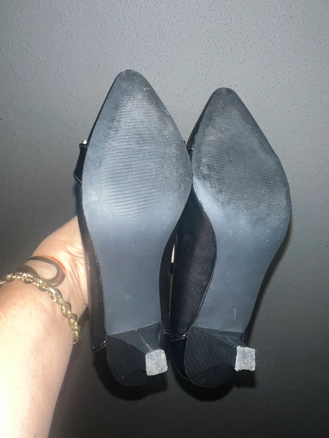 Selling a pair of Alia black heels. They have a stylish design with gold-tone hardware. These heels are perfect for adding a touch of elegance to any outfit. They show some signs of wear but still look great