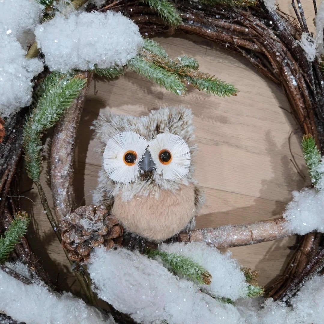 Here's a cute winter wreath featuring a little owl! It's perfect for adding a touch of cozy charm to your home during the colder months. The wreath is decorated with faux snow, pine sprigs, and pinecones, creating a festive and welcoming display