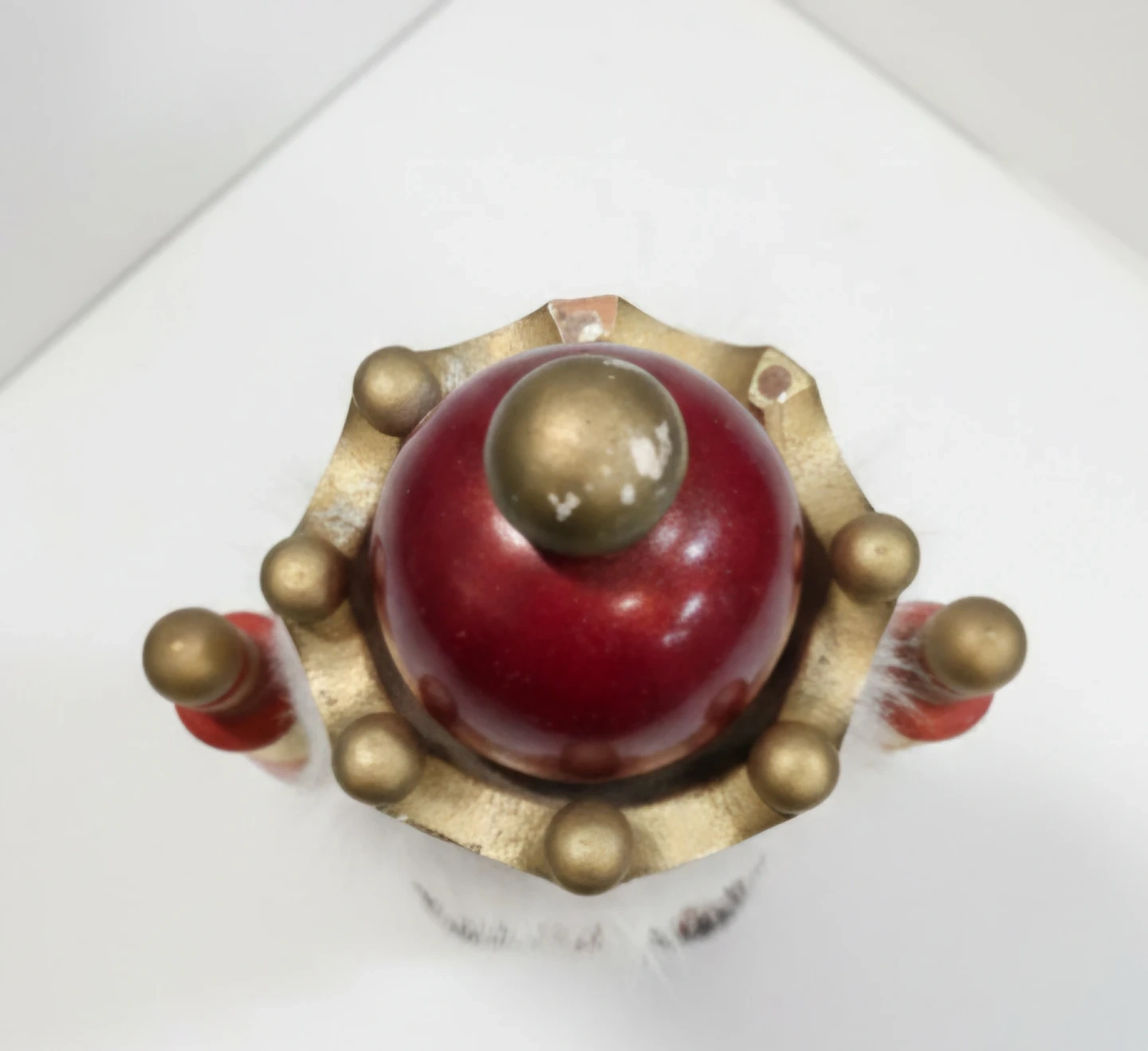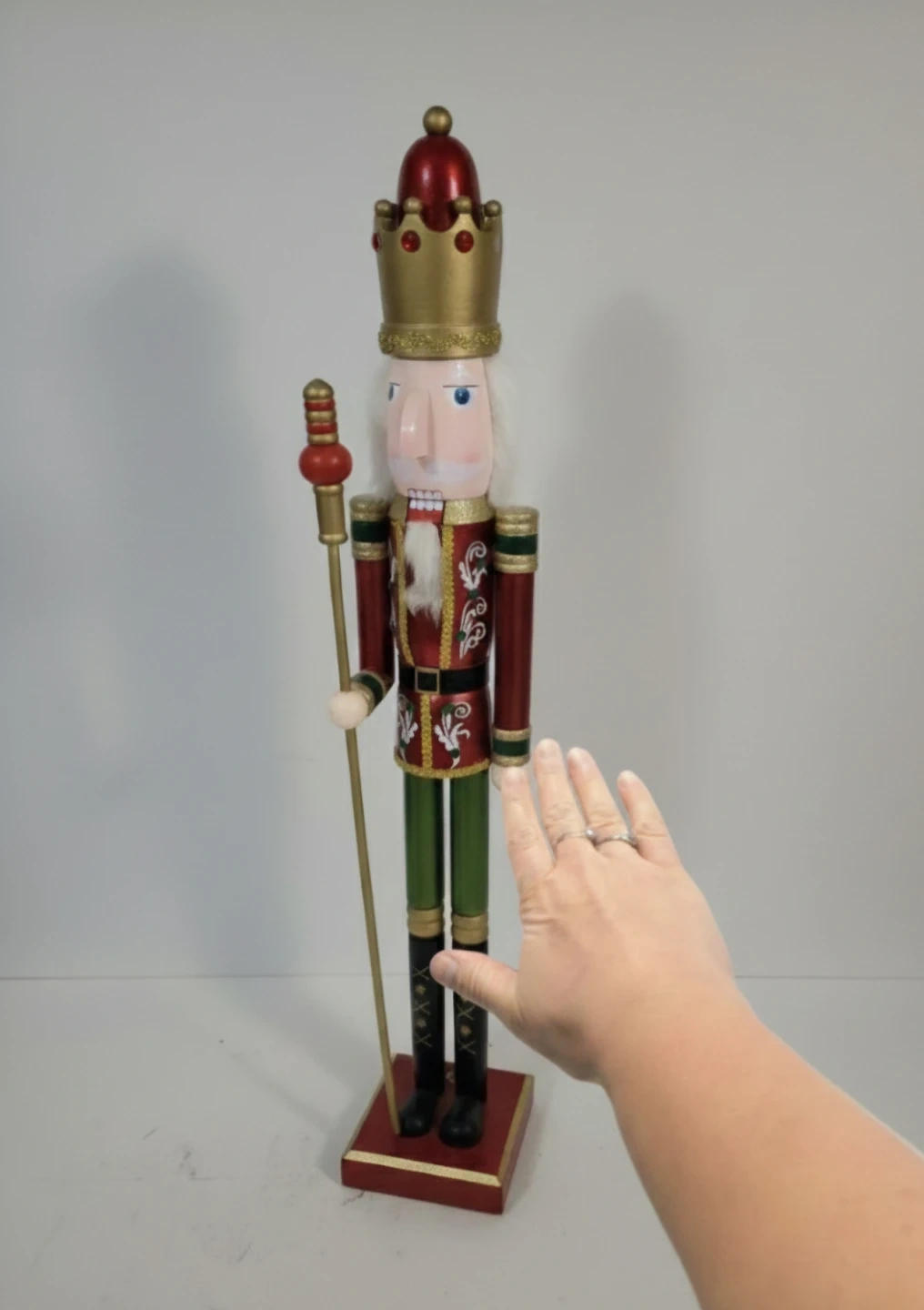 Here's a decorative nutcracker figurine. It has a red and gold crown, a white beard, and is holding a scepter. It would make a great addition to your holiday decorations! Small wear and tear. See images