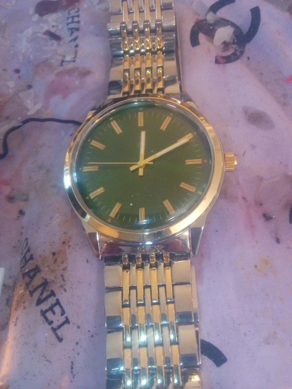 Selling a stylish watch with a unique color combination! It features a gold and silver tone band and a striking green face. The watch is in good condition and ready to wear