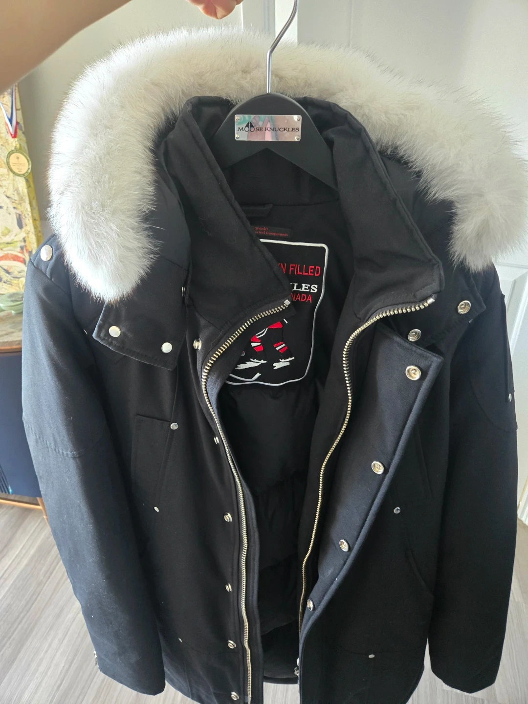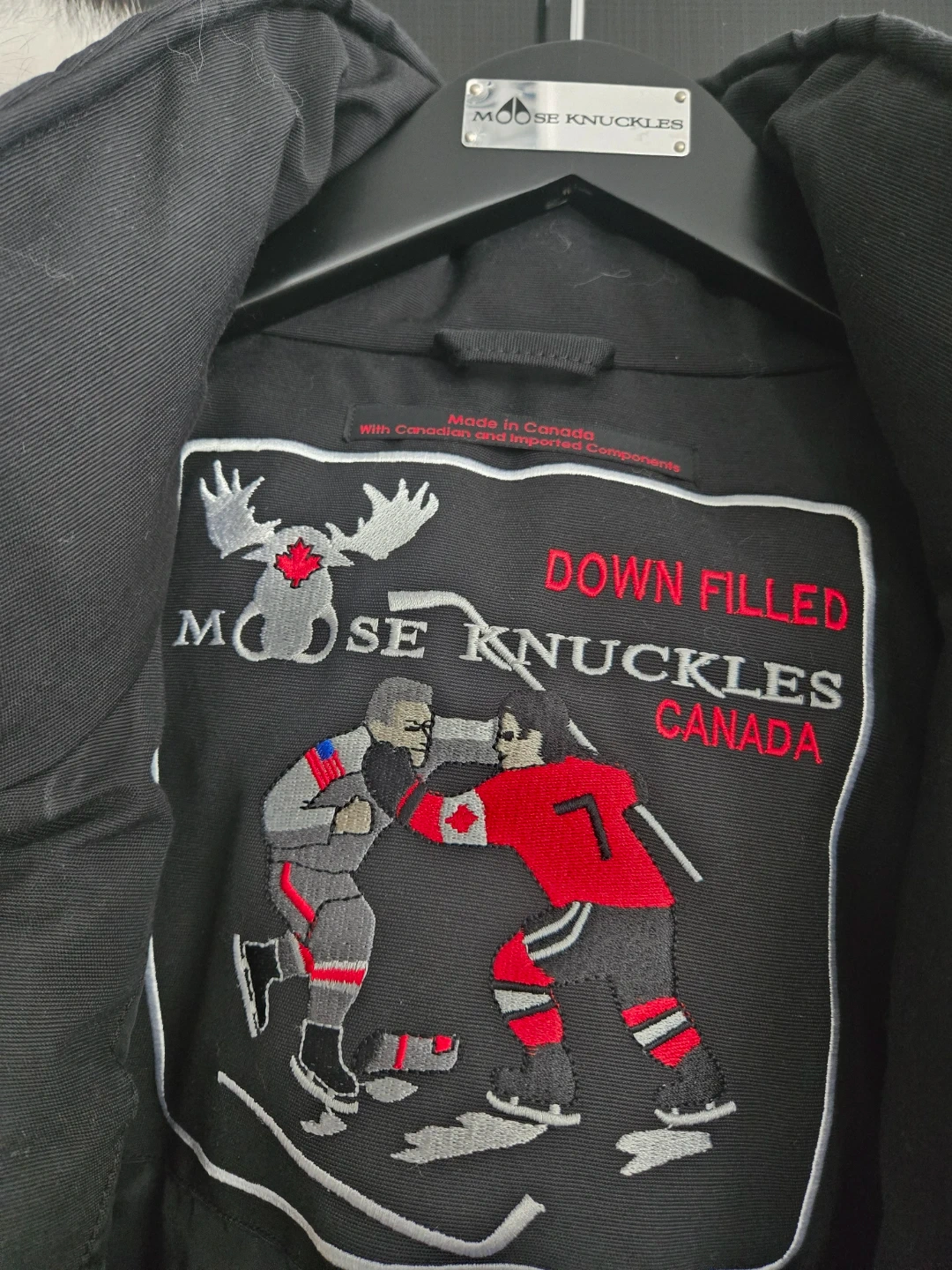 Selling a Moose Knuckles winter jacket in black, size medium. It's in great condition and ready for the cold weather! The patch is also in matte black. Originally purchased from a department store in South Korea.