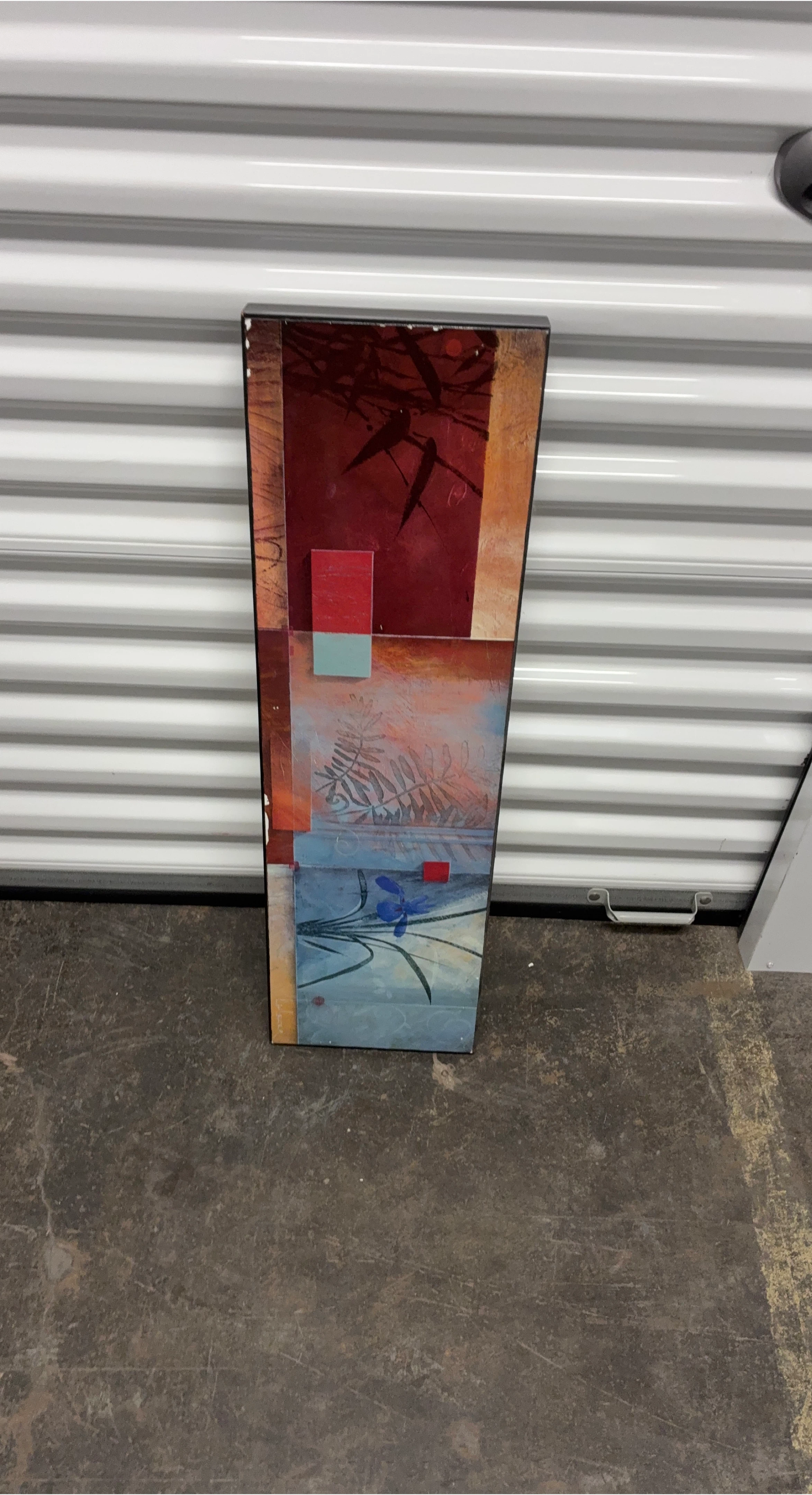 This is an abstract art print on wood. It features a mix of red, blue, and orange tones. The print is framed with a dark brown or black border. Perfect for adding a touch of modern art to your space